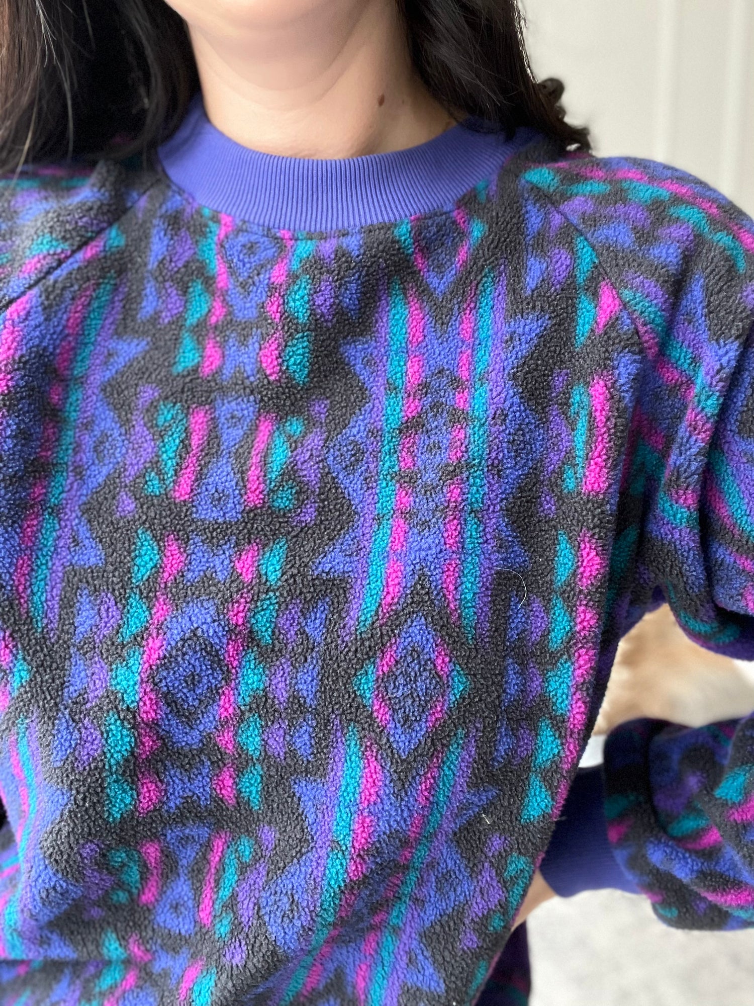A unique fleece crewneck sweater with pops of purple, pink and blues. The perfect pullover to keep you cozy and stylish on cool summer nights. This vintage fleece is in excellent condition! Ribbed at neckline, cuffs and hem.
