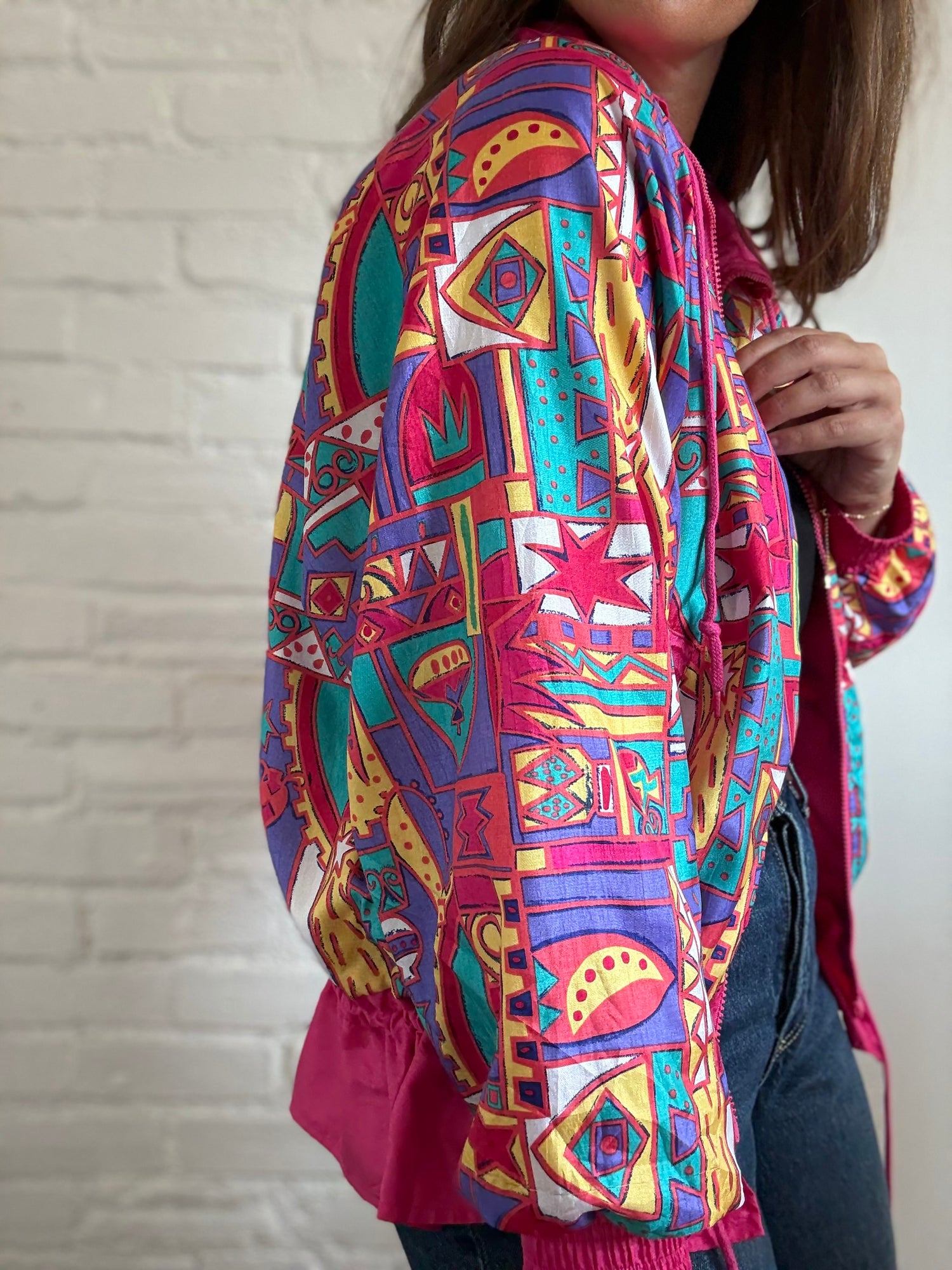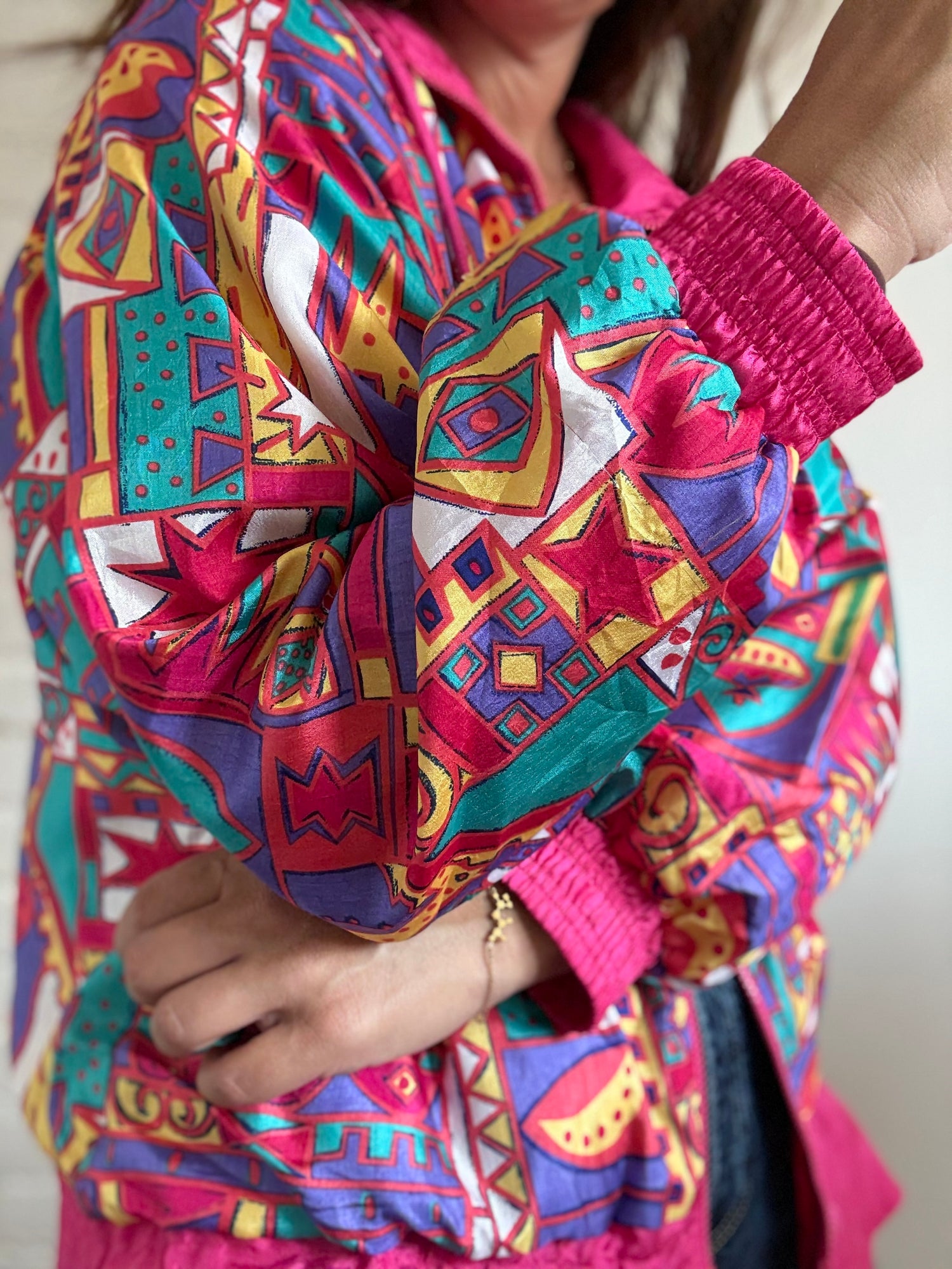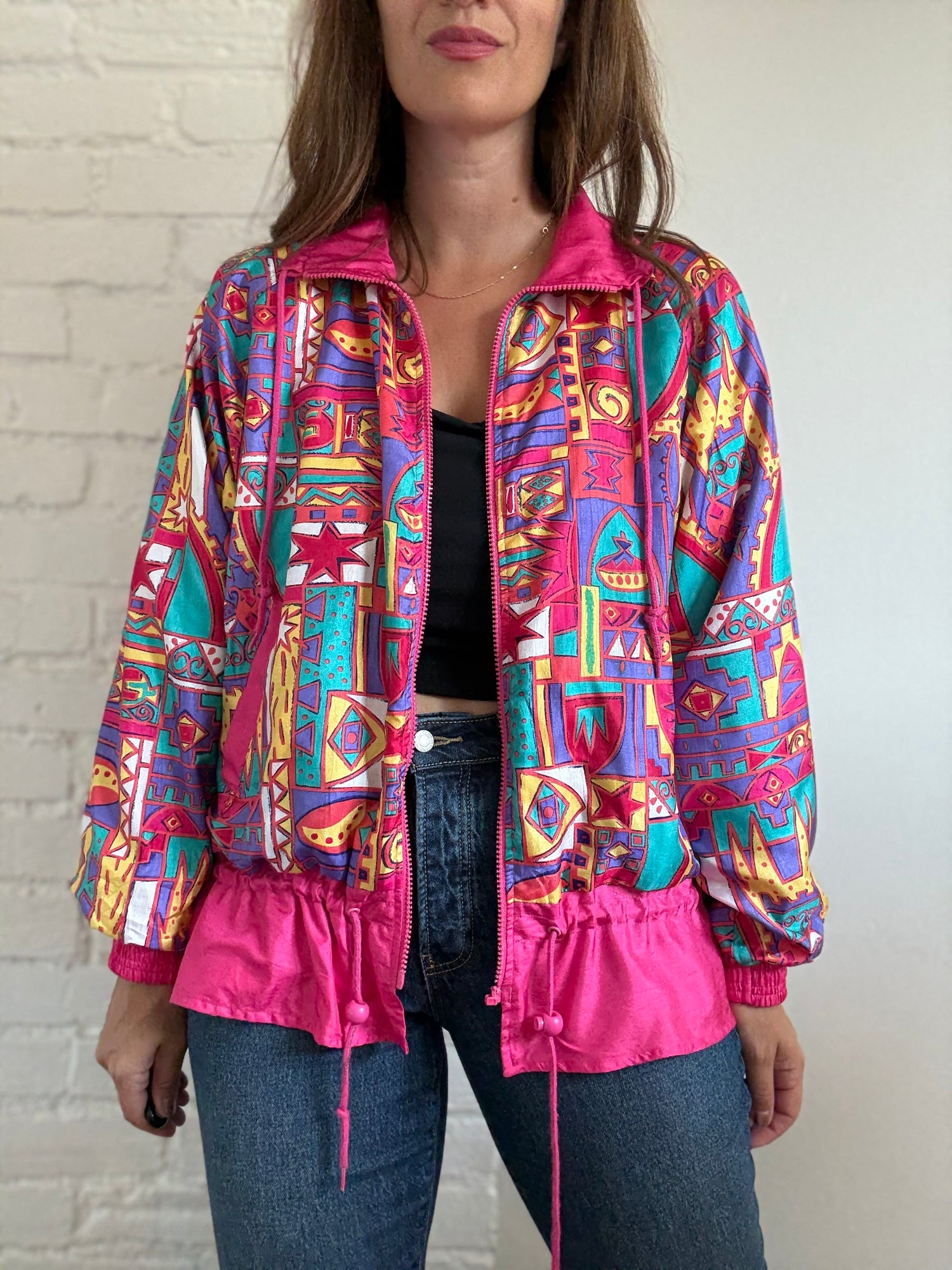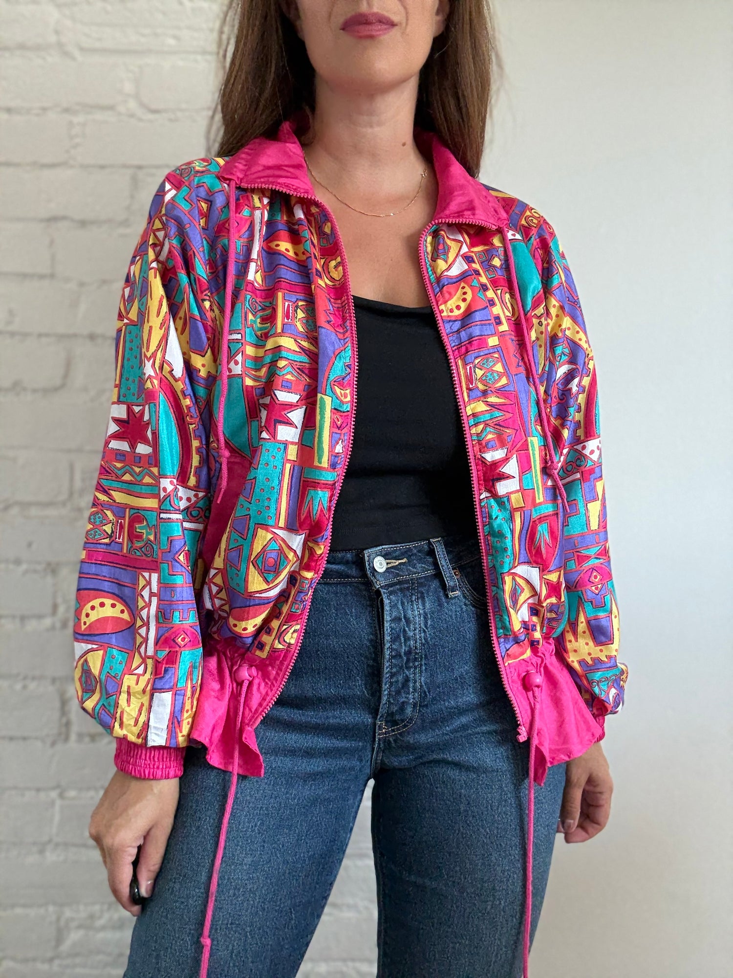 She's bold, she's bright - she's pop-tacular. A 90s retro windbreaker jacket with bold colours, with an eclectic geometric vibe. From triangles to squiggles to stars - she has it all. Drawstring at collar, and above hem to style in a bunch or boxy fit. Elasticized wrists, and lined with a cotton interior for comfort.