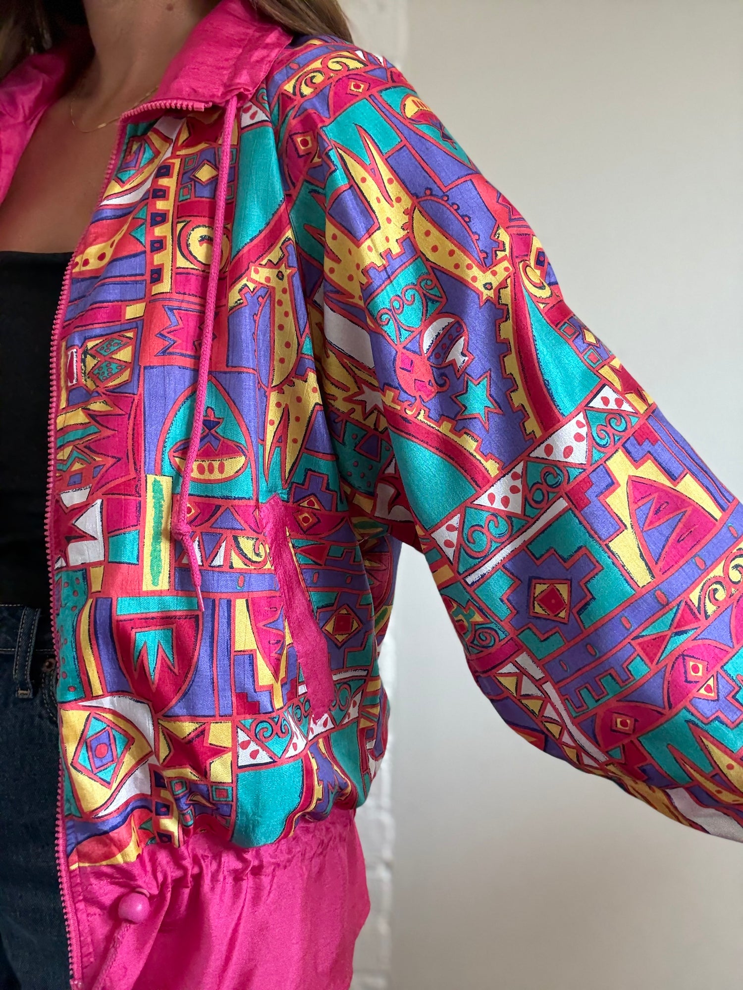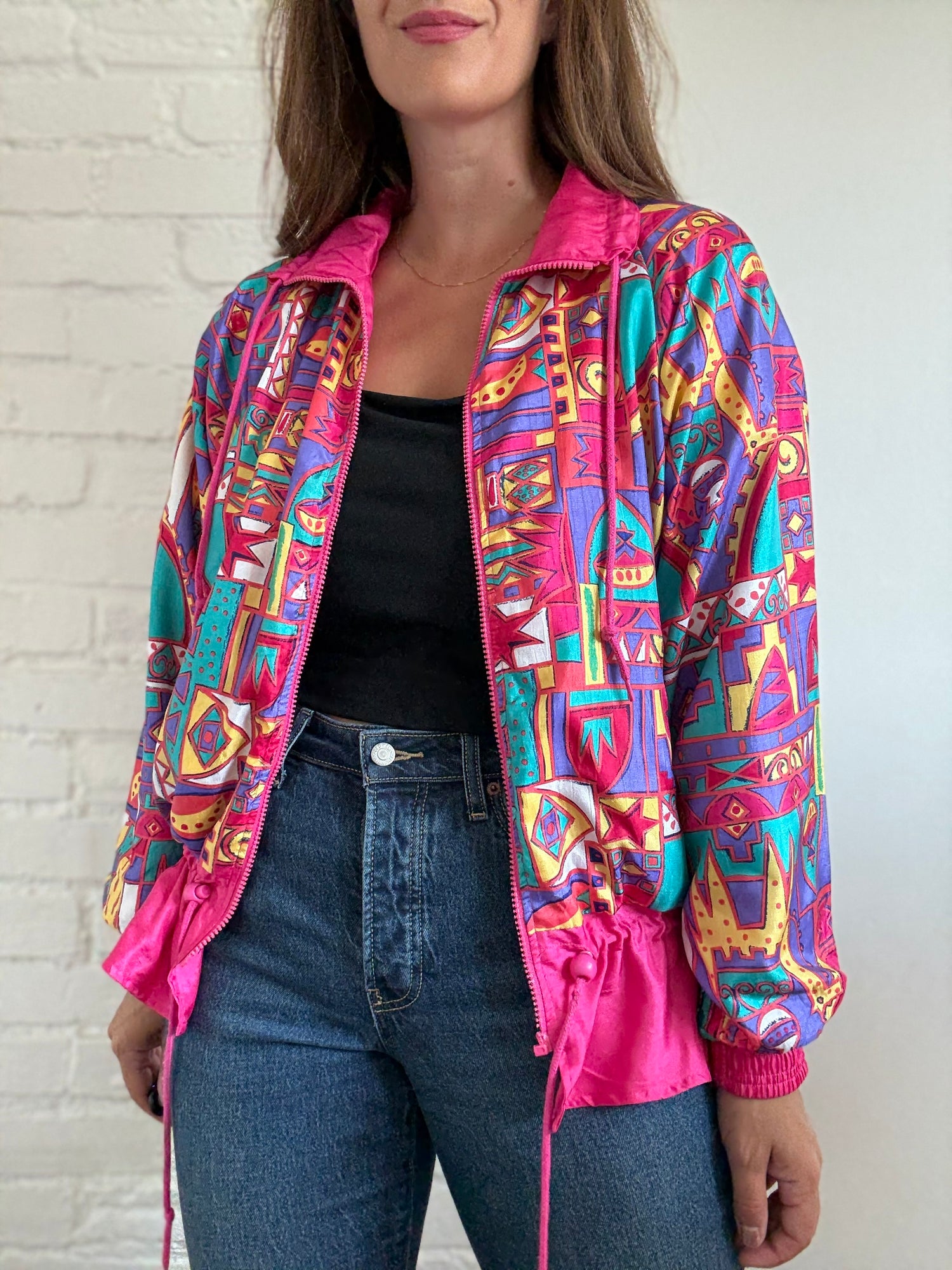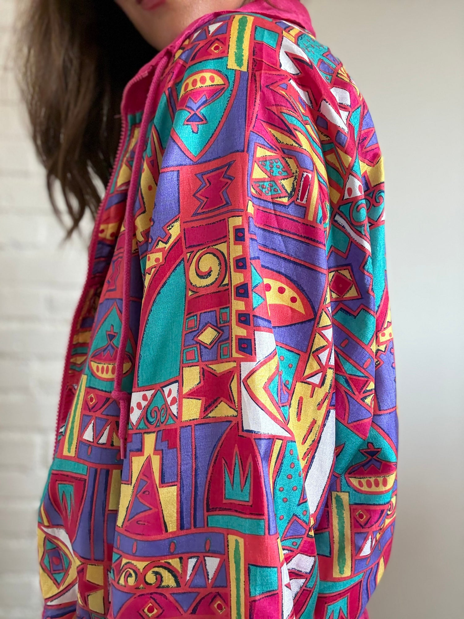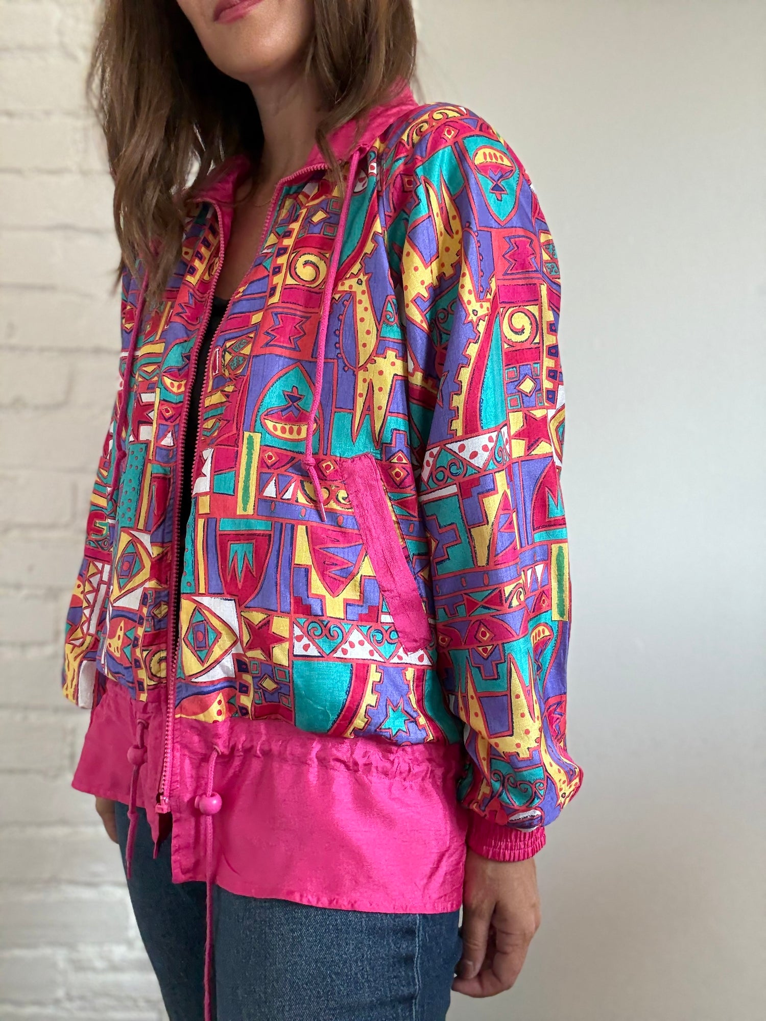 She's bold, she's bright - she's pop-tacular. A 90s retro windbreaker jacket with bold colours, with an eclectic geometric vibe. From triangles to squiggles to stars - she has it all. Drawstring at collar, and above hem to style in a bunch or boxy fit. Elasticized wrists, and lined with a cotton interior for comfort.