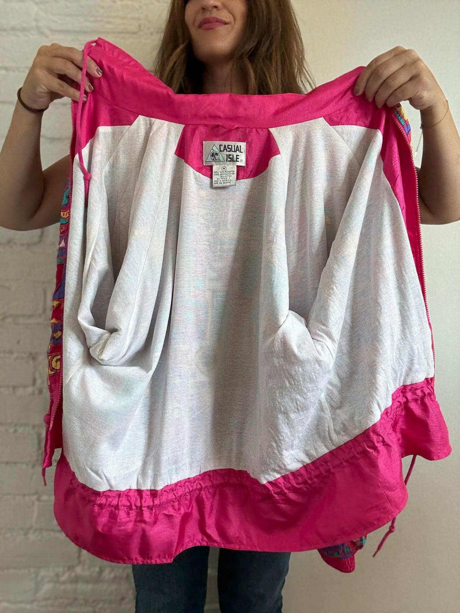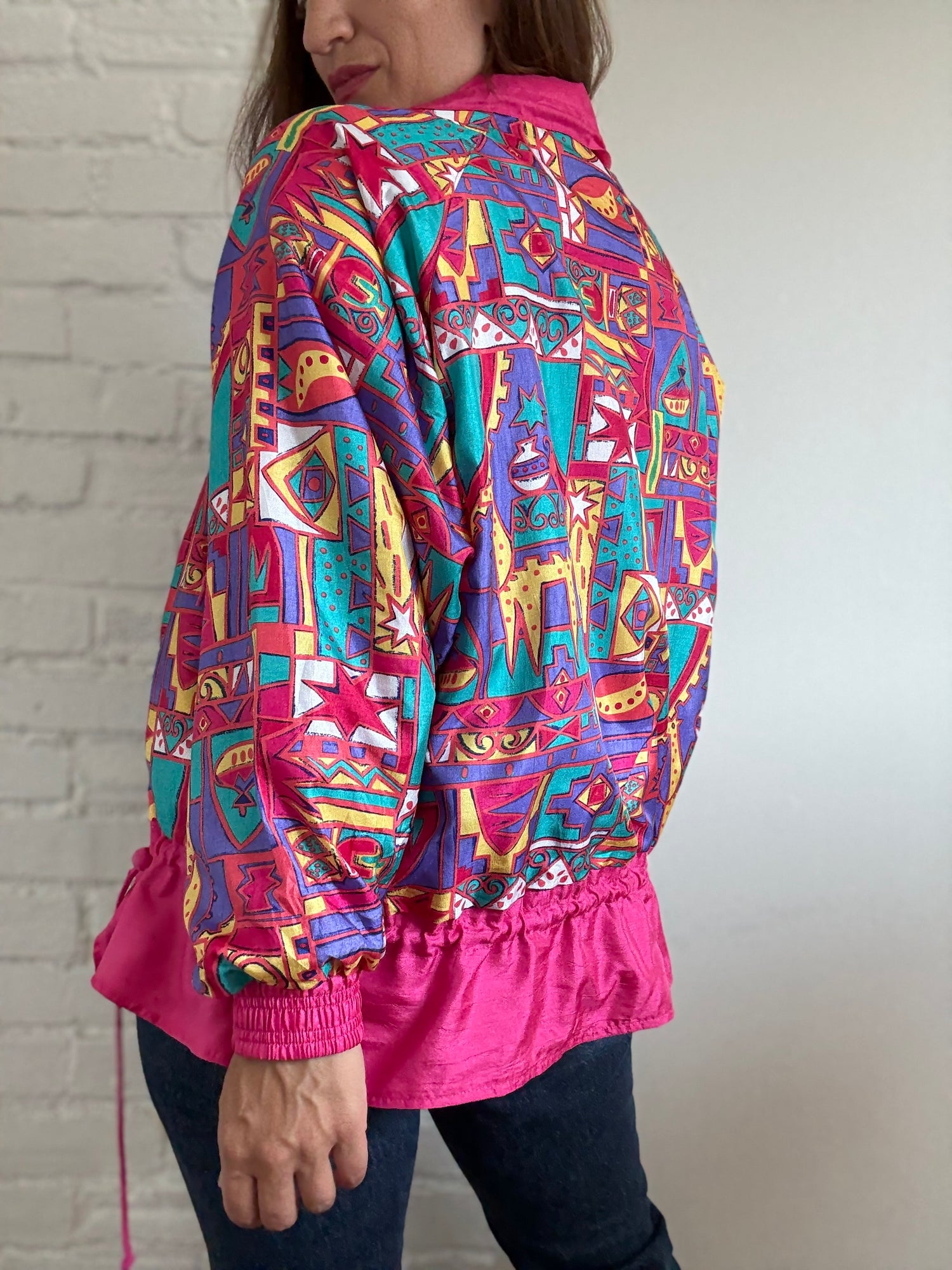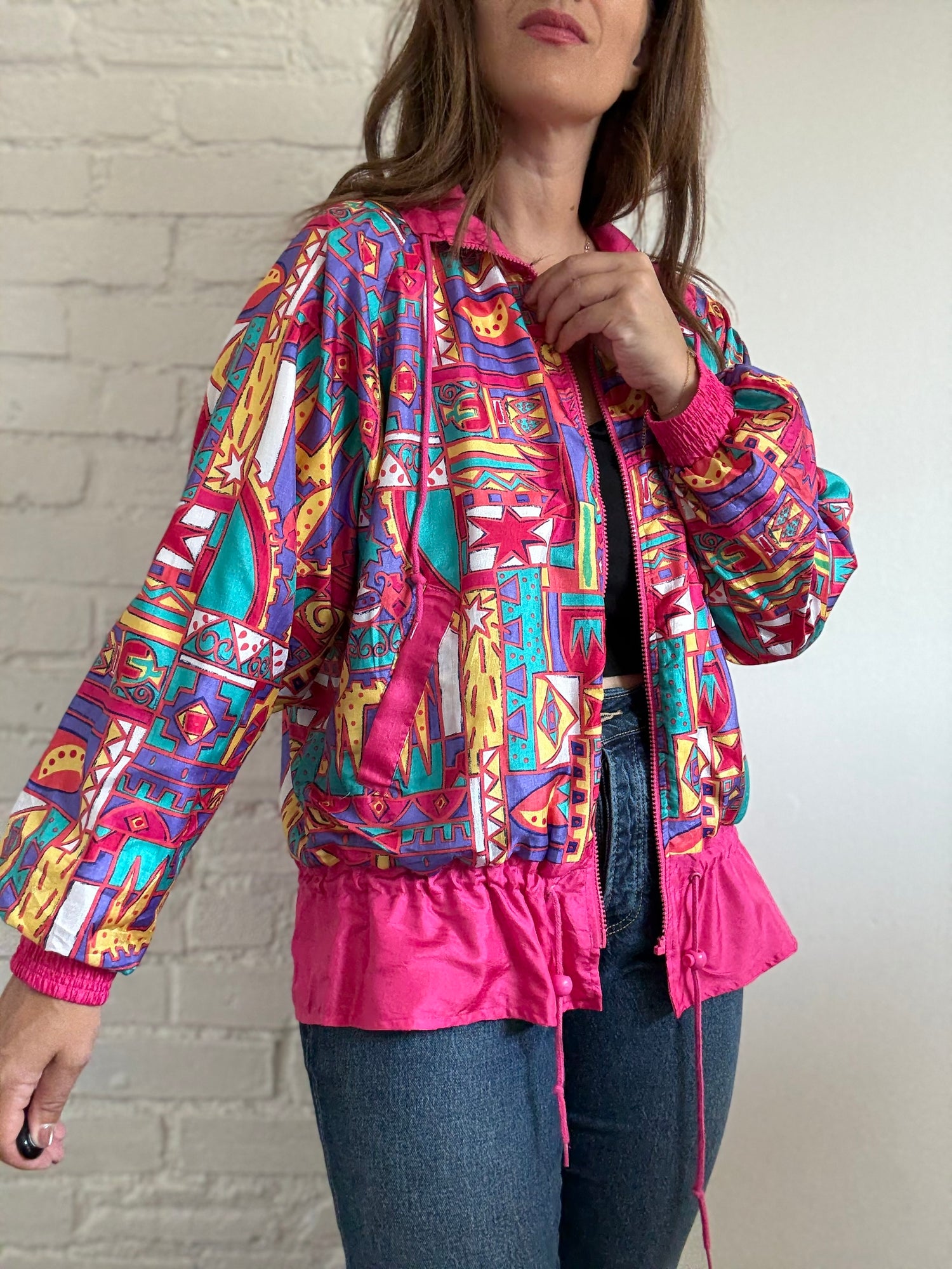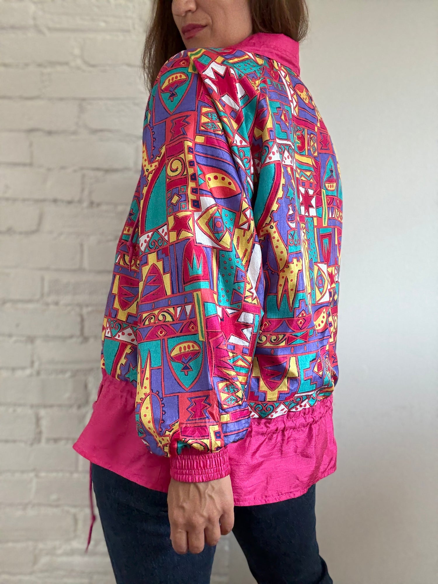 She's bold, she's bright - she's pop-tacular. A 90s retro windbreaker jacket with bold colours, with an eclectic geometric vibe. From triangles to squiggles to stars - she has it all. Drawstring at collar, and above hem to style in a bunch or boxy fit. Elasticized wrists, and lined with a cotton interior for comfort.