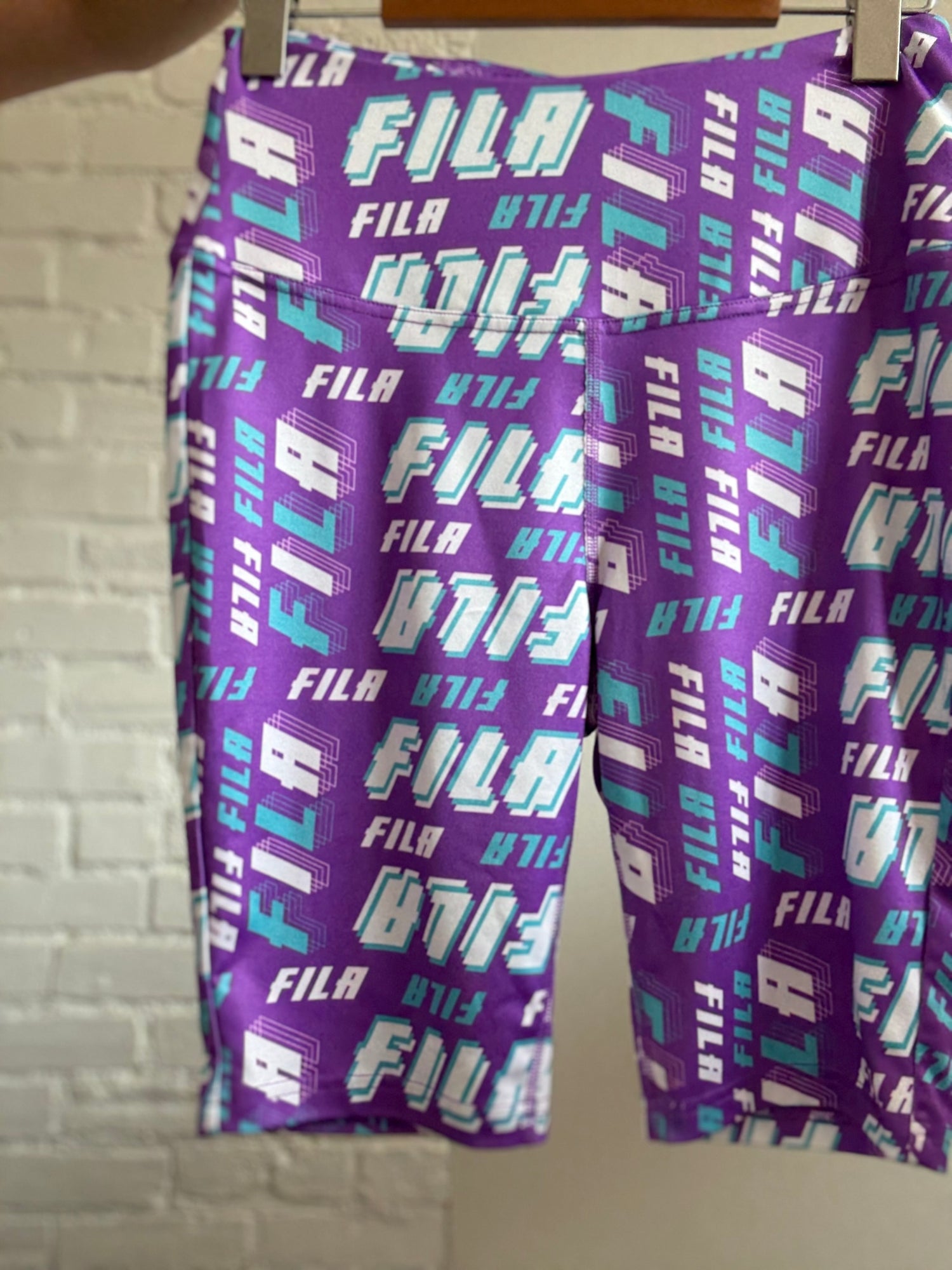 If you're rocking biker shorts, time to make them retro-inspired. A modern short with a vintage print - these are a FILA biker short with bold colours. Stretchy, and perfect for errands or hitting the gym. High waist, like brand new condition.
