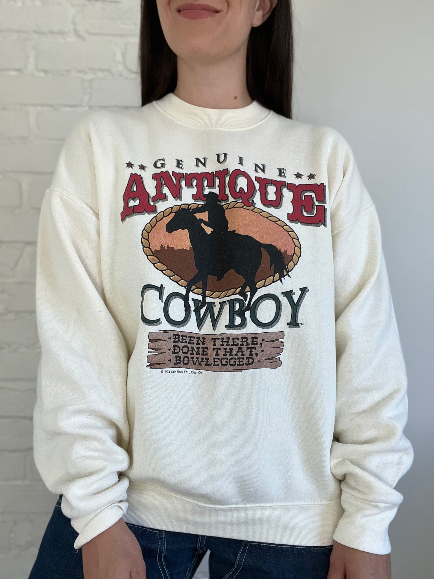 This one is for my antique lovers, and treasure hunters. A super rare, 1994 Laid Back Entertainment crewneck sweater that reads Genuine Antique Cowboy. Been There. Done That. Bowlegged. On the back of the sweater, it reads Genuine Antique Person "Classic" One of a Kind. Cream coloured and mint condition. Yeehaw! *Tagged an XL, but fits like a L/XL.