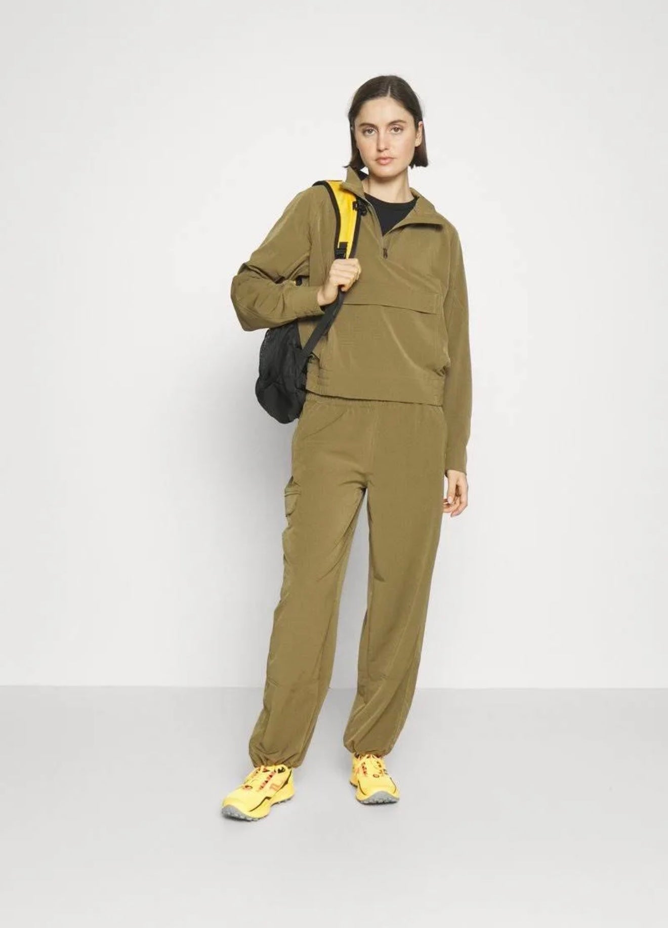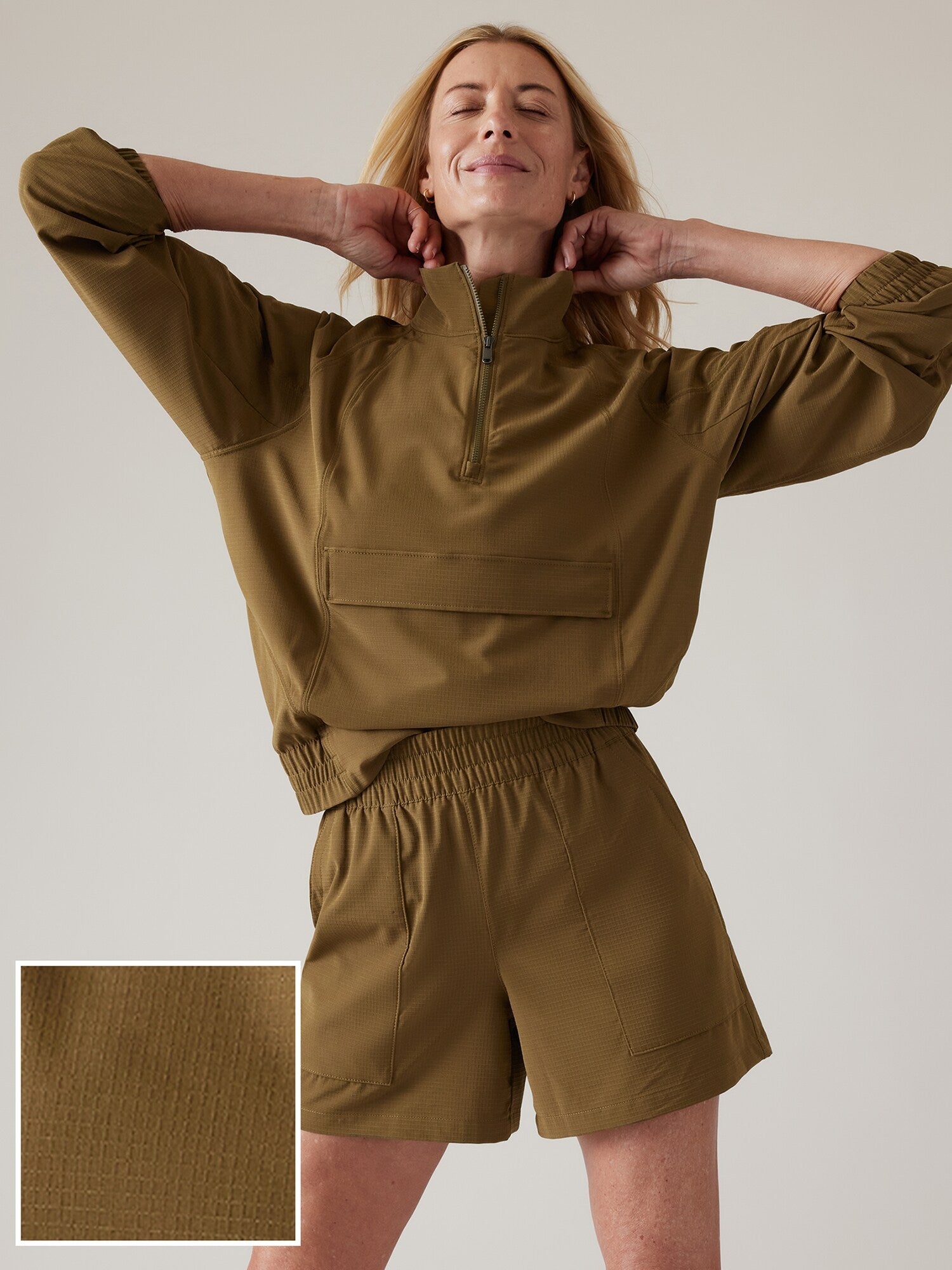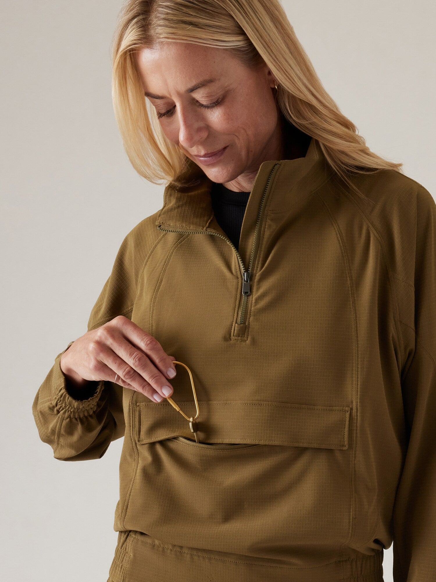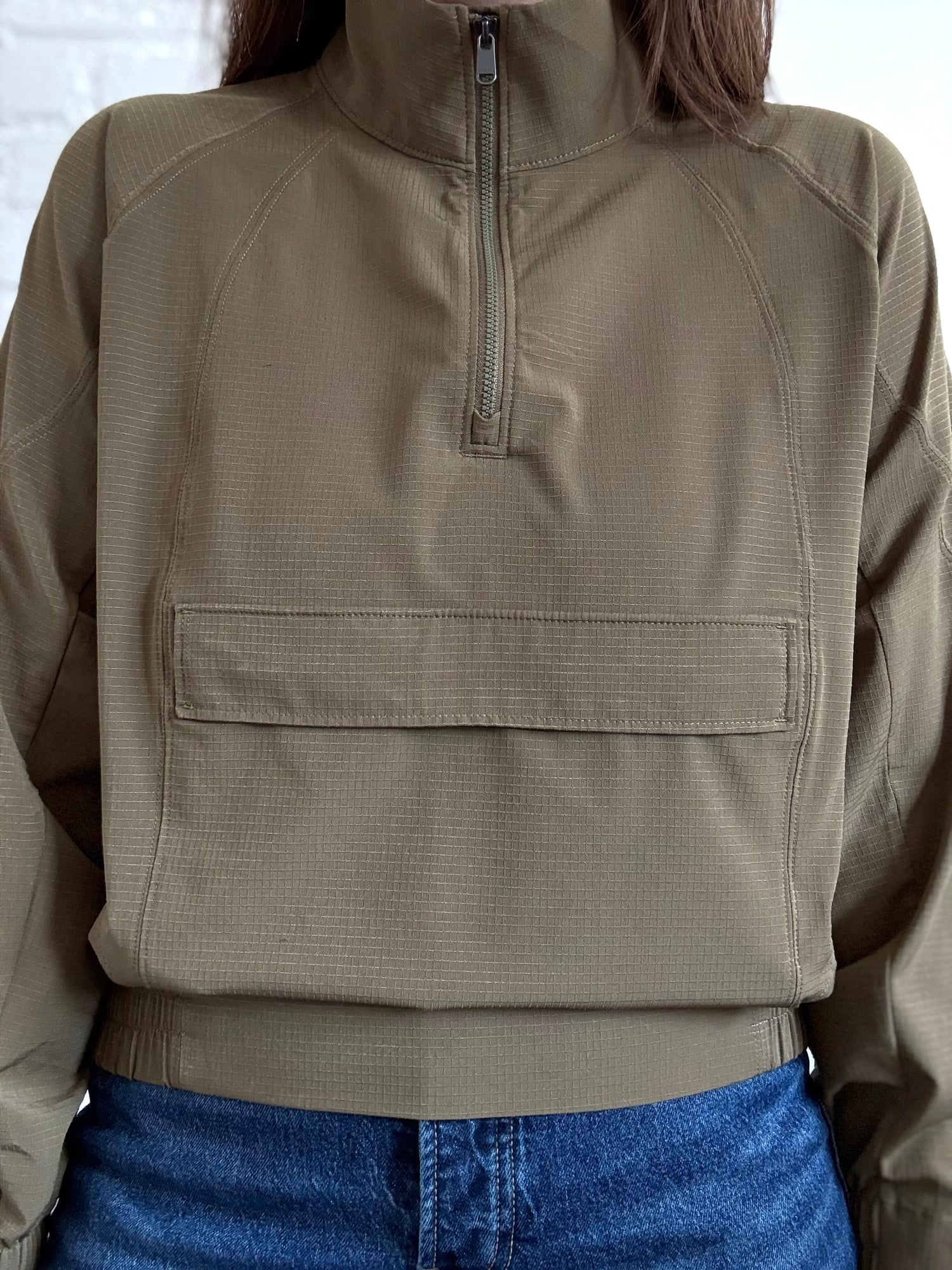 The Athleta Boundless Popover is an oversized, high-hip length pullover designed for layering, featuring a lightweight Ripstop fabric with 2-way stretch for mobility and an easy-care machine-washable construction. A gorgeous, dark olive green colour. Key features include a breathable design, a secure front zip pocket for essentials, and an oversized, comfortable fit. It is made from a blend including recycled polyester. Mint condition, like brand new. Retails for $128 CDN.