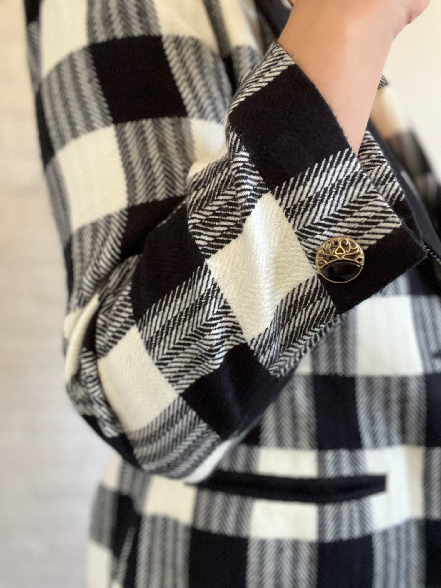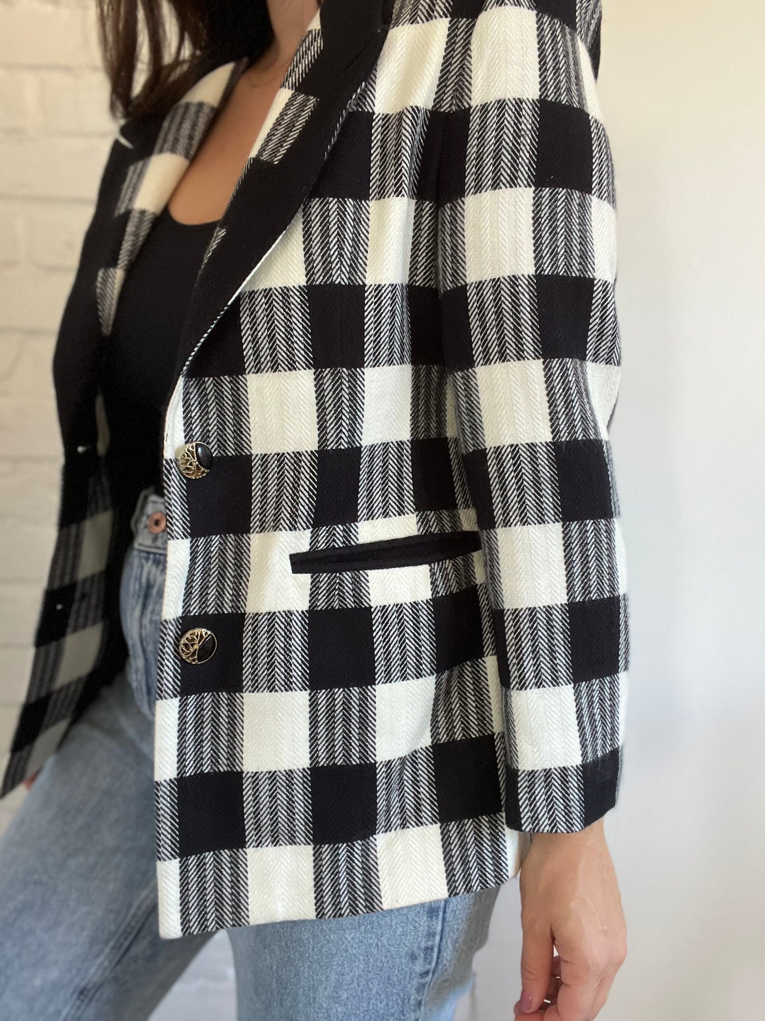 A black and white wool blazer with a stunning black chevron lapel. The chevron design is featured throughout. Vintage gold and black plastic buttons can be found in the front, and on the cuff. Blazer is lined with a polyester fabric, so it's not itchy the slightest. Two front pockets.
