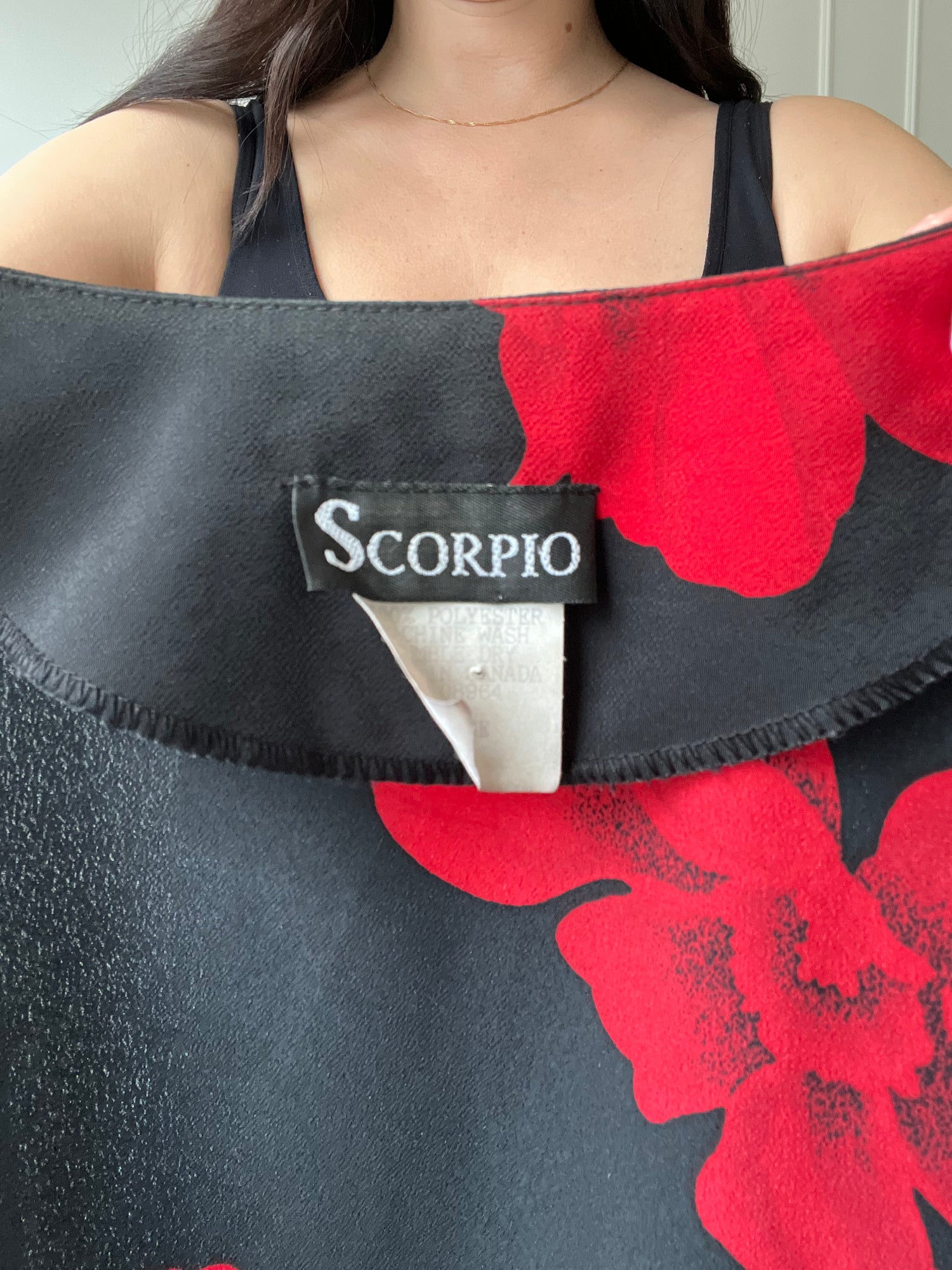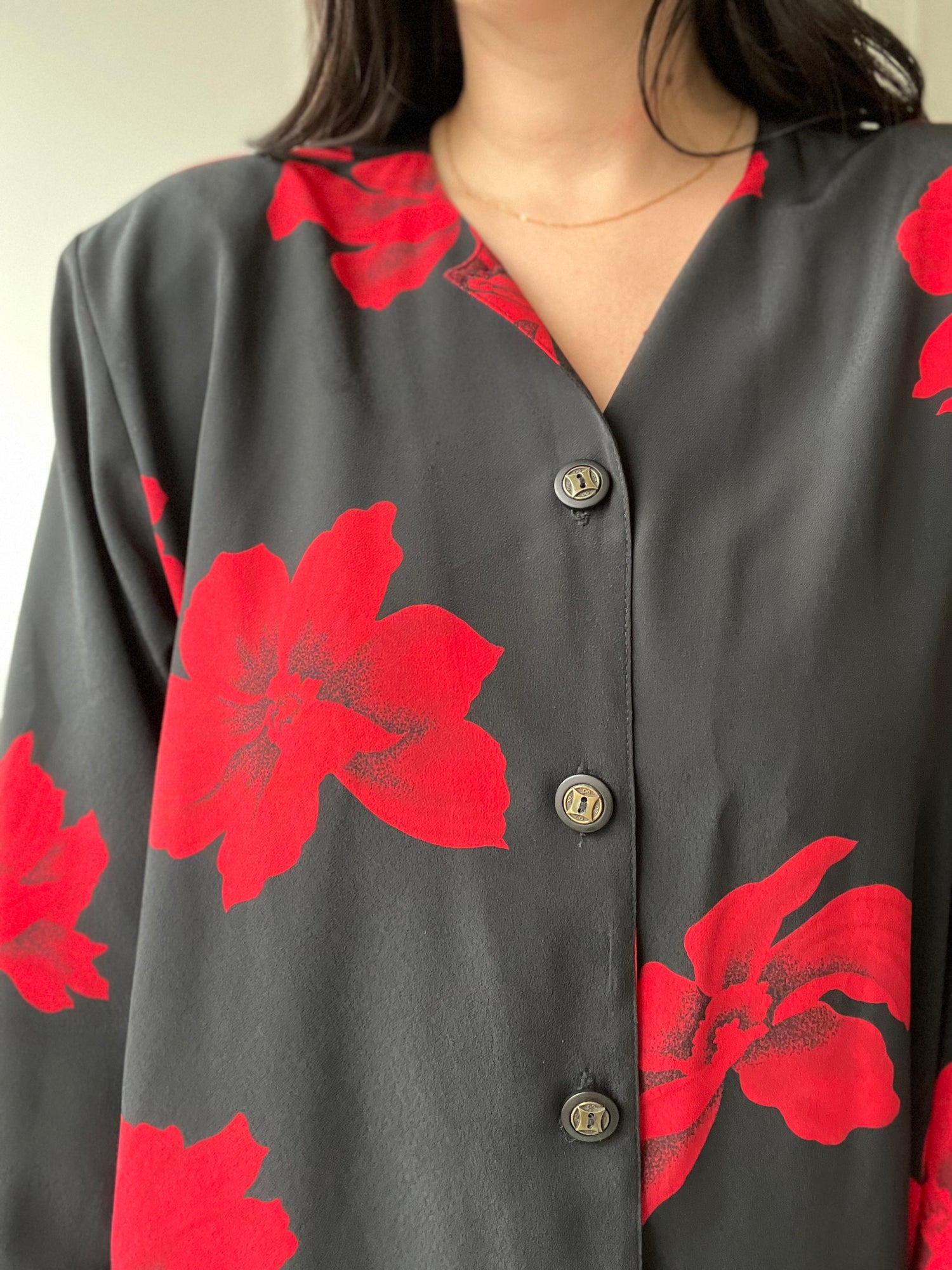 Oversize red rose blouse with a boxy fit. I cant decide if I like it open or closed better. Stunning gold and black button details, big slits along side. (Hell, I'd wear this over a bather!)