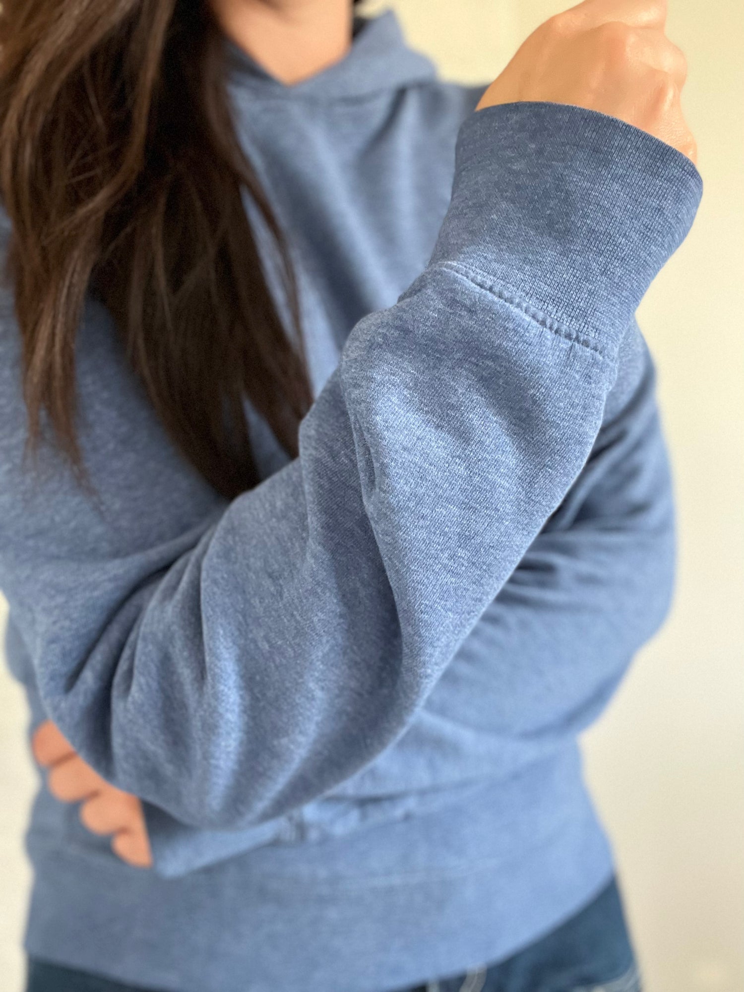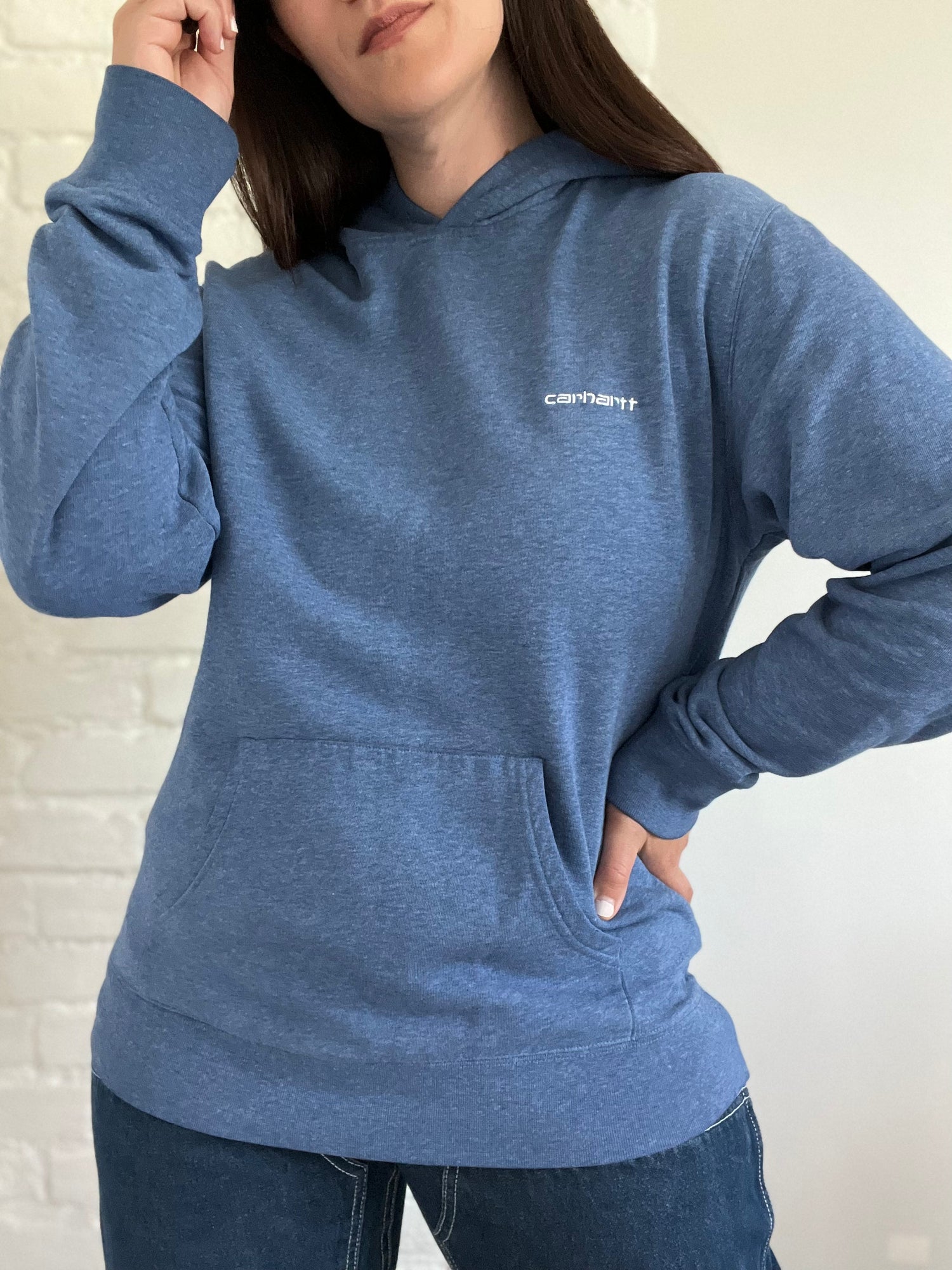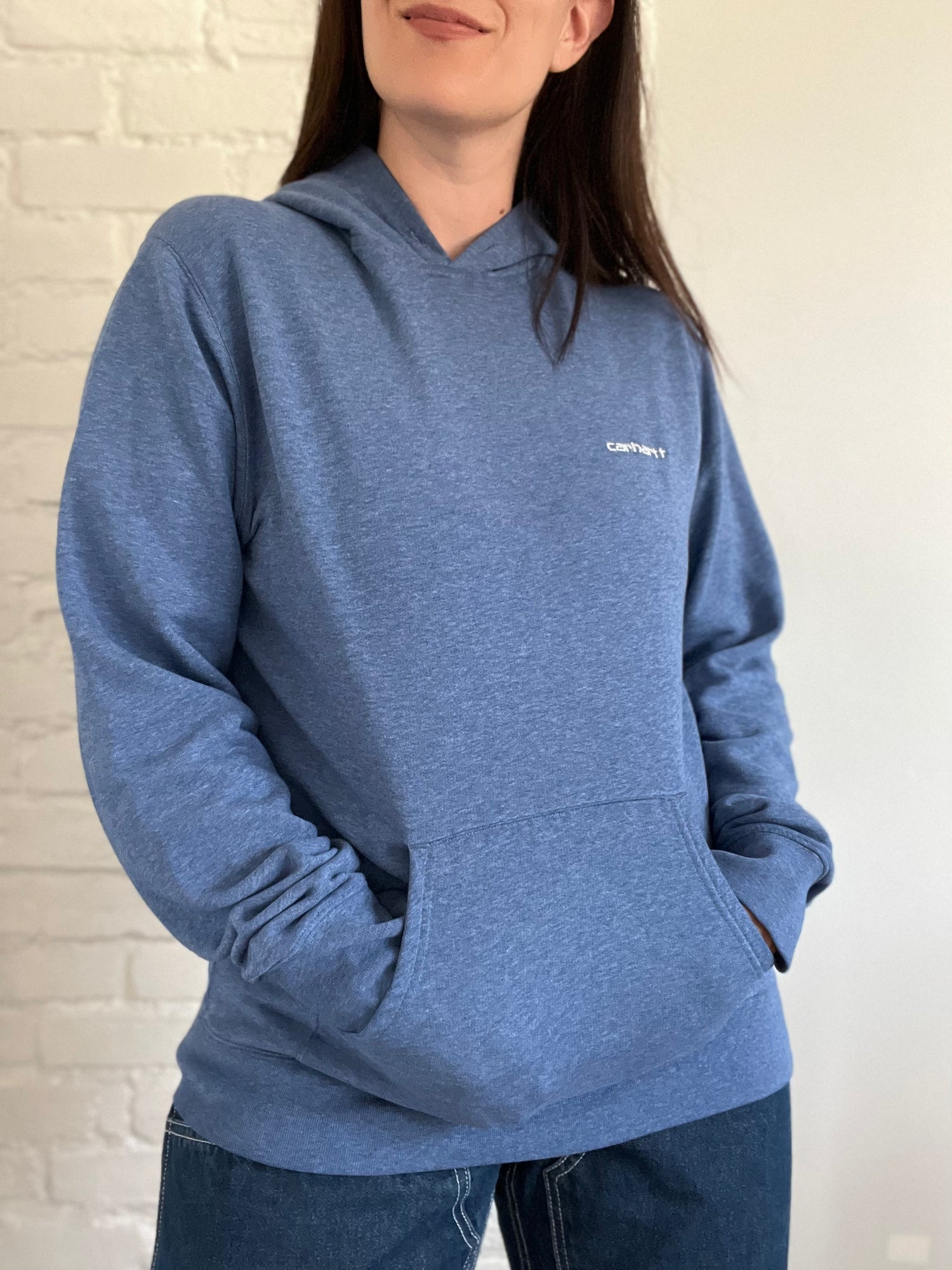 A heather'd blue Carhartt hoodie, white stitching across front and oversized front pouch. Super buttery soft and comfortable inside and out.