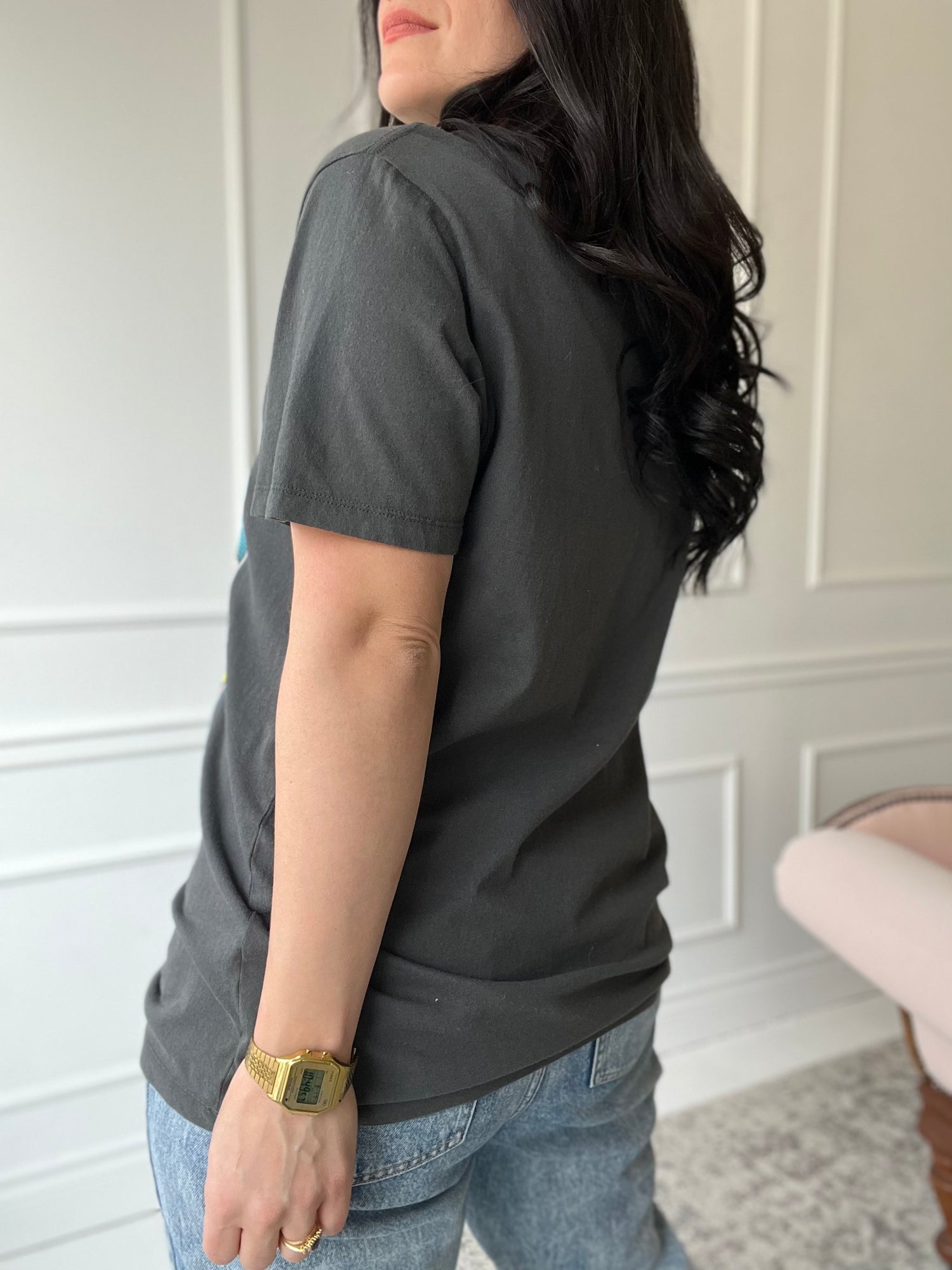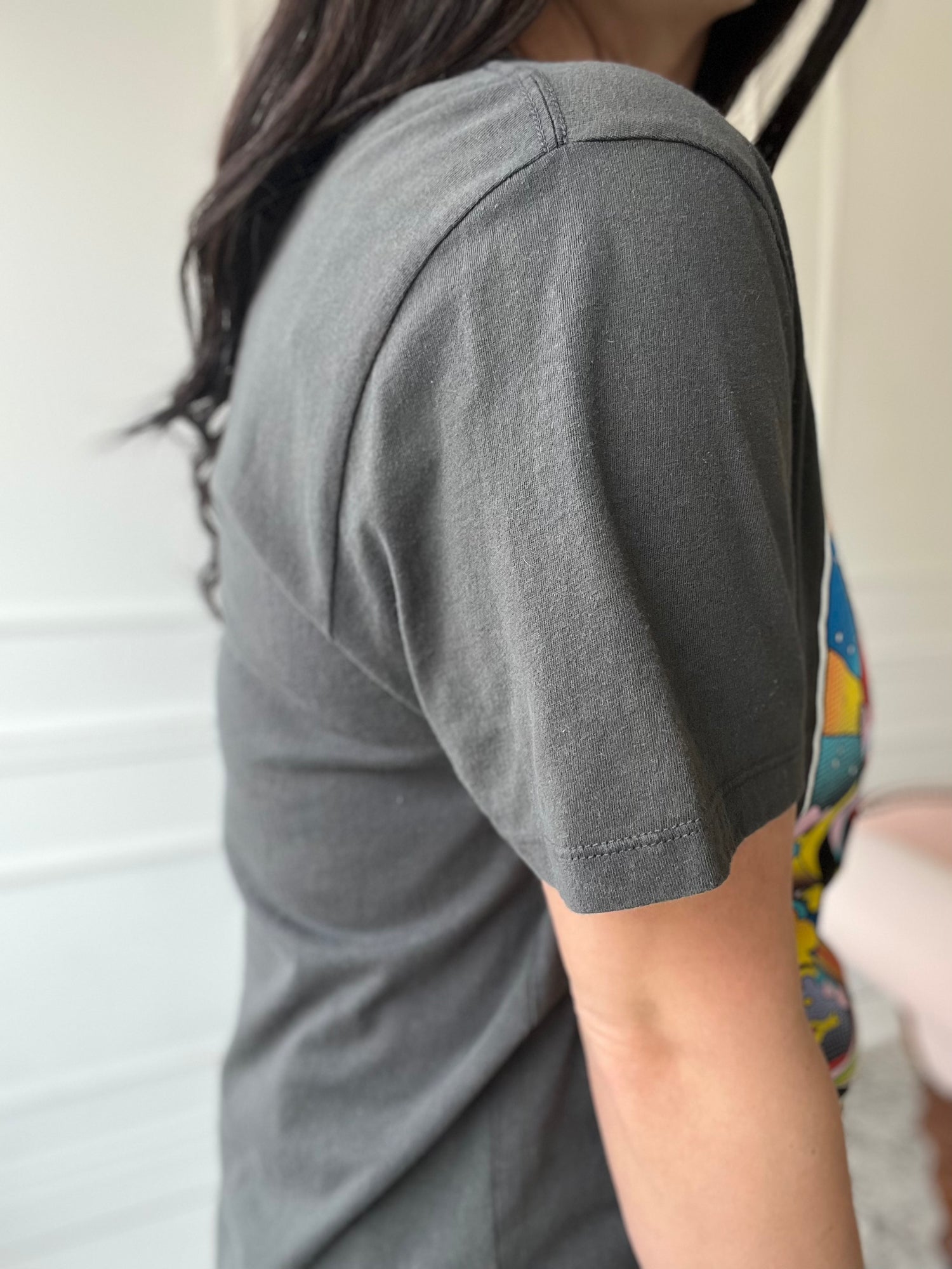 The graphic on this Bowie Tee is amazing. This is a brand new with tags, and is tagged a Mens M (which fits oversized). It's a dark charcoal grey, and the cotton is a relaxed, very soft fit.