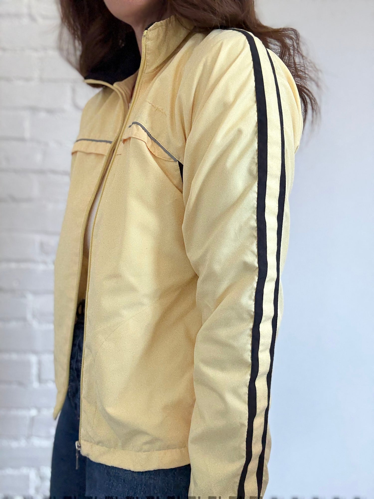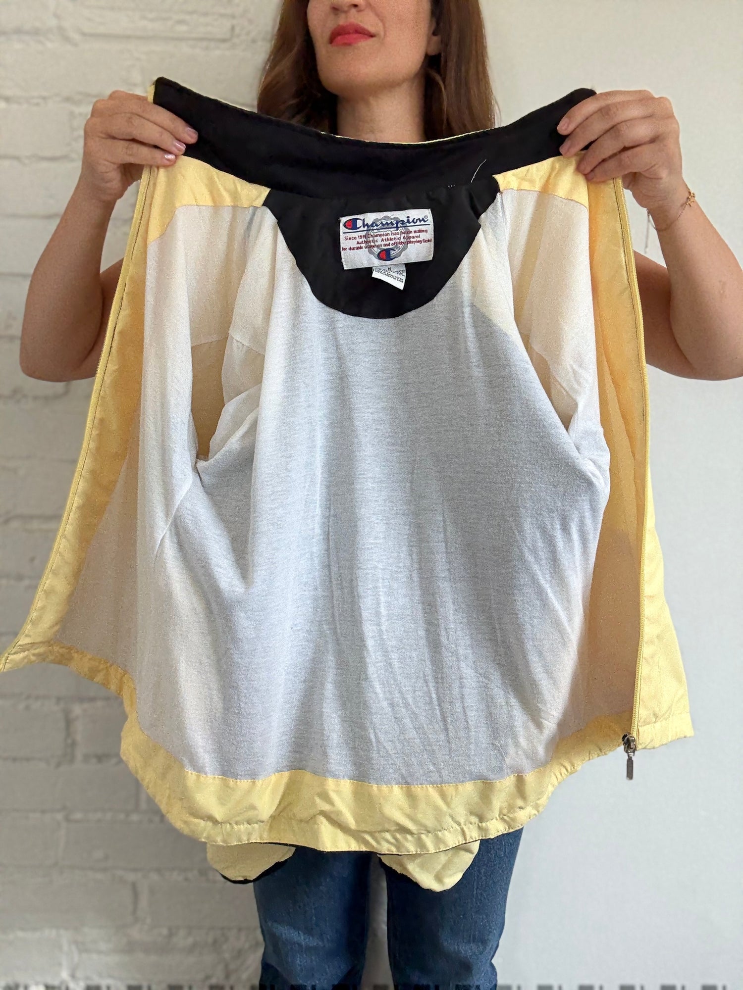 A retro Champion track sweater in a beautiful butter yellow. Accented with black all over, with a sporty-look and feel. Mock collar and zip front for closure. Champion logo embroidered across the front left chest – for a sleek yellow on yellow. Interior is lined with a cotton for added comfort and warmth.