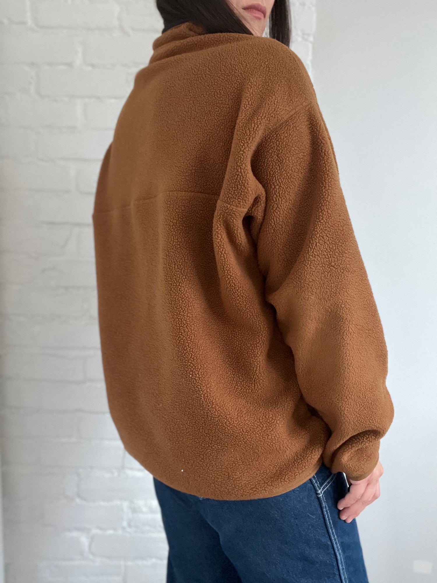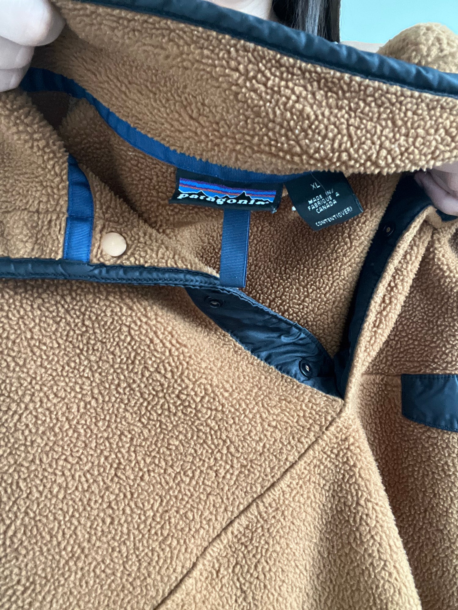 A stunning and rare, rich caramel brown Patagonia Fleece Synchilla. Black colour-way, with front t-snap and inner rim coloured black. Snap buttons melt in the background with the same caramel colour.