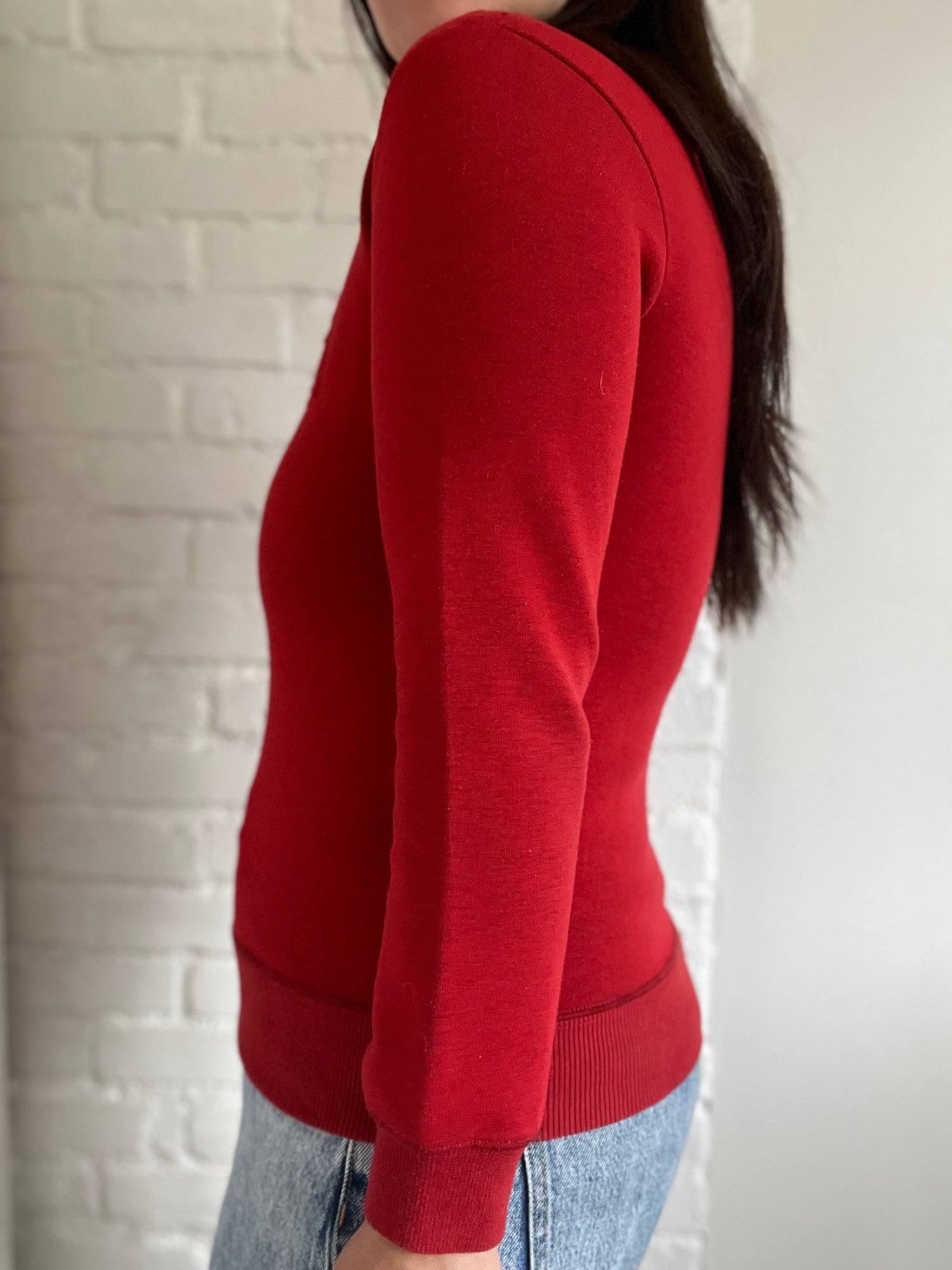 A gorgeous cotton stretch, cherry red Hunter sweater. Logo on the front looked elevated in a 3-D effect. Ribbed at cuffs and hem. Sized a youth 14, or fits a women's xsmall/small, or tight medium. PS - little white fluff on shirt not included (ha! It happens).