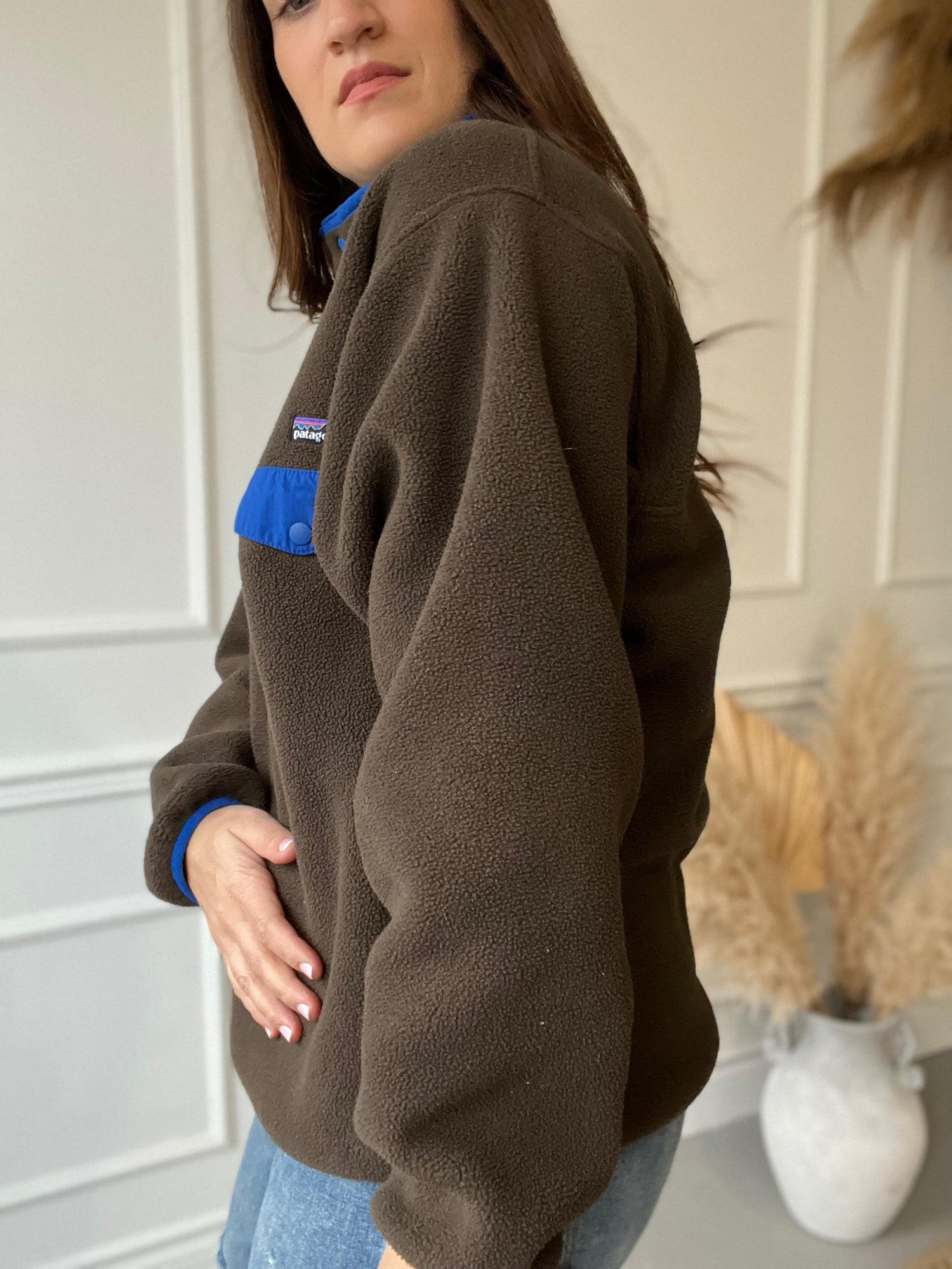 A beautiful 2-tone colourway in chocolate brown and royal blue. This fleece synchilla is in superb condition and very plushy. This is a mens M, or a Womens L. Providing everyday warmth and comfort, this classic pullover is made with 100% recycled Synchilla polyester fleece. Fair Trade Certified™ sewn.