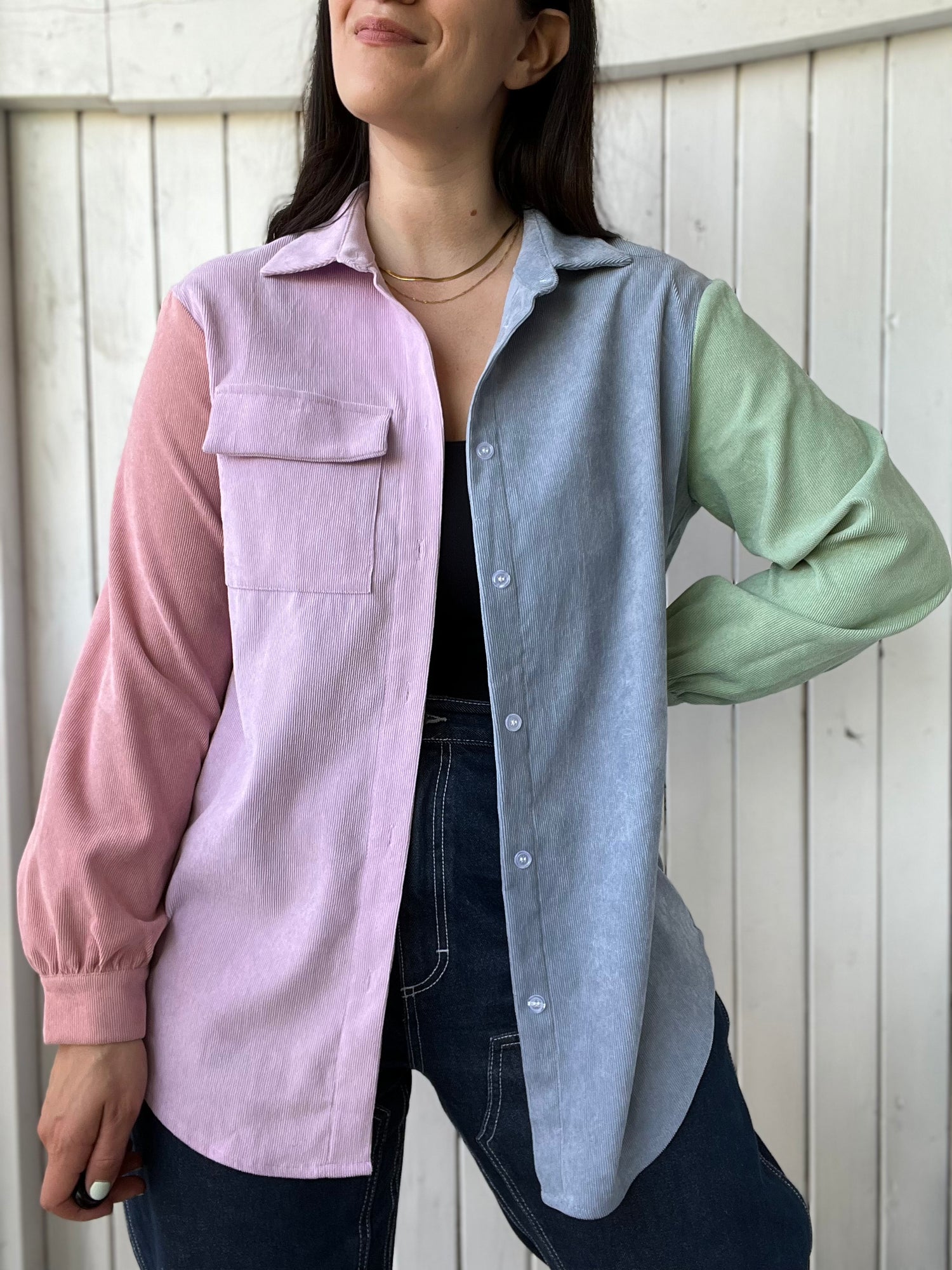 I love the versatility of this shirt. Wear it as a jacket, or wear it over your bathing suit on the beach. You with me? This mini-cord button-up shirt screams sorbet ice cream in all the right ways. Shake up your style this spring and let the colours sing. There's no tag on the inside, but it fits like an oversized medium or regular large.