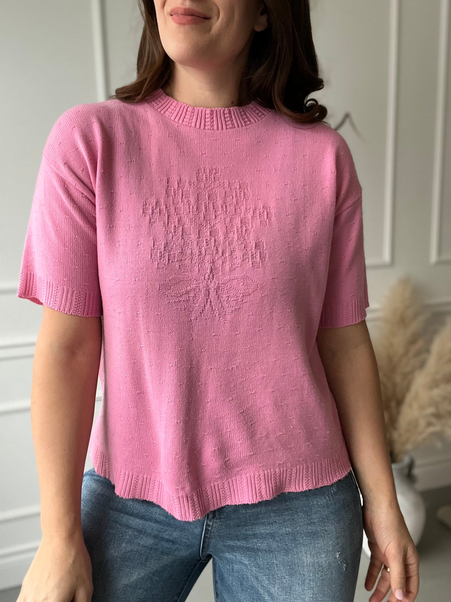 A short sleeved, country knit in bubblegum pink. Features a vintage stamp across the chest of a floral basket. The country is calling!