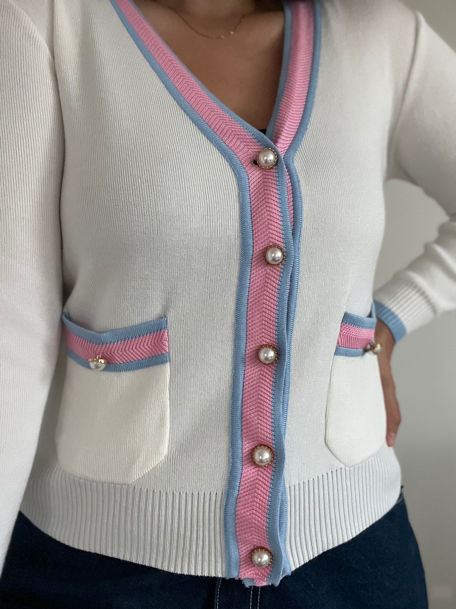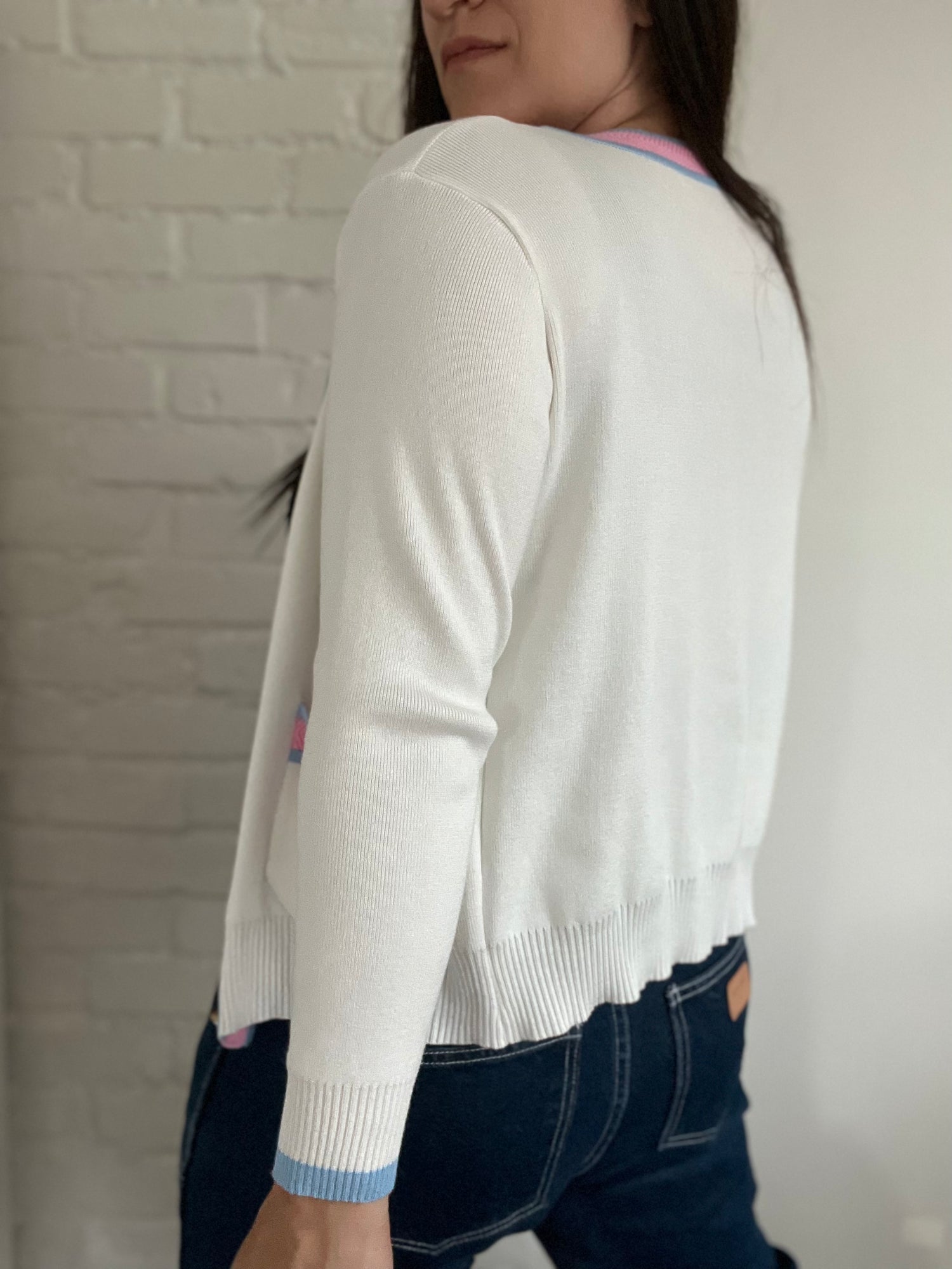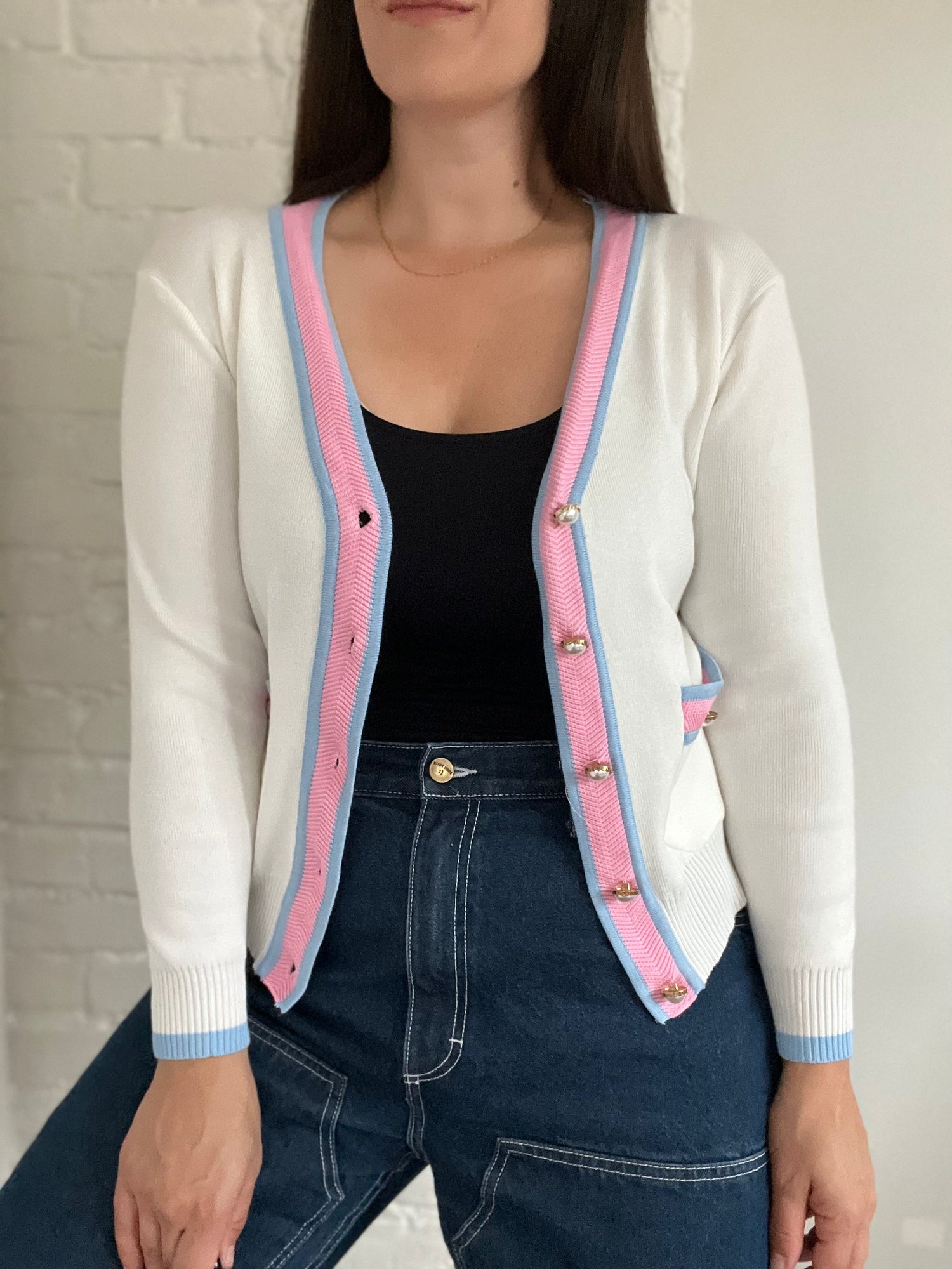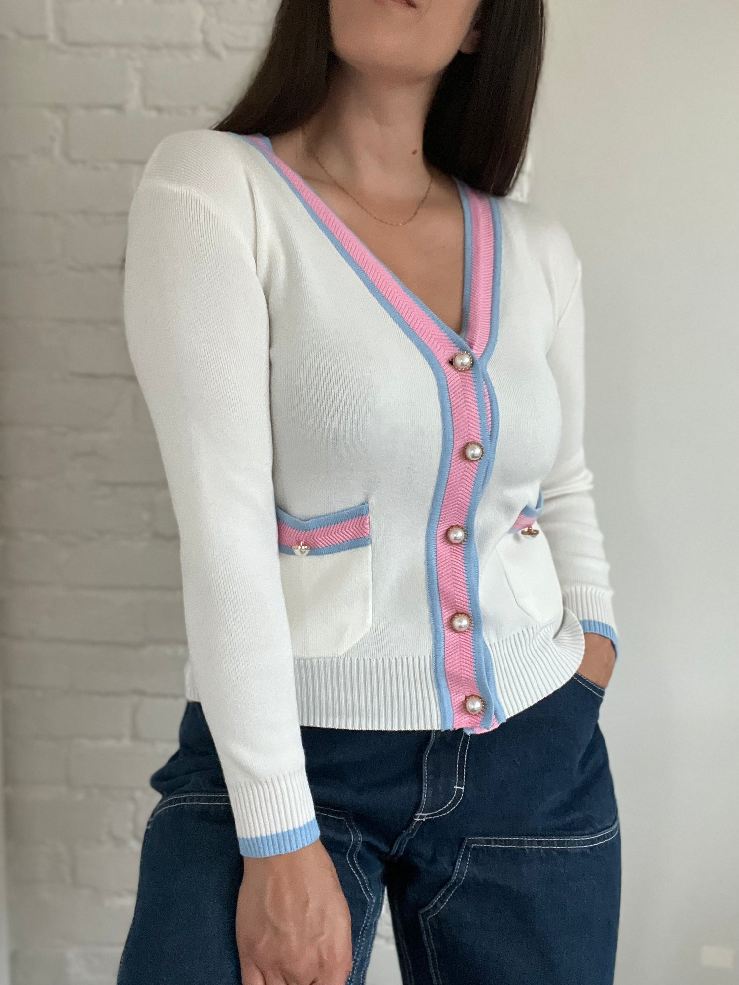 A starch white cardigan with contesting cotton candy pink and blue edging. It's giving me preppy meets the tennis court. A high quality knit, this gorgeous piece also features vintage pearl buttons in perfect condition. Two front pockets to hide all your goodies. Stretchy, and so so soft.