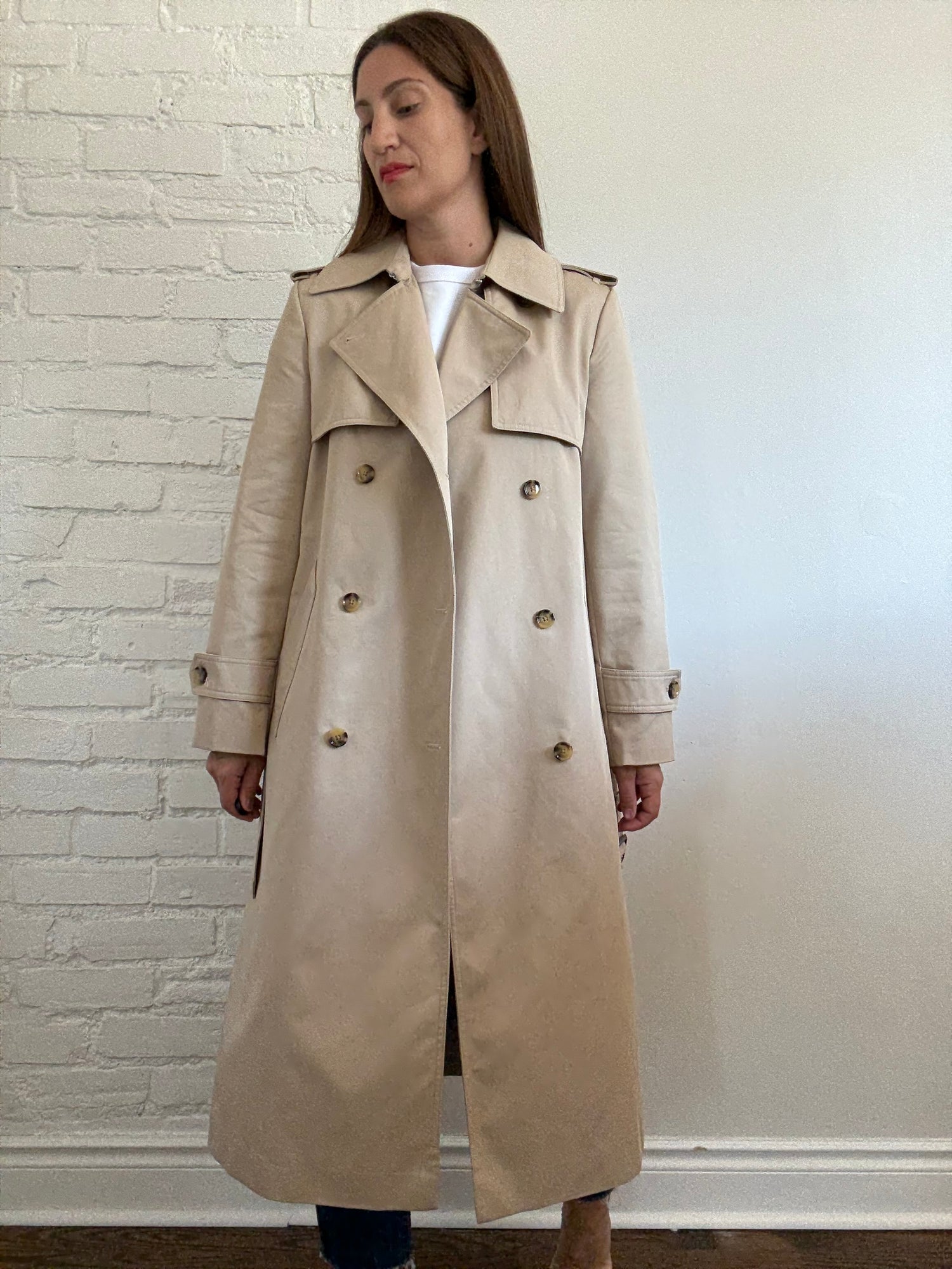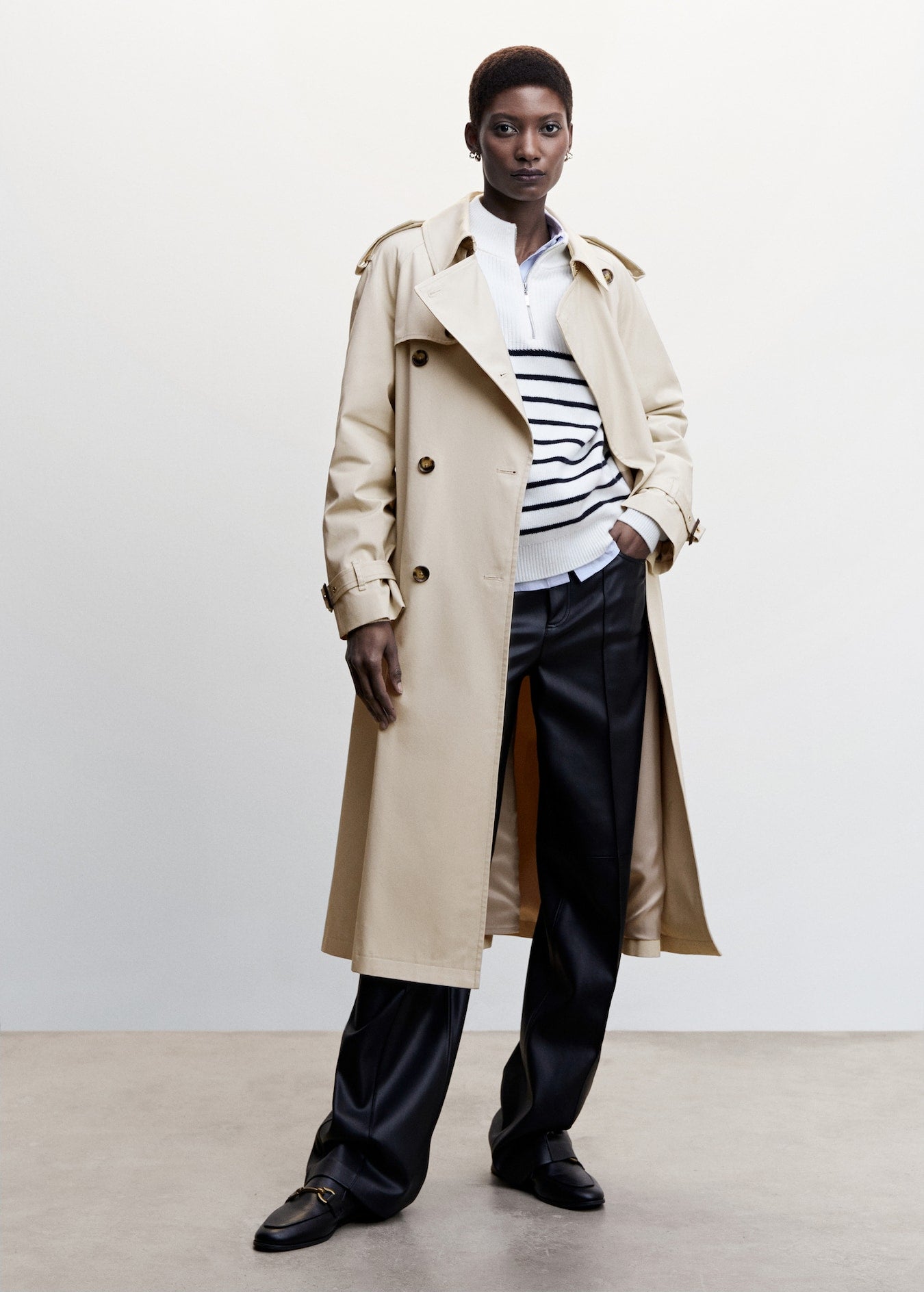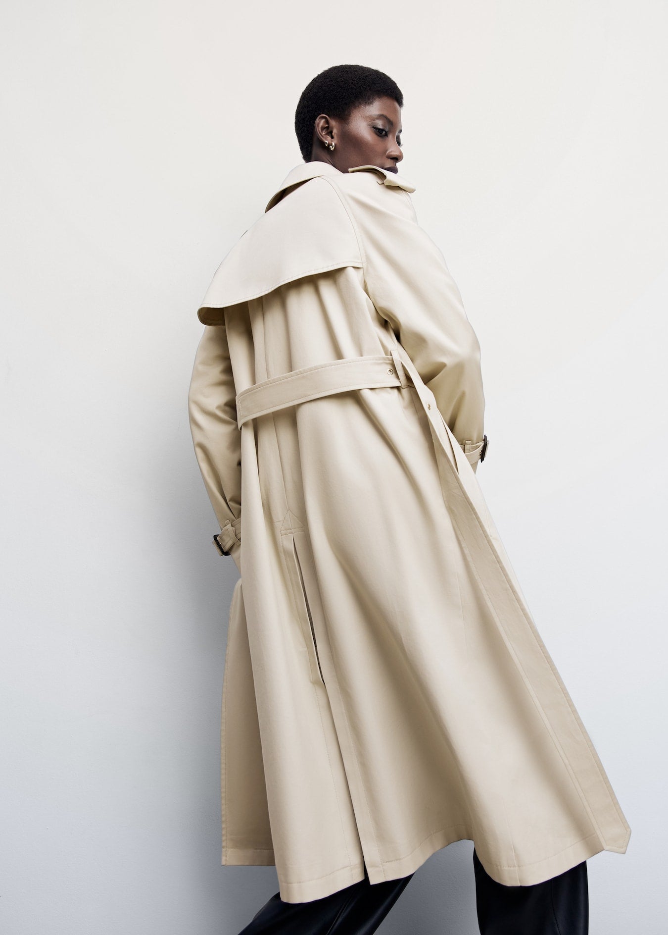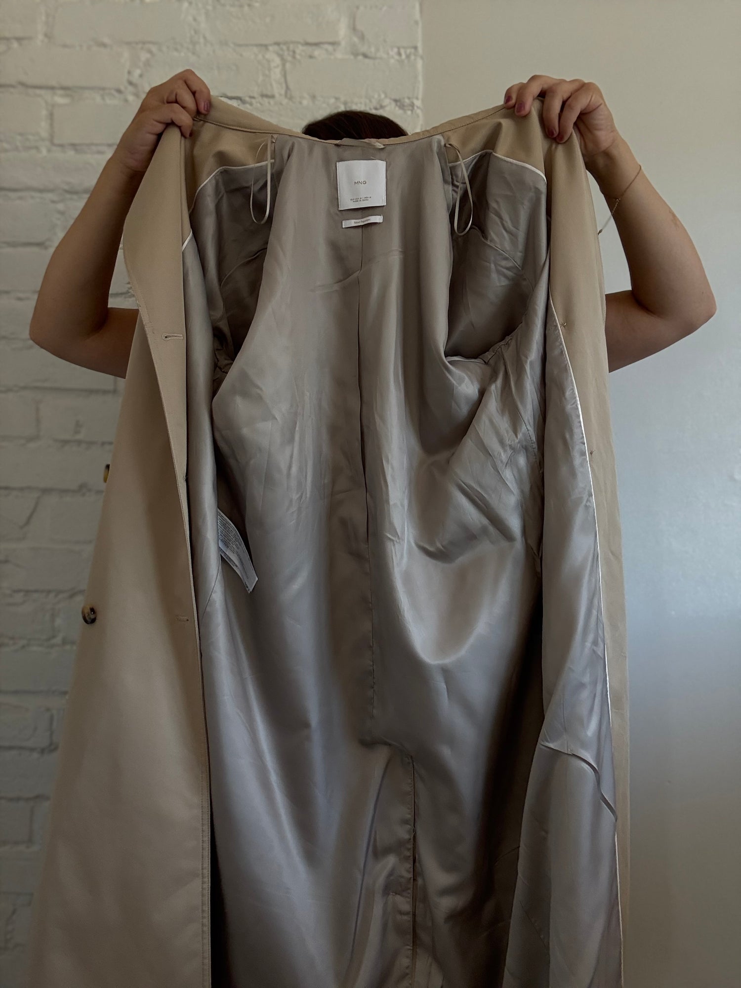 A stunning, brand new without tags, long trench coat from Mango. Water-repellant, the durable finish of this garment protects against light rain, repelling contact with water and raindrops. 100% cotton fabric with a straight, long design. Lapel with notch. Decorative buttons on the shoulders, and belt buckle fastening. Front closure with crossed buttons. Inner lining. Retails for $229 USD or $350 CDN.