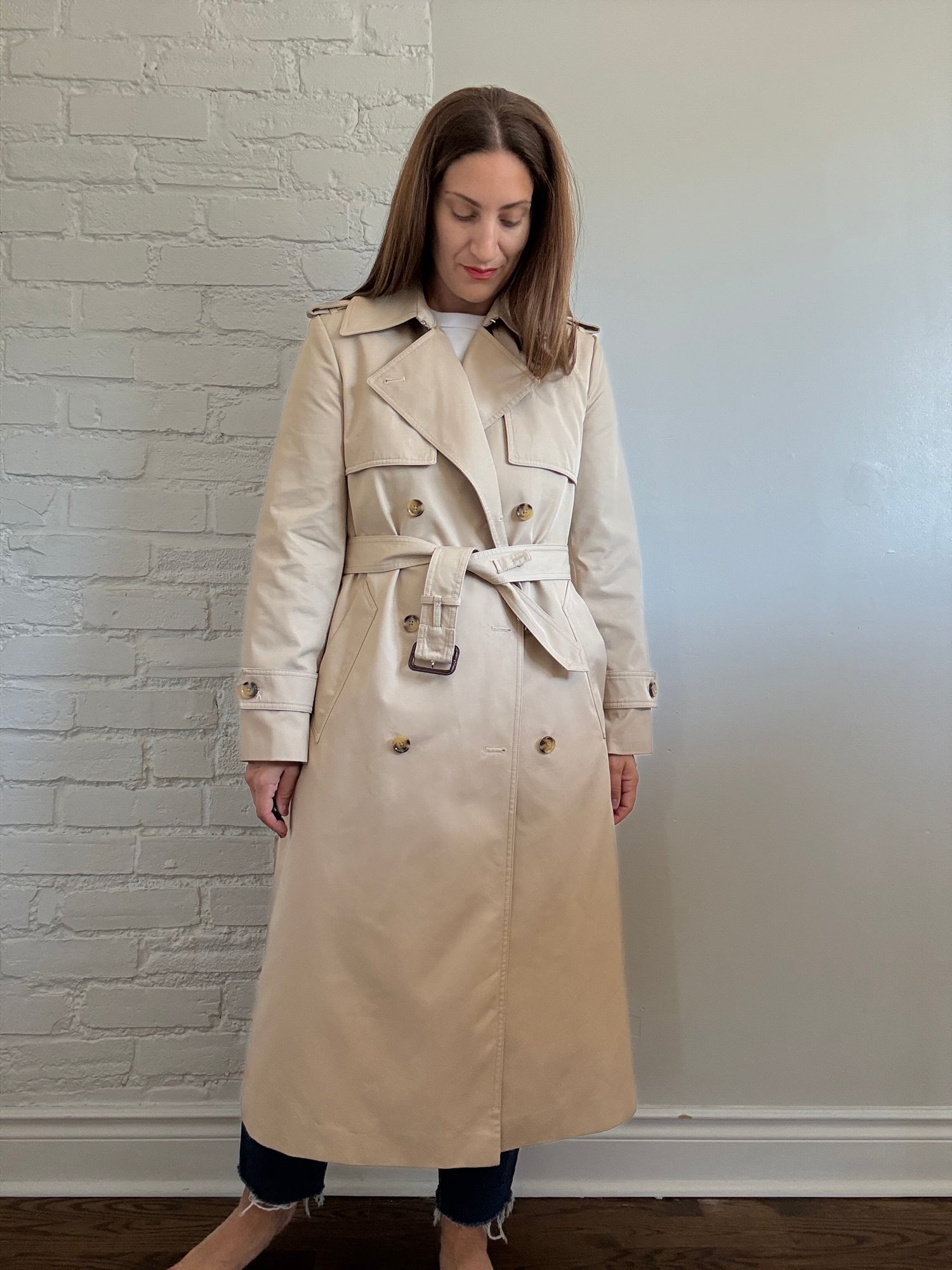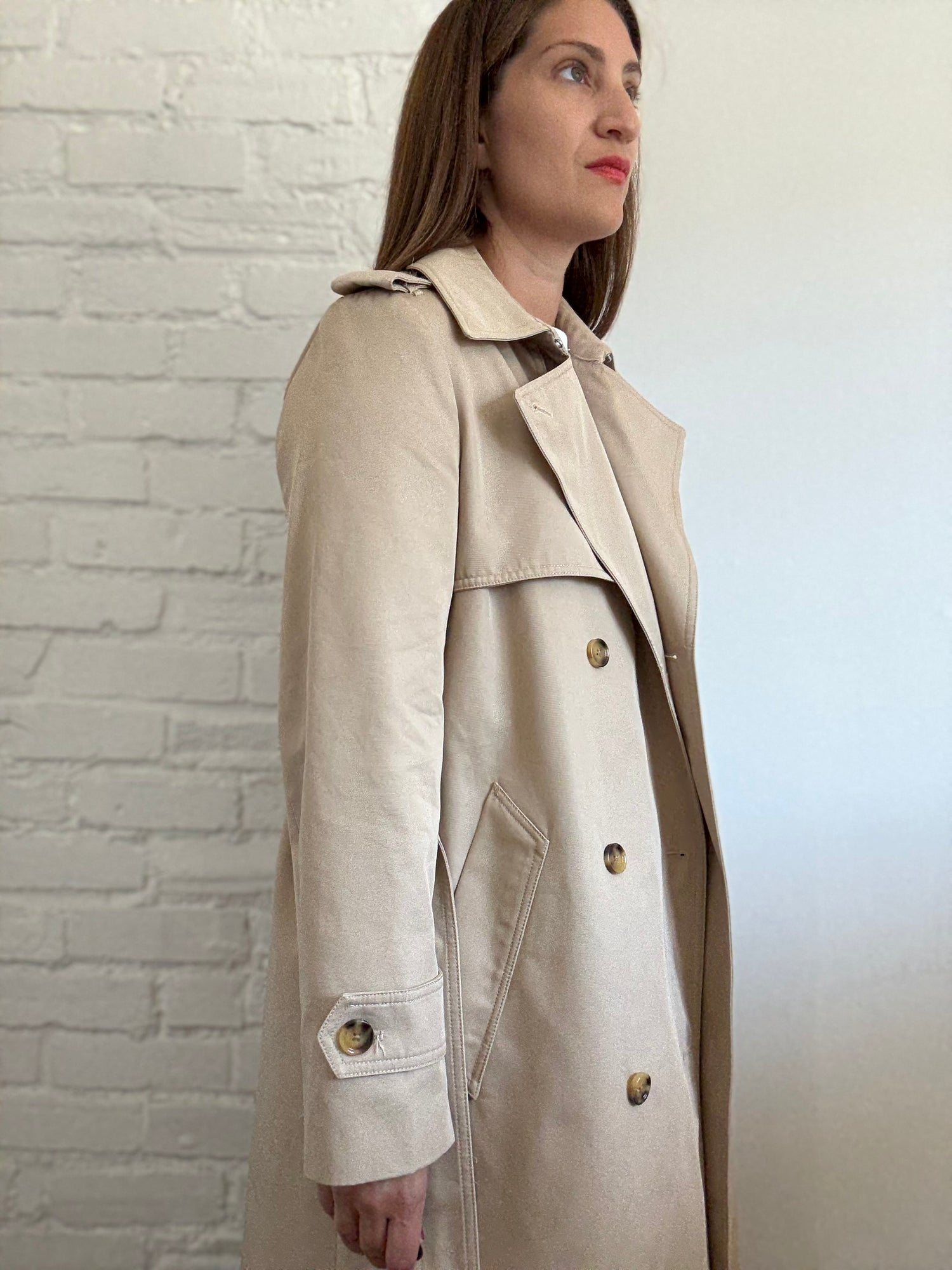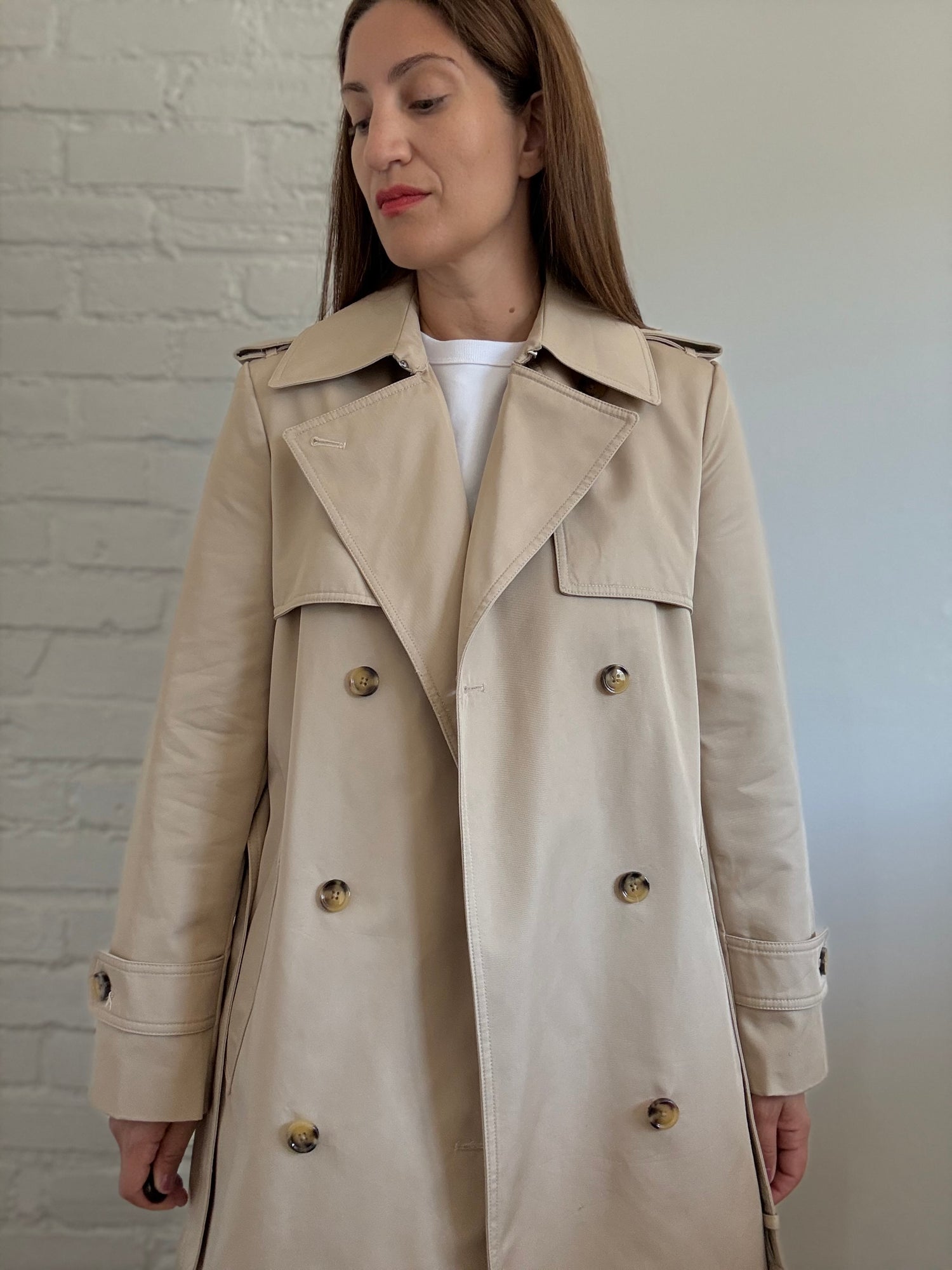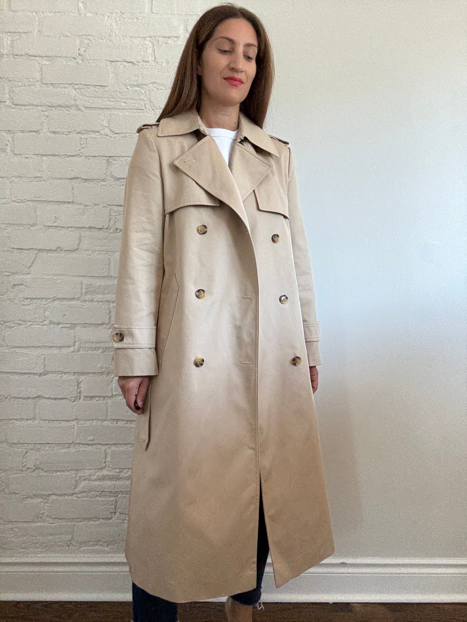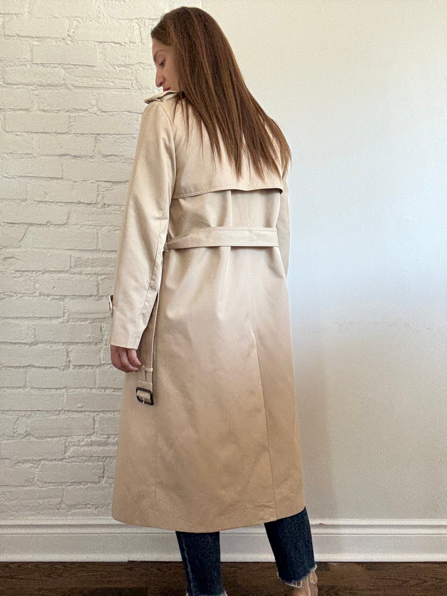 A stunning, brand new without tags, long trench coat from Mango. Water-repellant, the durable finish of this garment protects against light rain, repelling contact with water and raindrops. 100% cotton fabric with a straight, long design. Lapel with notch. Decorative buttons on the shoulders, and belt buckle fastening. Front closure with crossed buttons. Inner lining. Retails for $229 USD or $350 CDN.