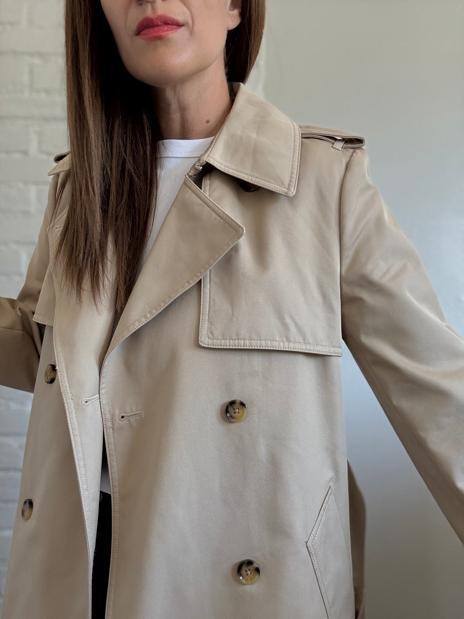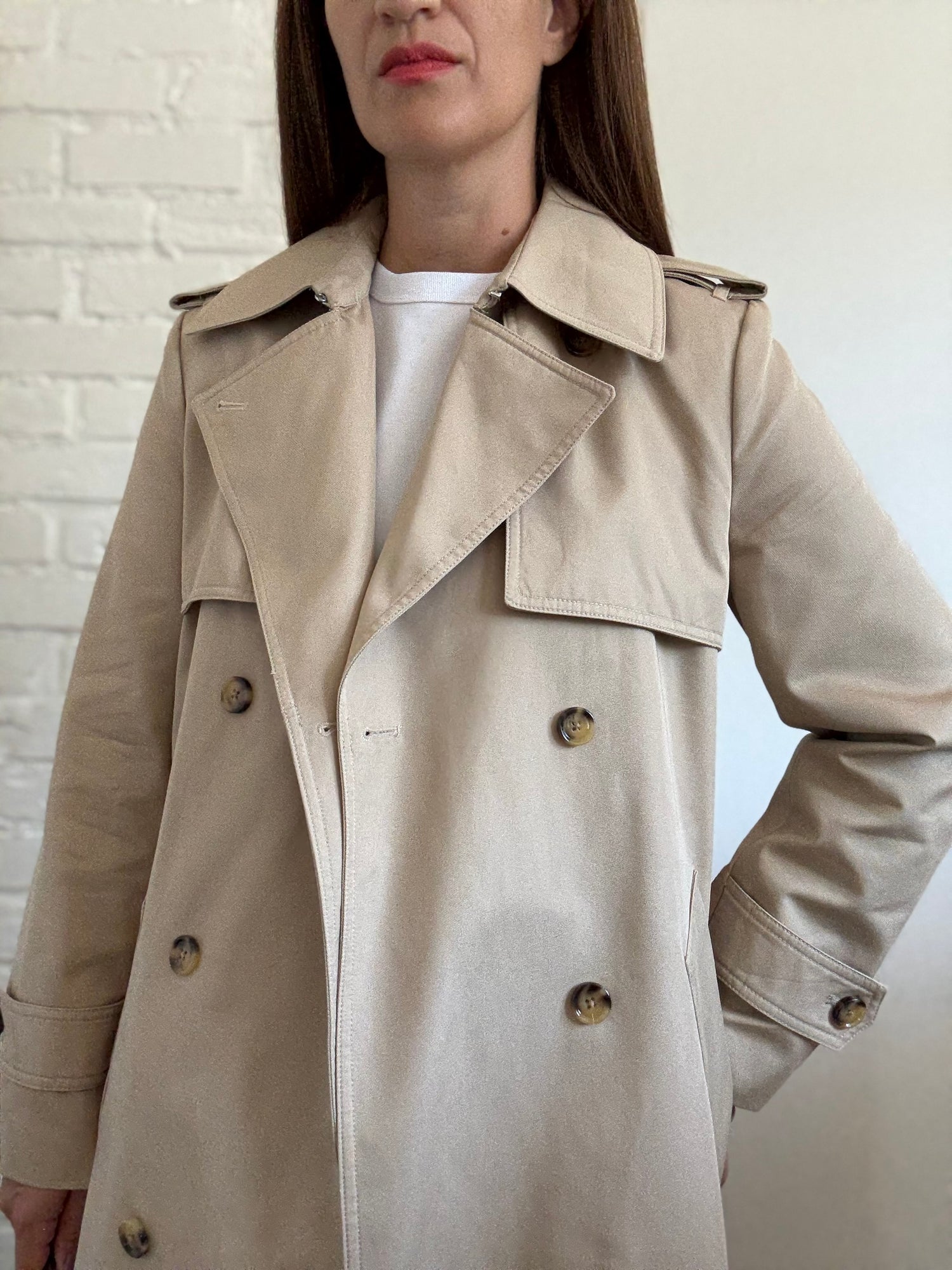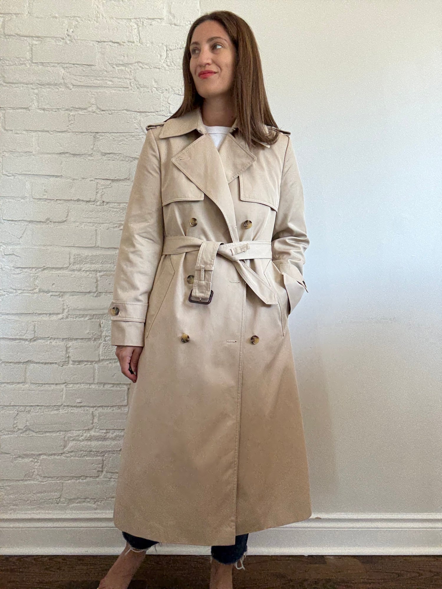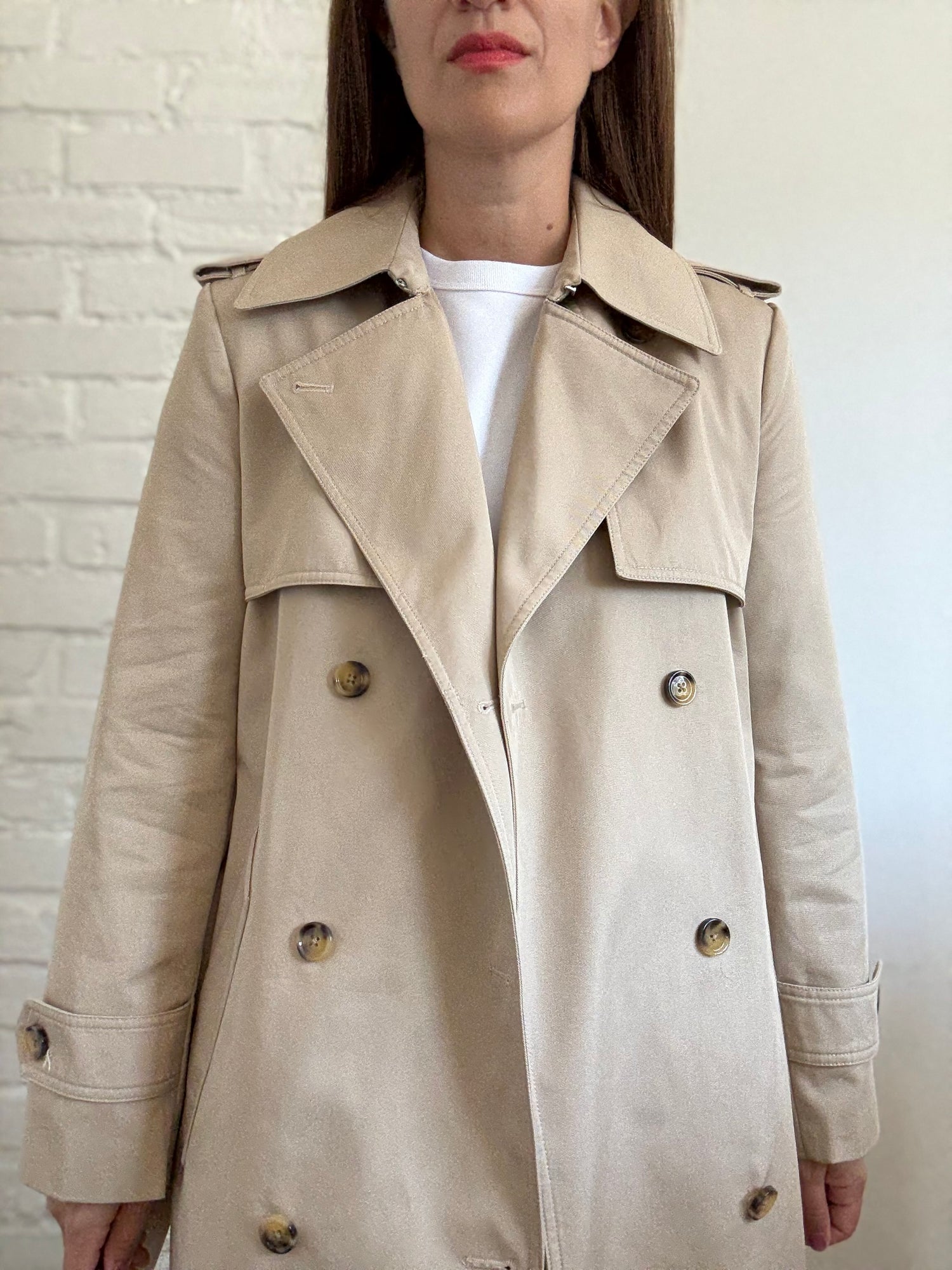 A stunning, brand new without tags, long trench coat from Mango. Water-repellant, the durable finish of this garment protects against light rain, repelling contact with water and raindrops. 100% cotton fabric with a straight, long design. Lapel with notch. Decorative buttons on the shoulders, and belt buckle fastening. Front closure with crossed buttons. Inner lining. Retails for $229 USD or $350 CDN.