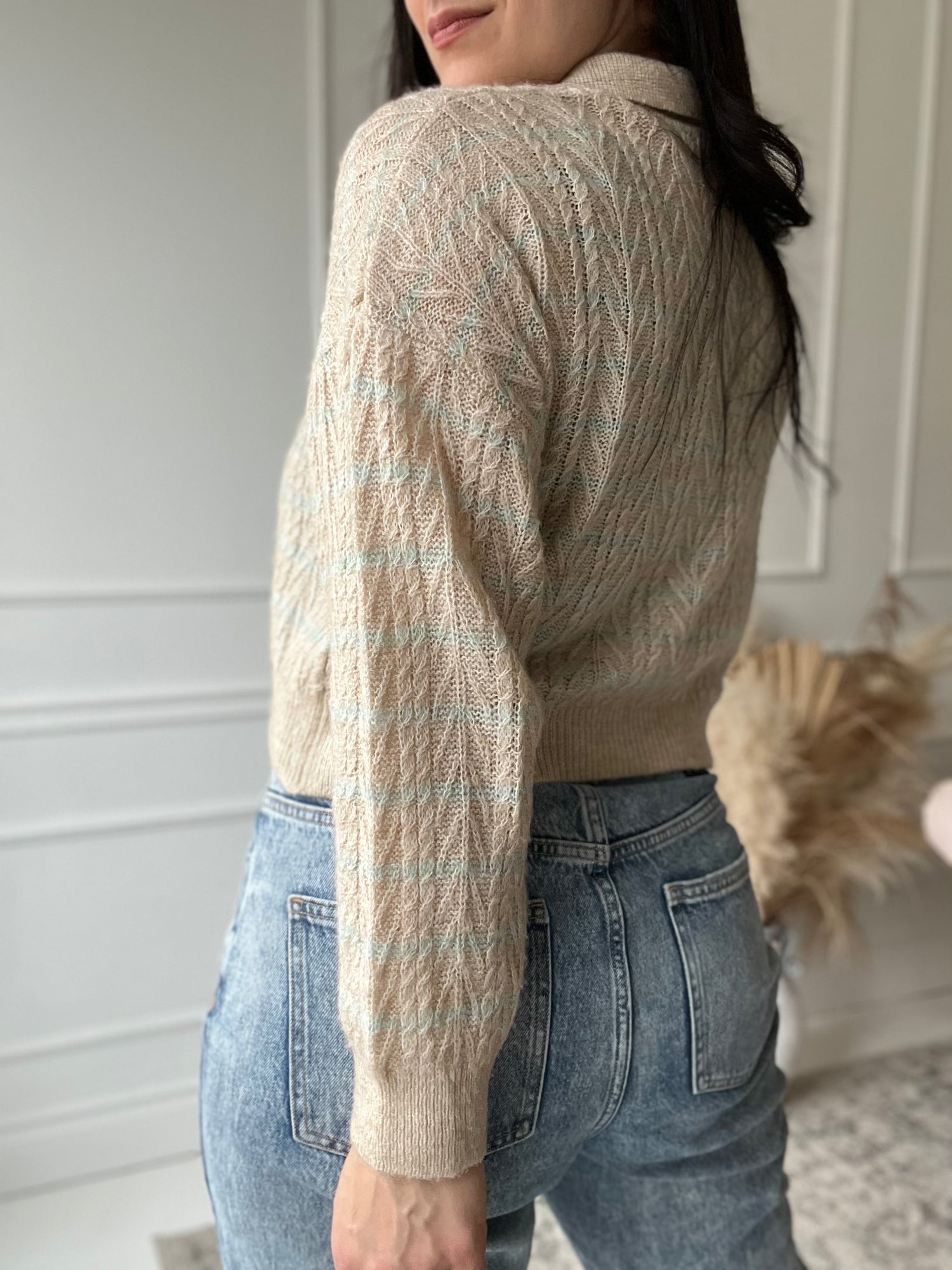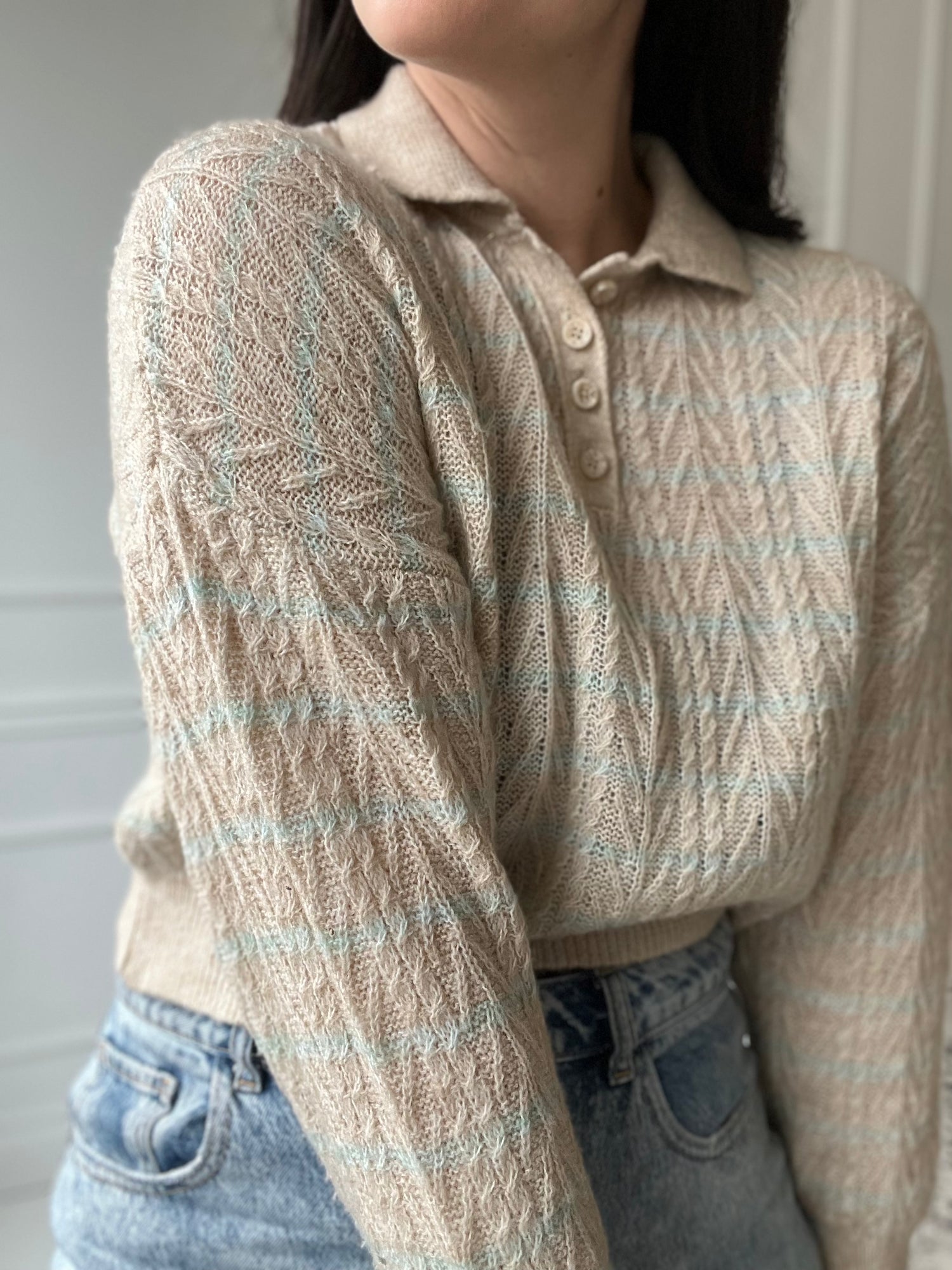 An oversized, cropped knit sweater with a lightweight almost see-through texture. There's a faint line of turquoise going through the sweater, overtop a creamy neautral beige. A 4-button closure at top, and collar. This is tagged an XS, but fits oversized and can be worn between XS - L (me) depending on desired fit.