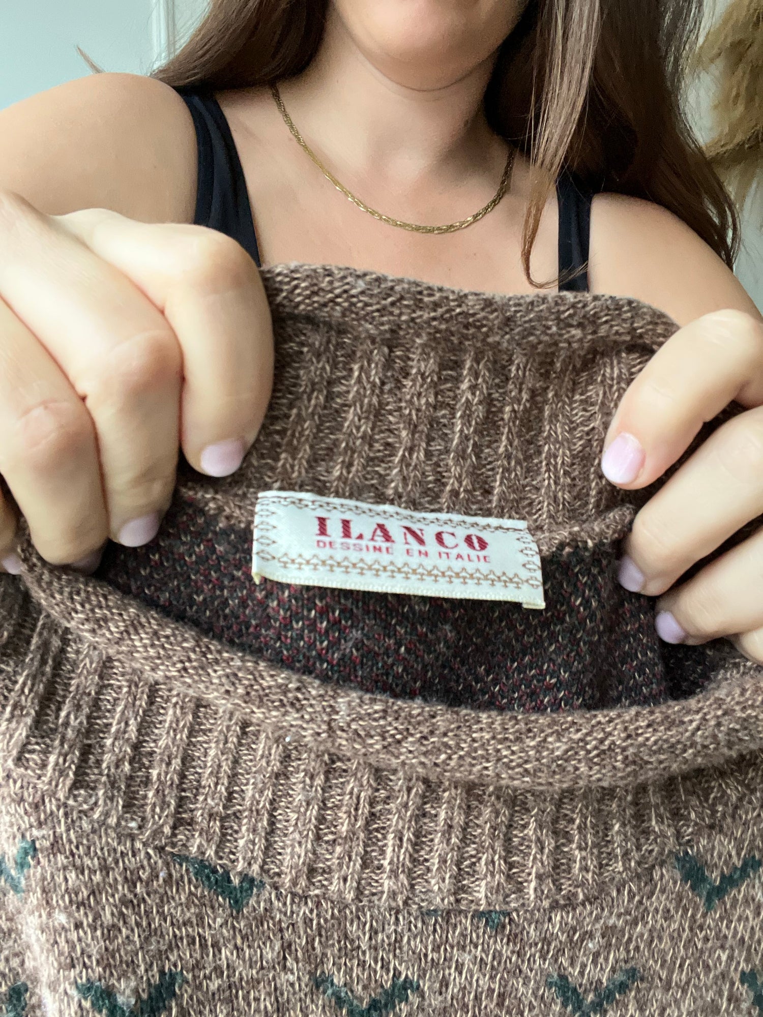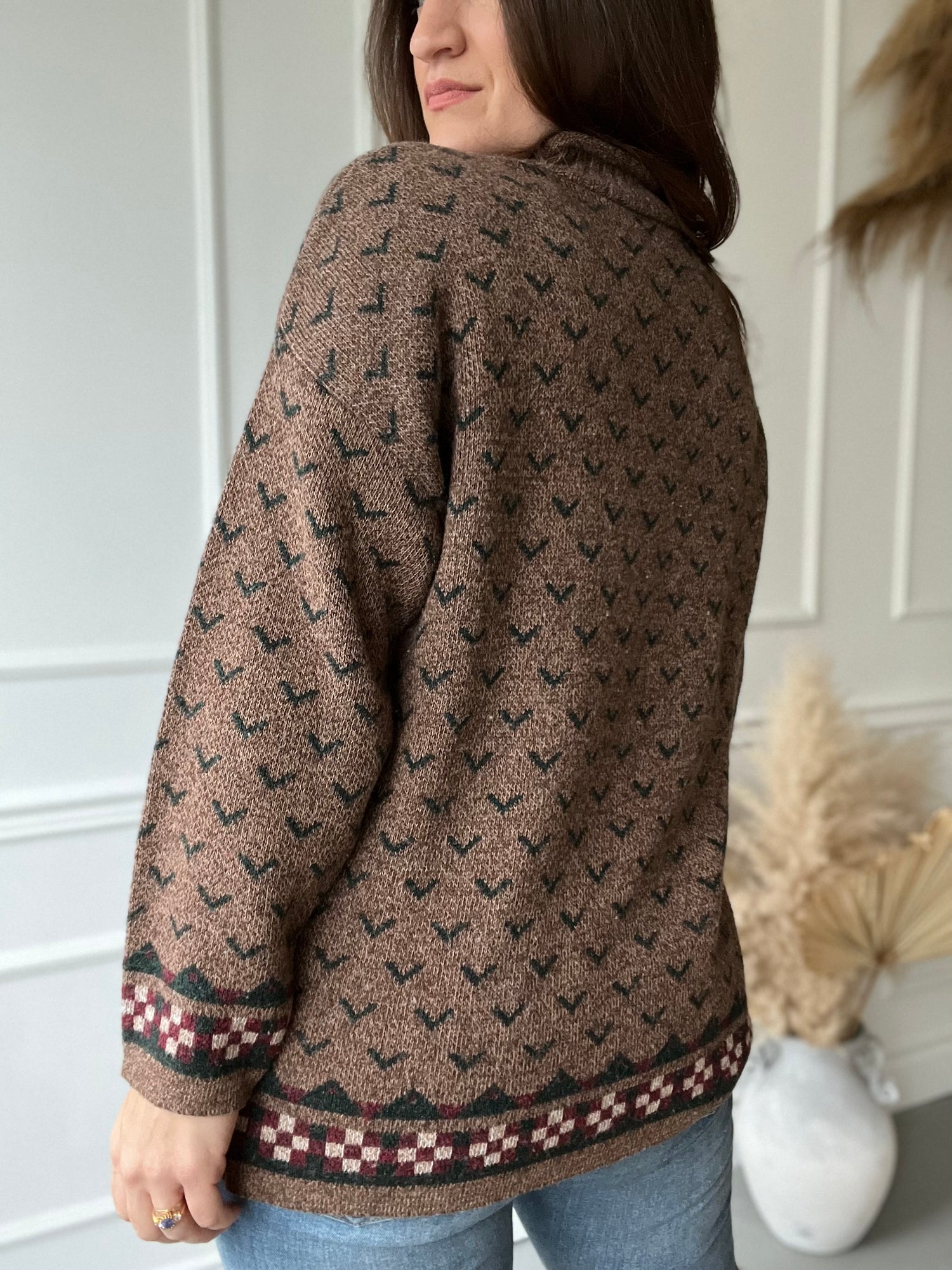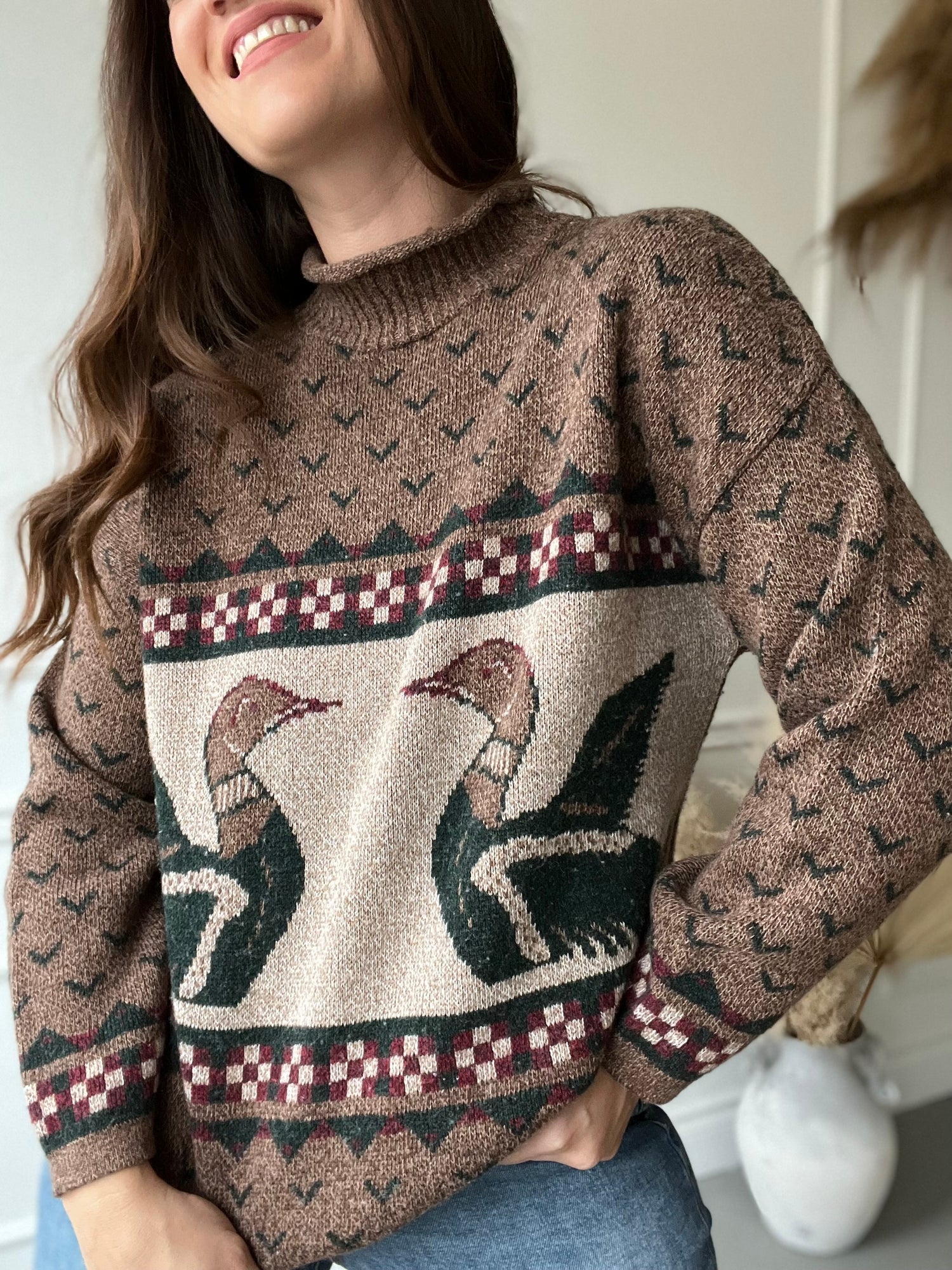 A high quality, dad loon sweater with beautiful details. A rich brown throughout, with two loons facing off on the front. Hunter green and red colouring throughout. In excellent condition.
