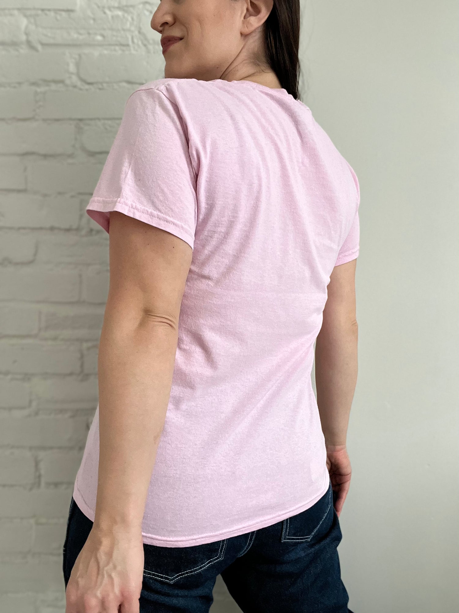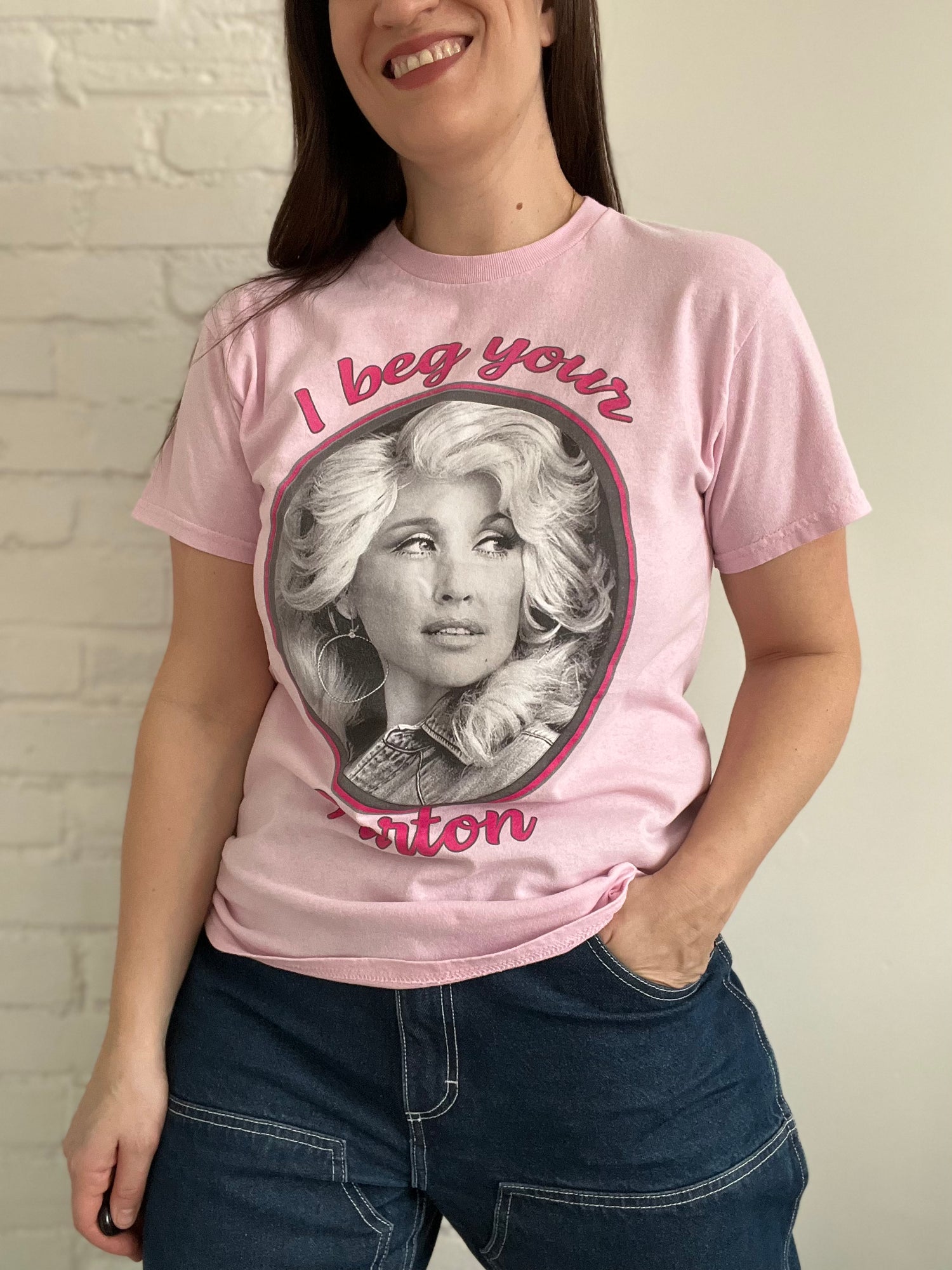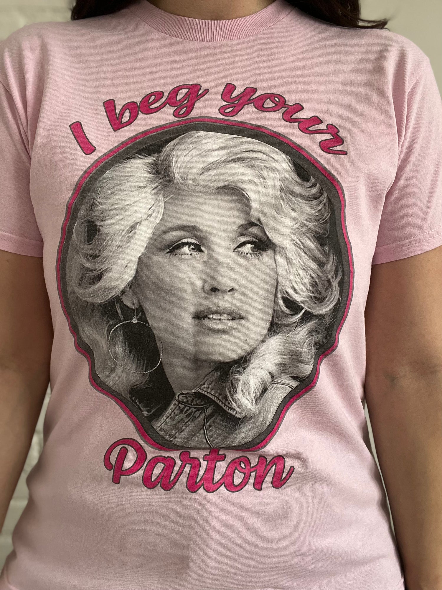 A young Dolly black and white photo overtop a pink backdrop. "I beg your Parton", written around graphic. 100% soft cotton, this shirt is in mint condition.