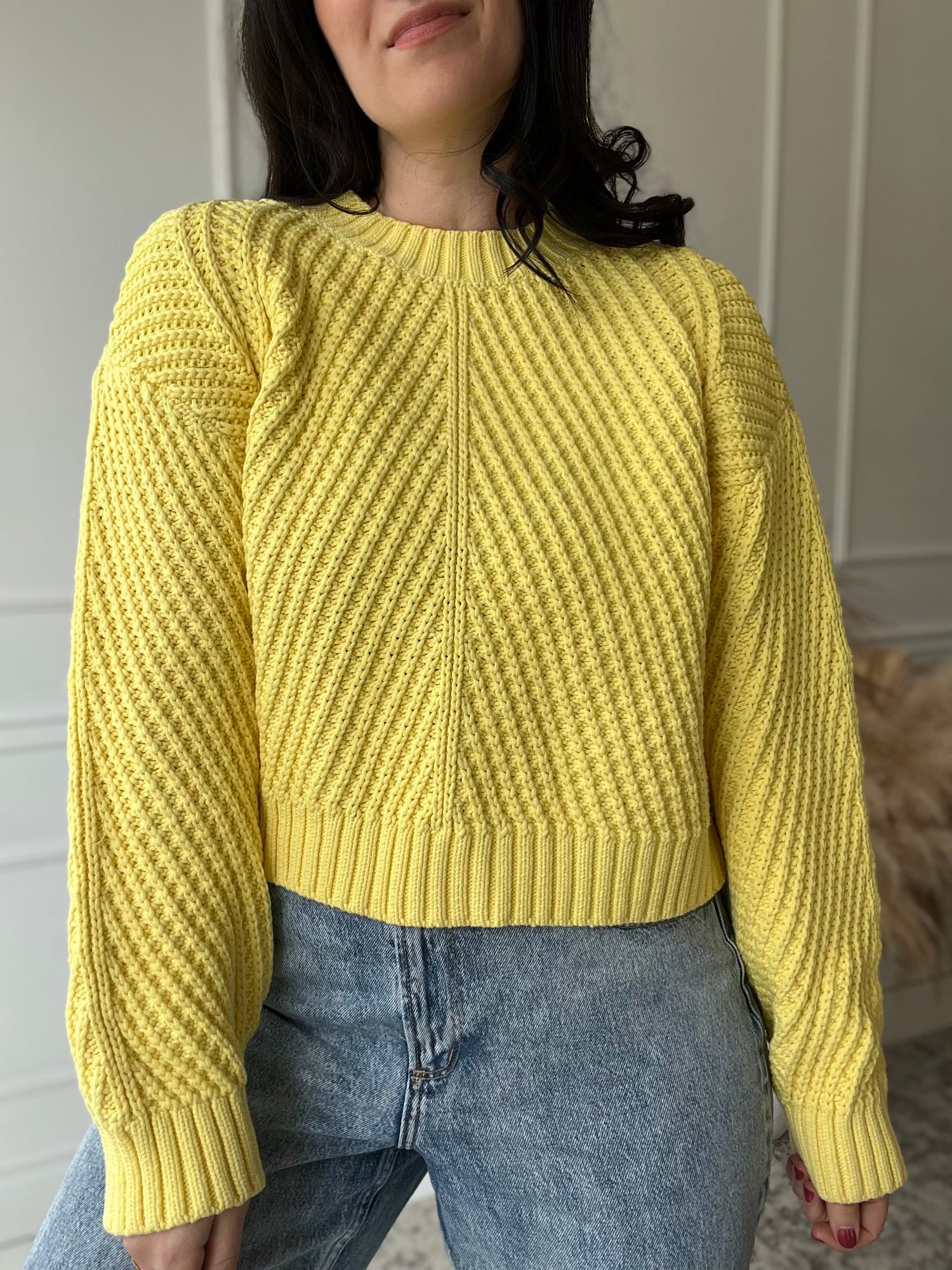 A bright, yellow sunshine chunky sweater with gorgeous thick knit. This sweater is not crop length, but almost. Crew neckline and oversized arms. This sweater is tagged a small, however it fits very oversized (ie. I would wear it as a size large).