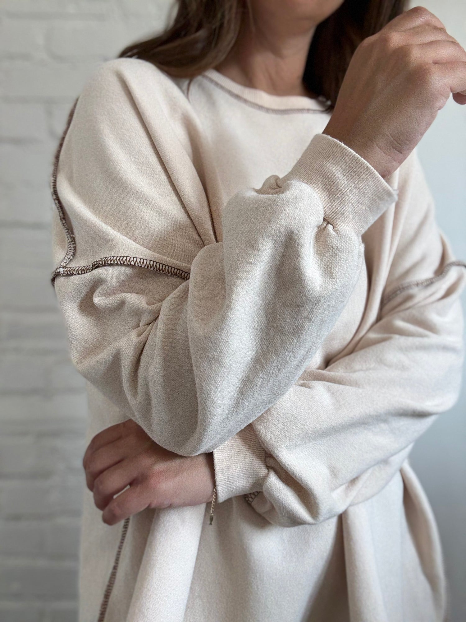 An Oak + Fort ultra oversized ivory sweater, with a chocolate brown stitch detail. Loose hem, oversized arms with drop shoulders, and crew neckline. Ribbed at cuffs. Tagged a small, but could be oversized on an XL. Ultra-soft, ultra-comfortable. Mint condition.