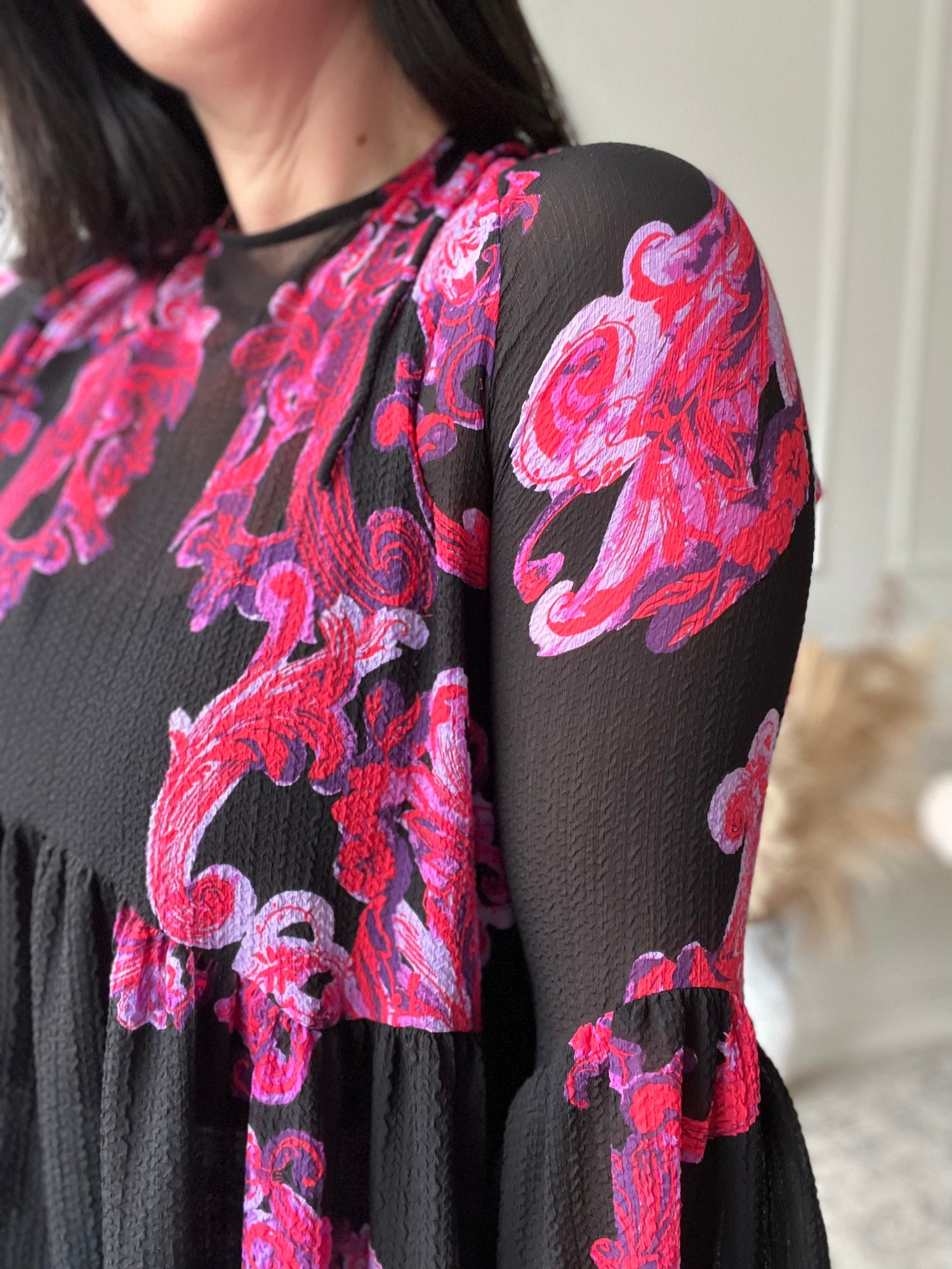 Intimately Free People printed symphony black and hot pink sheer, unlined tunic dress. A very boho-style with a loose and oversized fit, and belle sleeves.