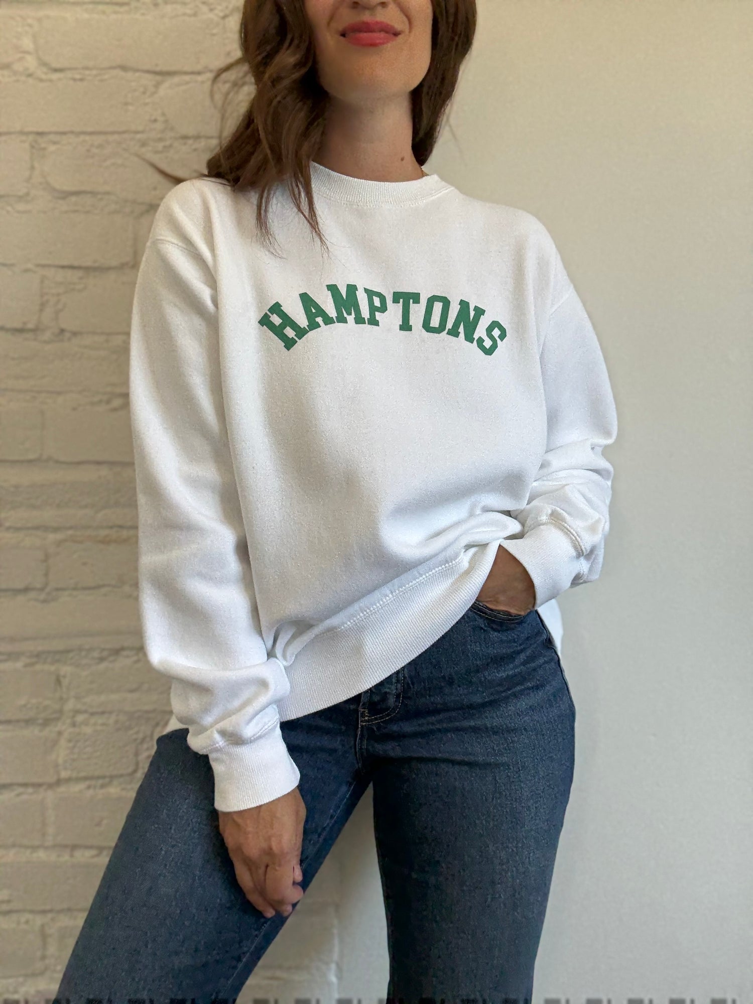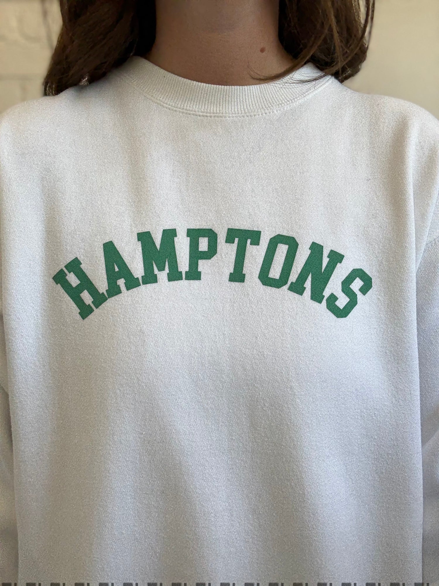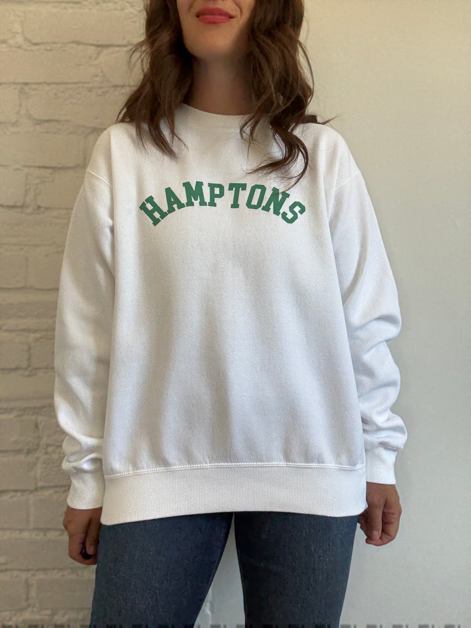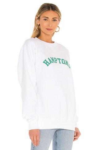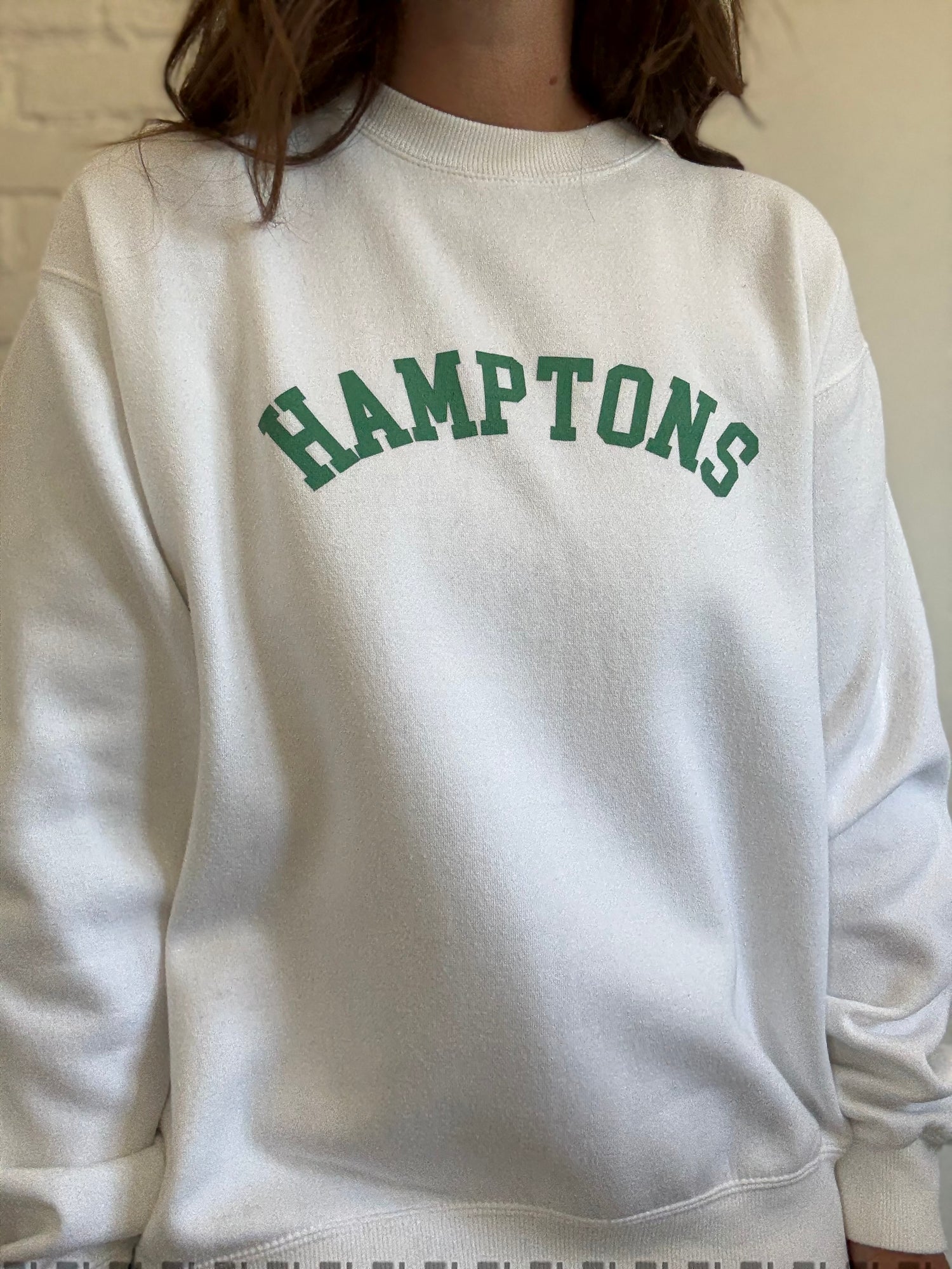 We might not be going to the Hamptons, but we can sure act like it. Rep the bougie south with this starch white crewneck sweater, and "Hamptons" written across the chest in a beautiful muddy emerald green. Inside is a plushy soft fleece, and the cotton structure is nothing but luxury. Dropped shoulders, long sleeves, and a ribbed hem. Mint condition. Retails on Revolve for $140 CDN.