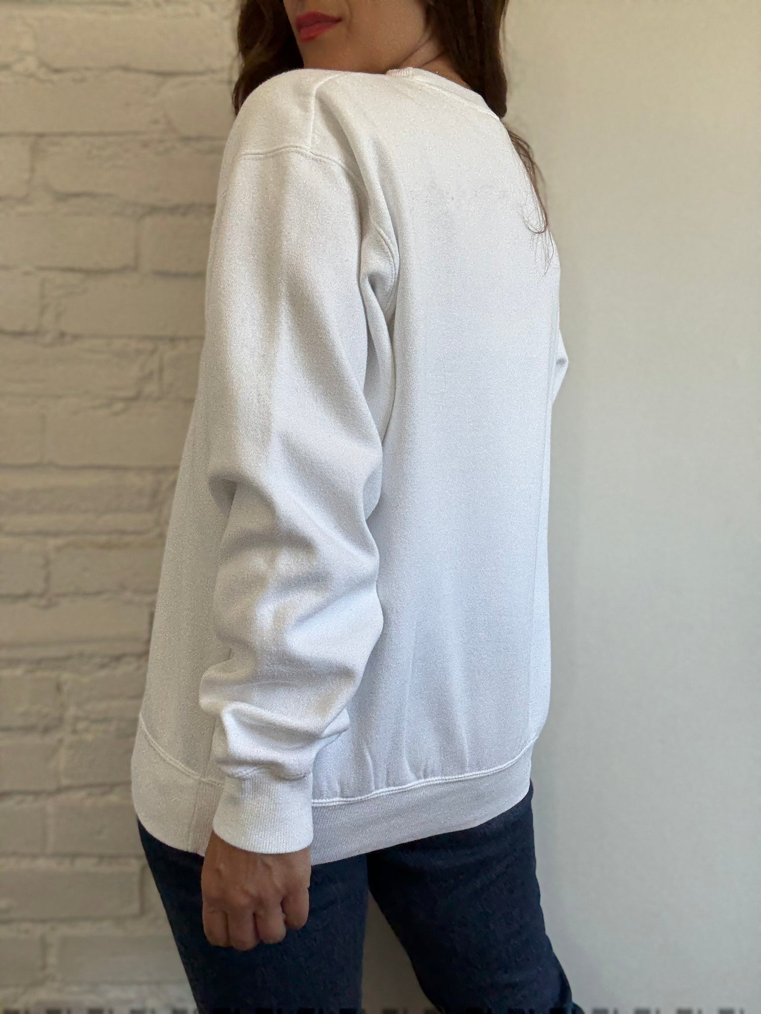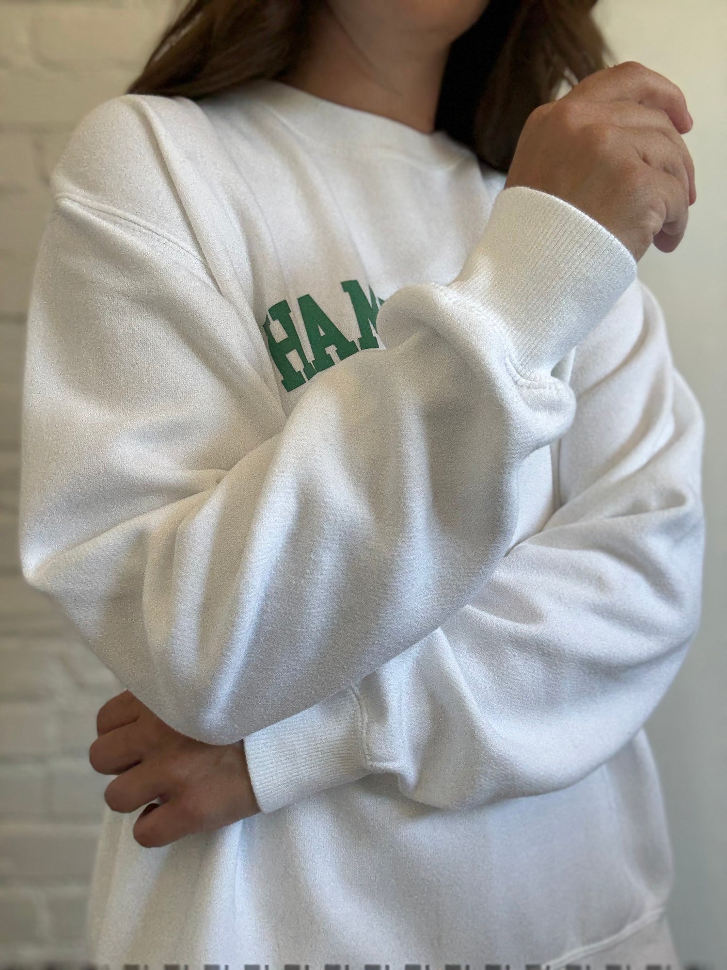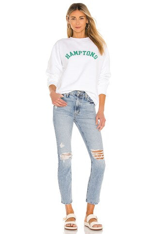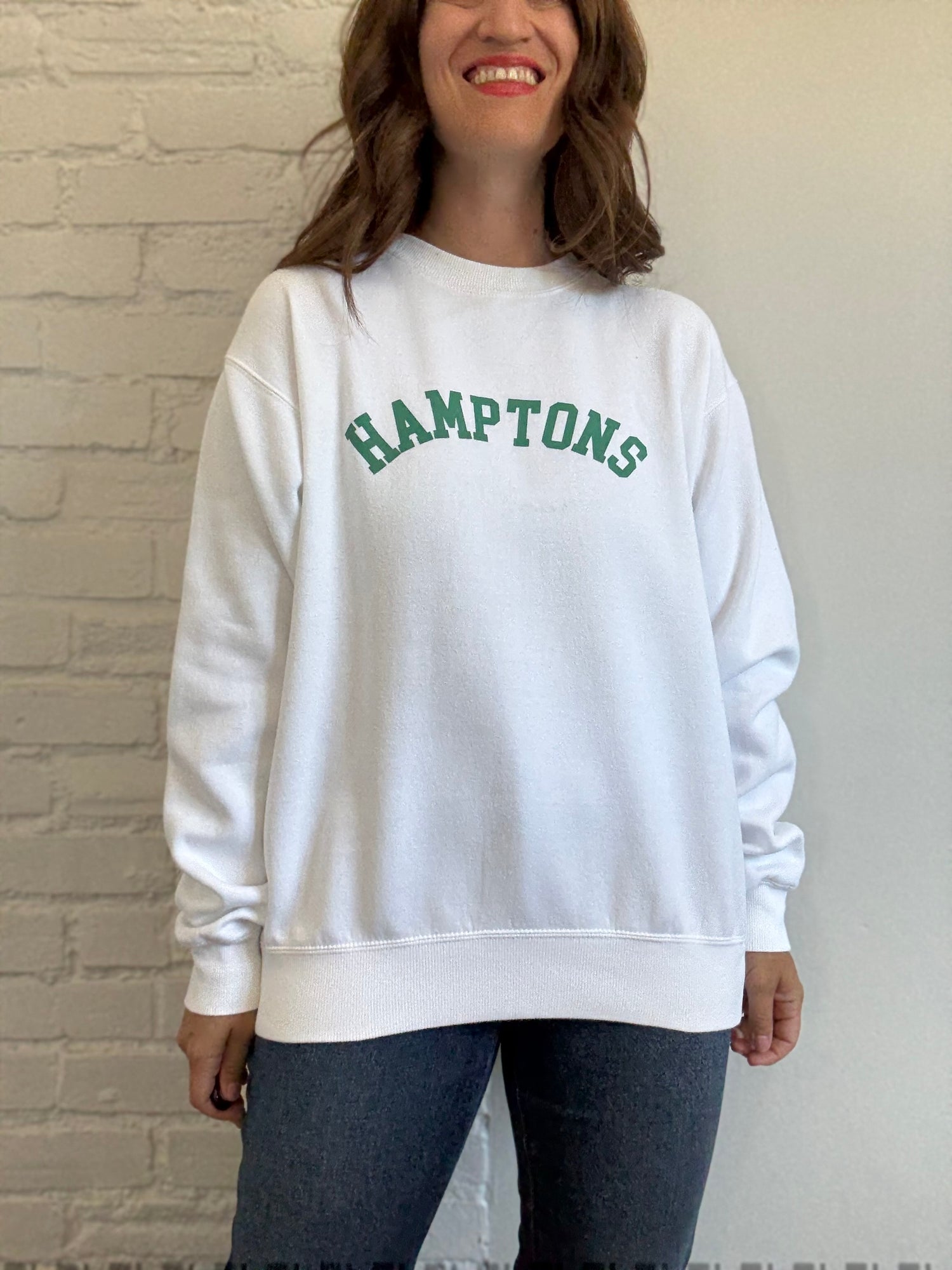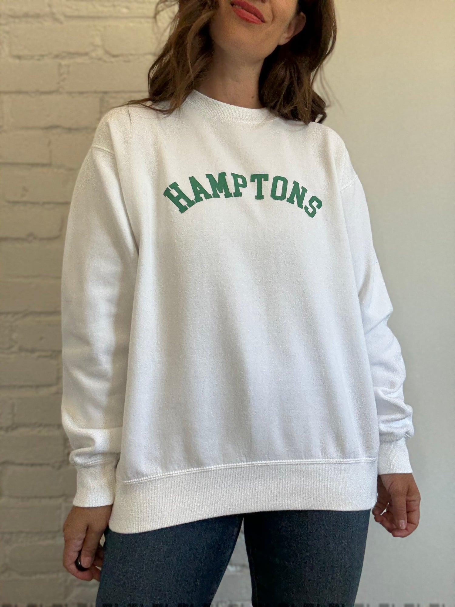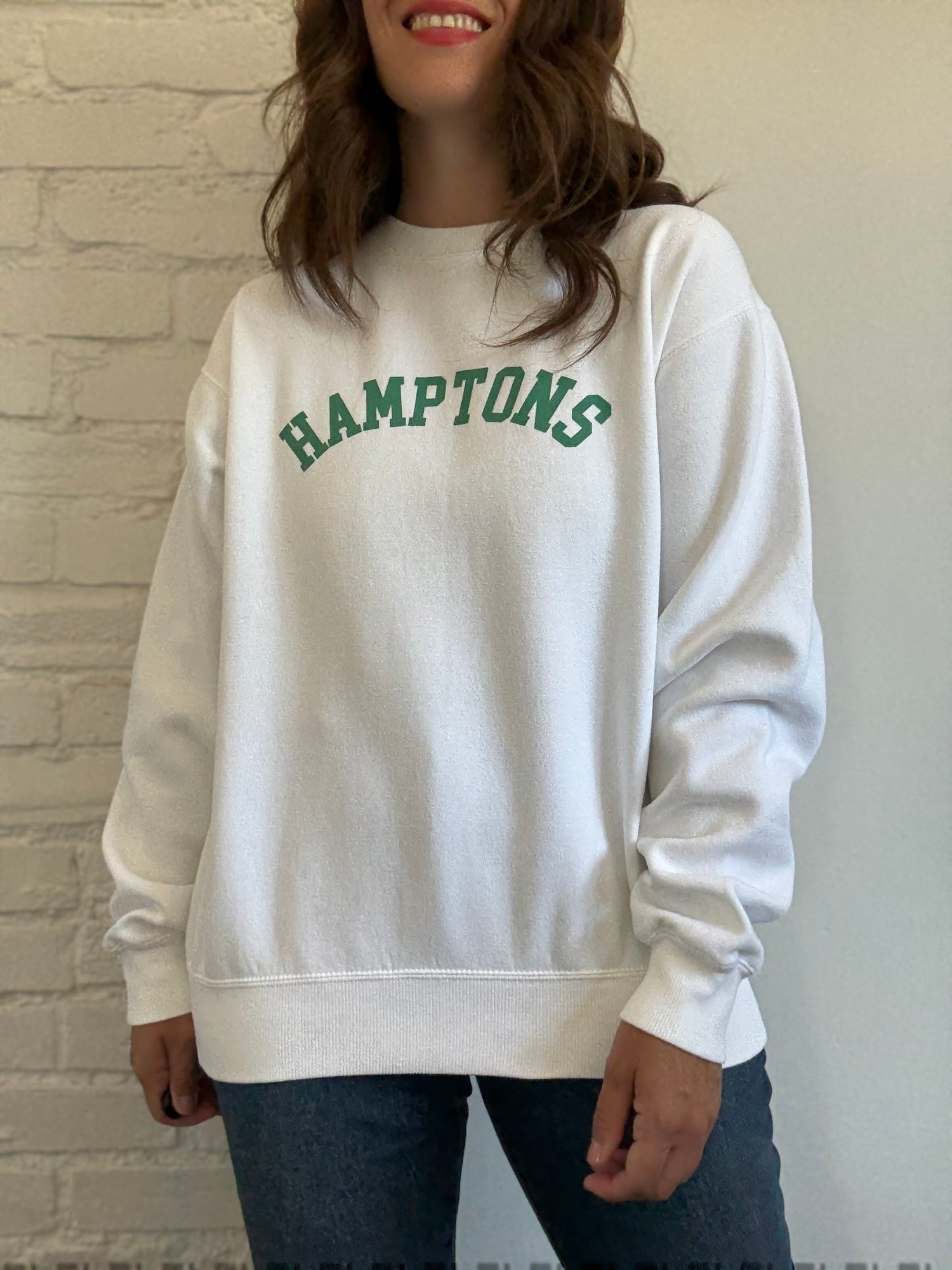 We might not be going to the Hamptons, but we can sure act like it. Rep the bougie south with this starch white crewneck sweater, and "Hamptons" written across the chest in a beautiful muddy emerald green. Inside is a plushy soft fleece, and the cotton structure is nothing but luxury. Dropped shoulders, long sleeves, and a ribbed hem. Mint condition. Retails on Revolve for $140 CDN.