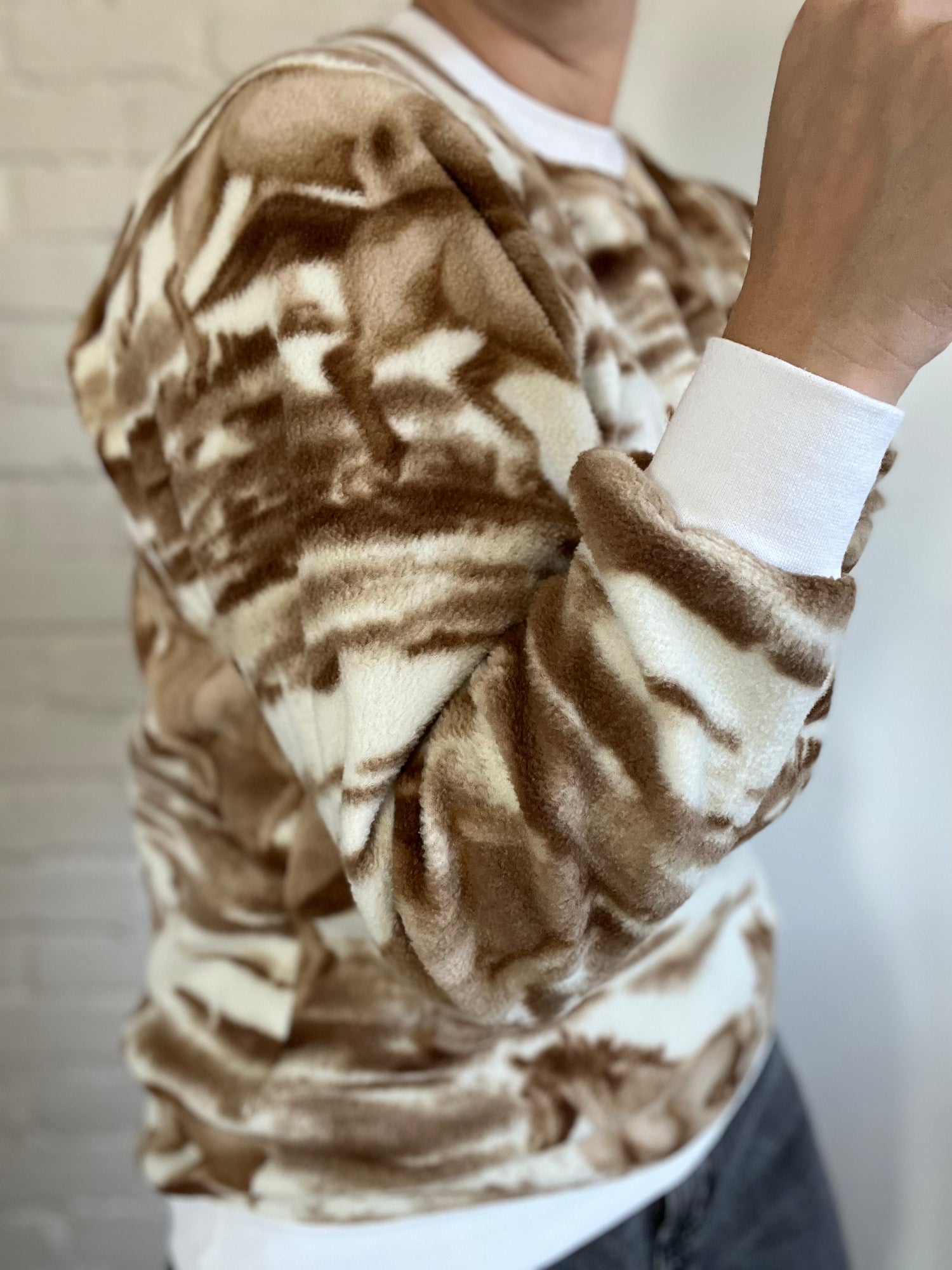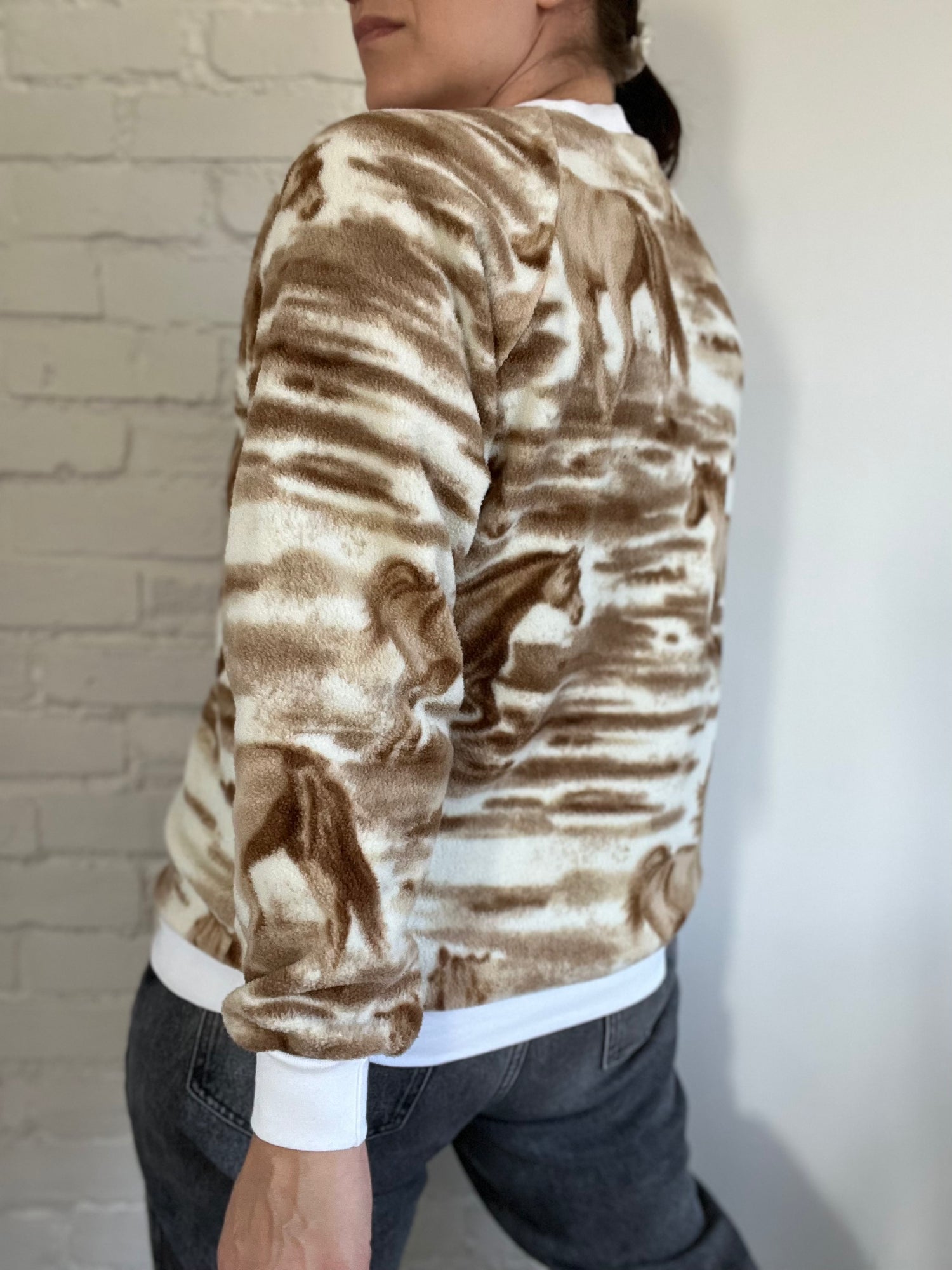 A super playful and stylish crewneck fleece sweater, showing neutral coloured horses on an ivory backdrop. Starch white rim around neck, cuffs and hemline. Design wraps around entire piece, and is the perfect go-to for chilly nights ahead. Made in Canada!