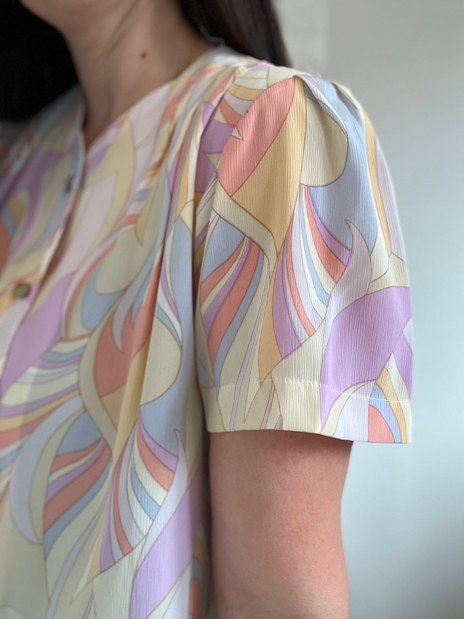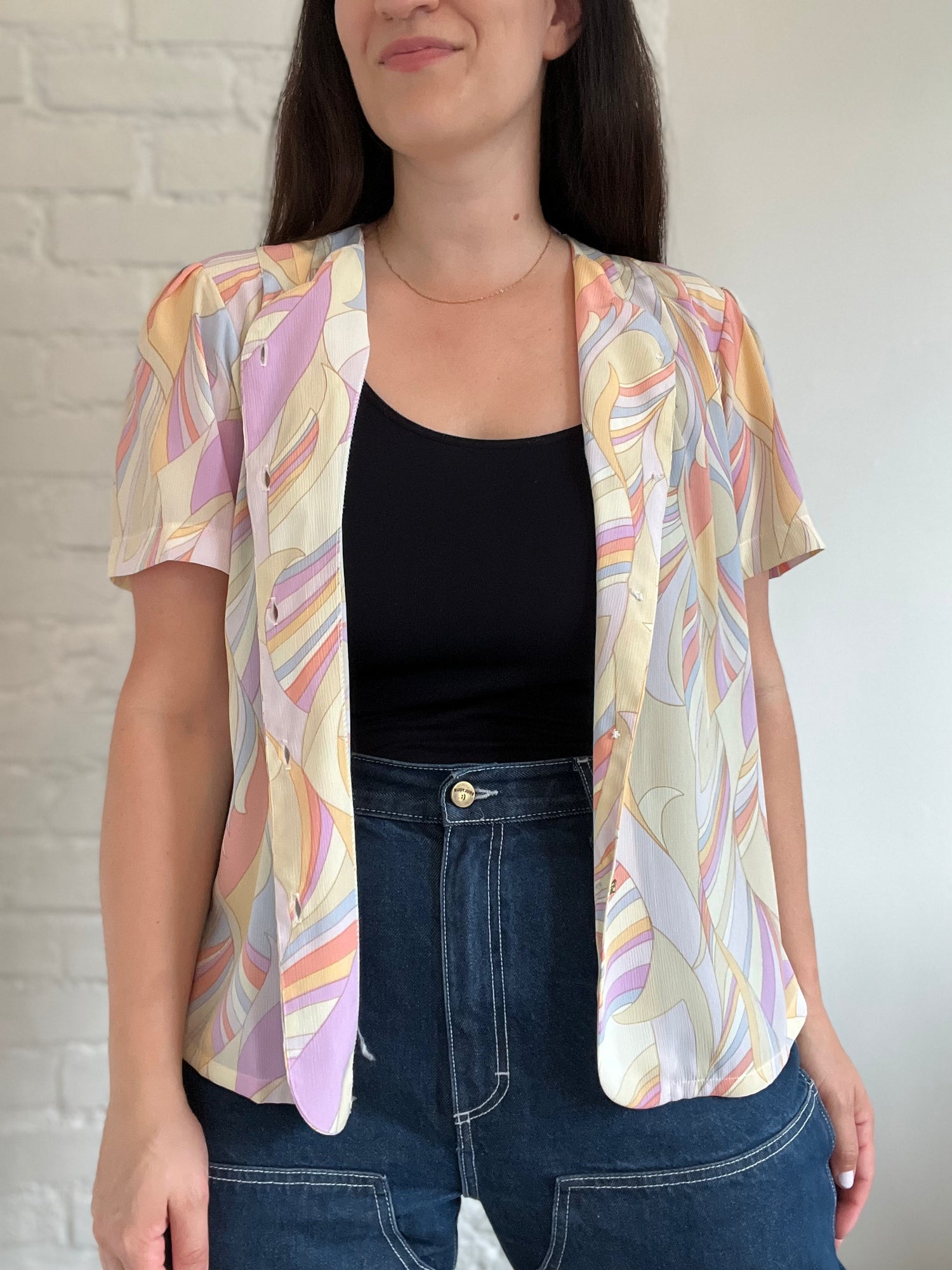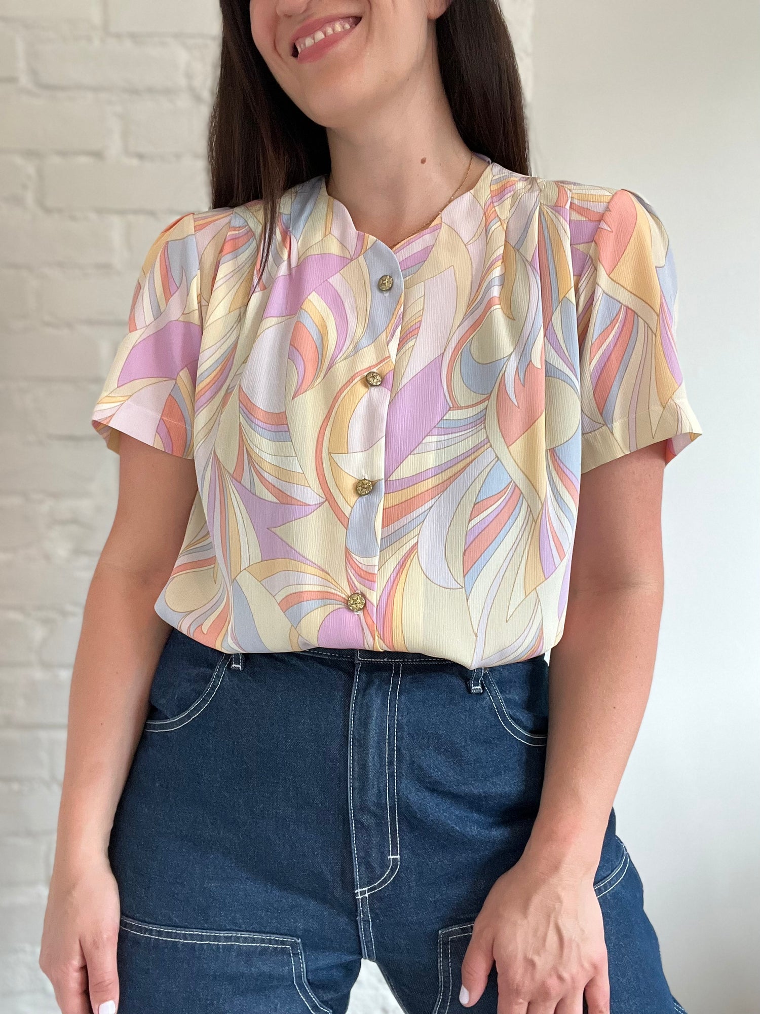 A pastel button up shirt that screams ice cream swirl and summer style. Scalloped neckline, and rustic gold buttons. The retro top is playful, elegant and just plain fun.