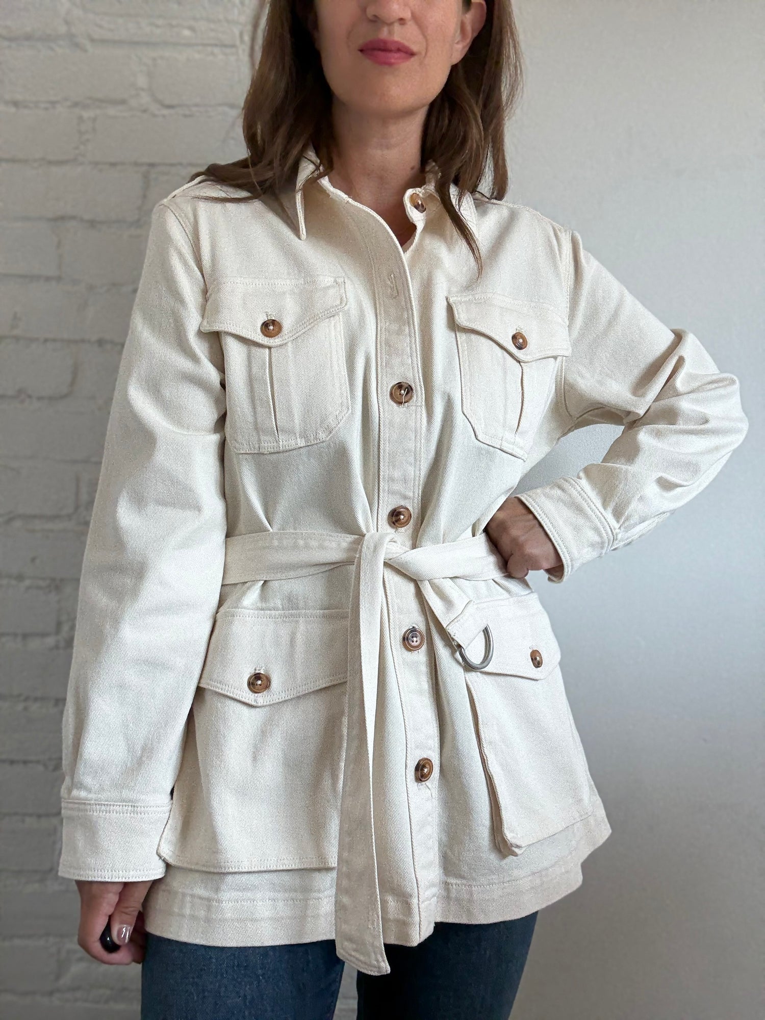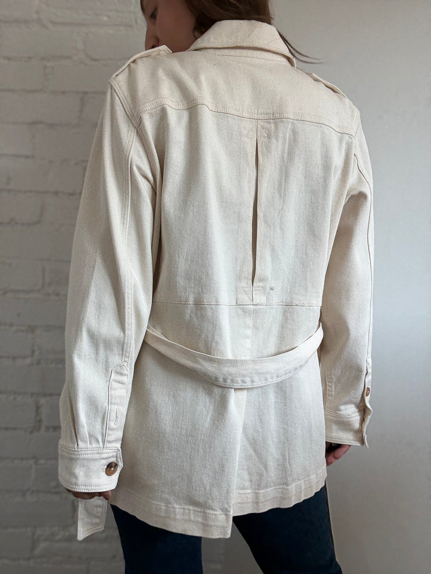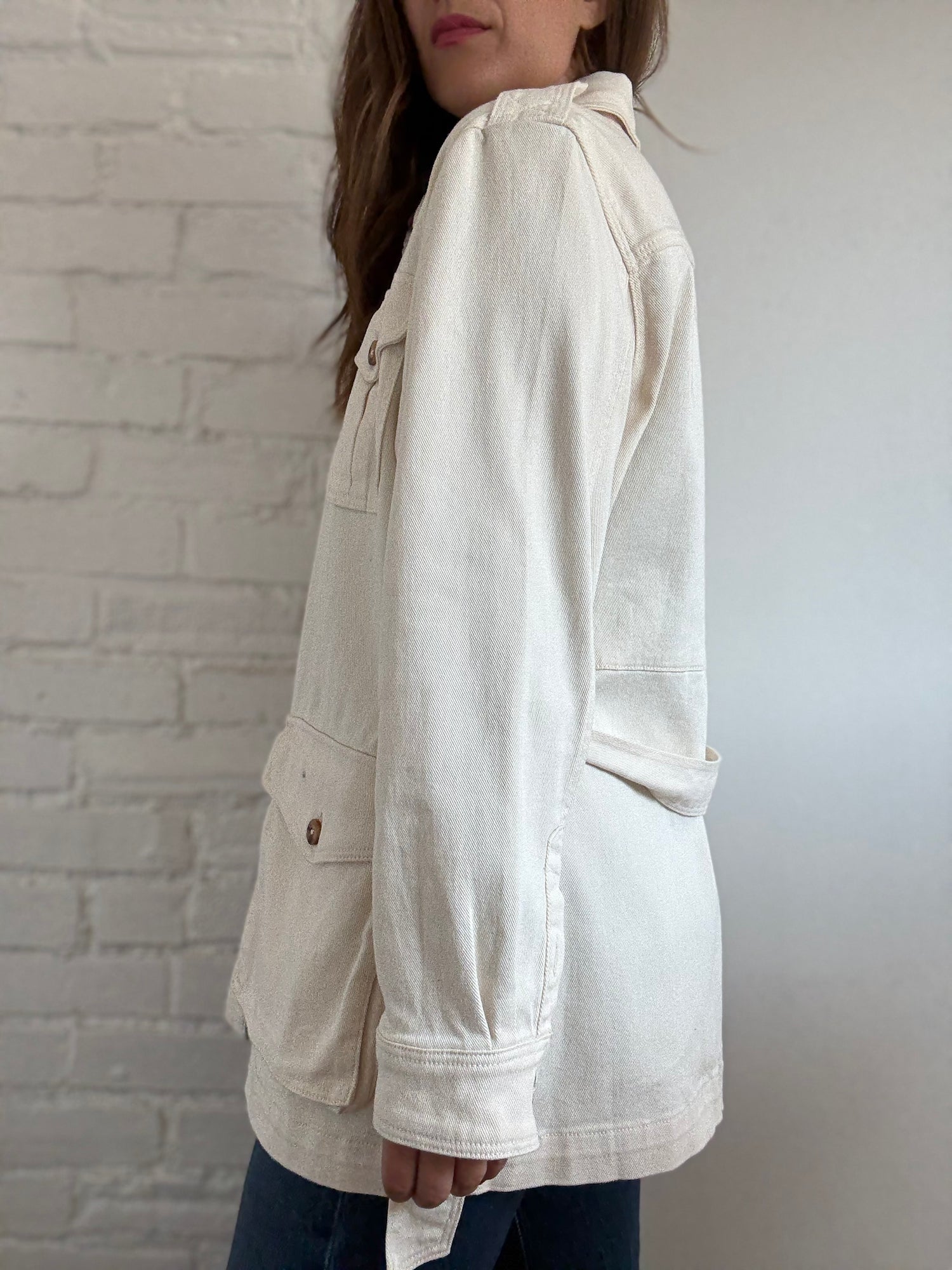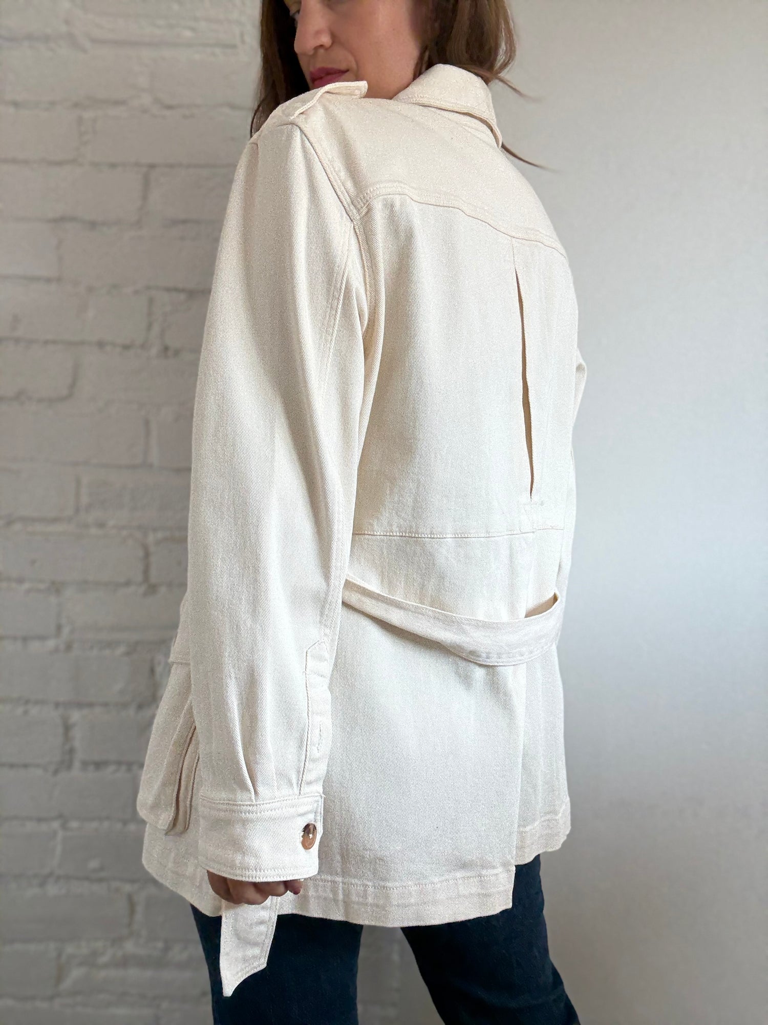A cargo jacket made from a soft denim cotton, that is oh so comfy. Multiple functional pockets, accented with brown marble buttons. Front button closure, and a waist tie to style loose or tight. Pleat in mid-back area, and shoulder straps. Mint condition, like brand new.