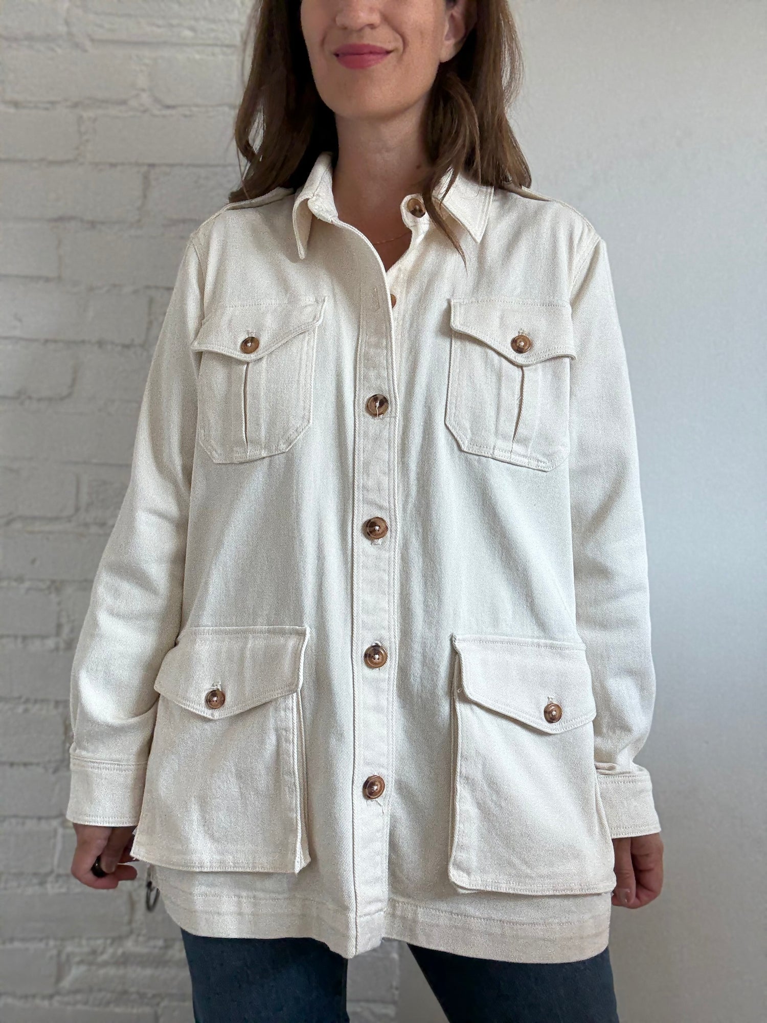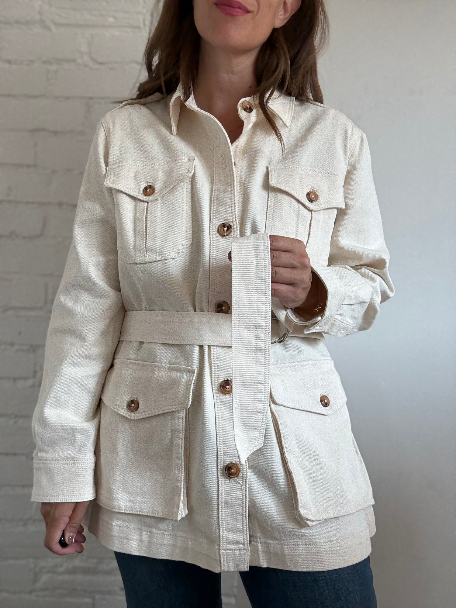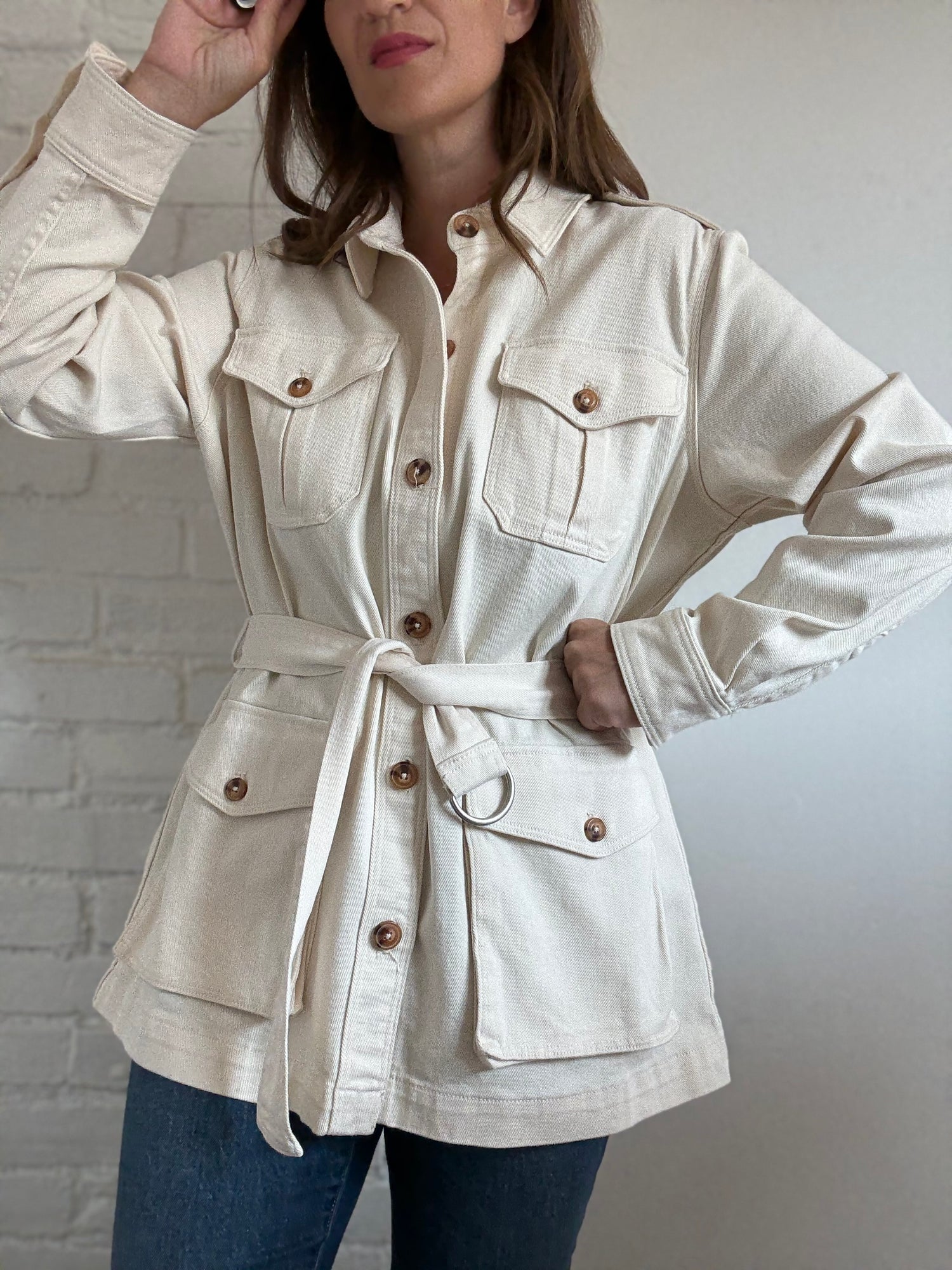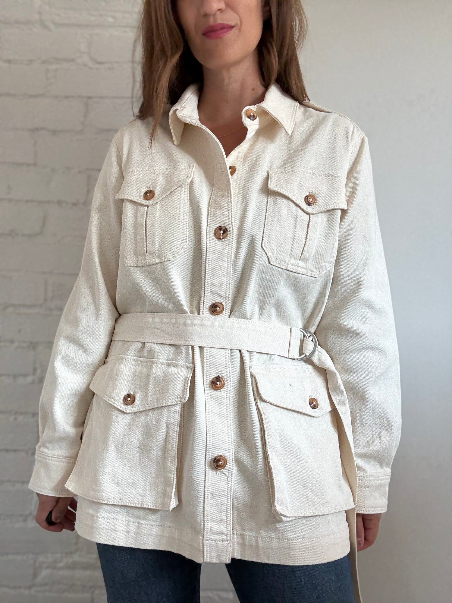 A cargo jacket made from a soft denim cotton, that is oh so comfy. Multiple functional pockets, accented with brown marble buttons. Front button closure, and a waist tie to style loose or tight. Pleat in mid-back area, and shoulder straps. Mint condition, like brand new.