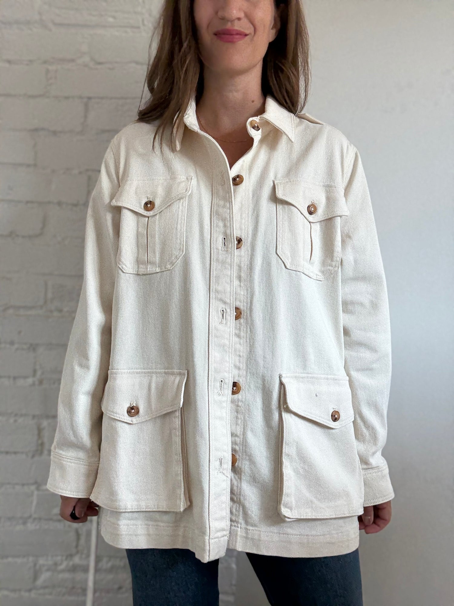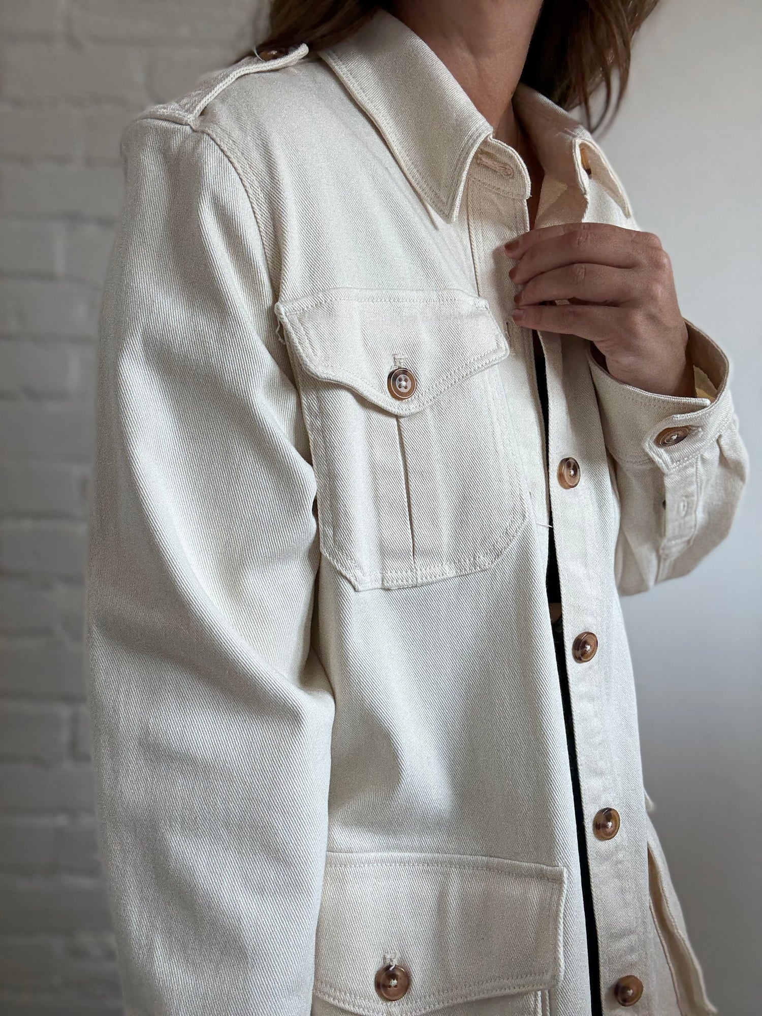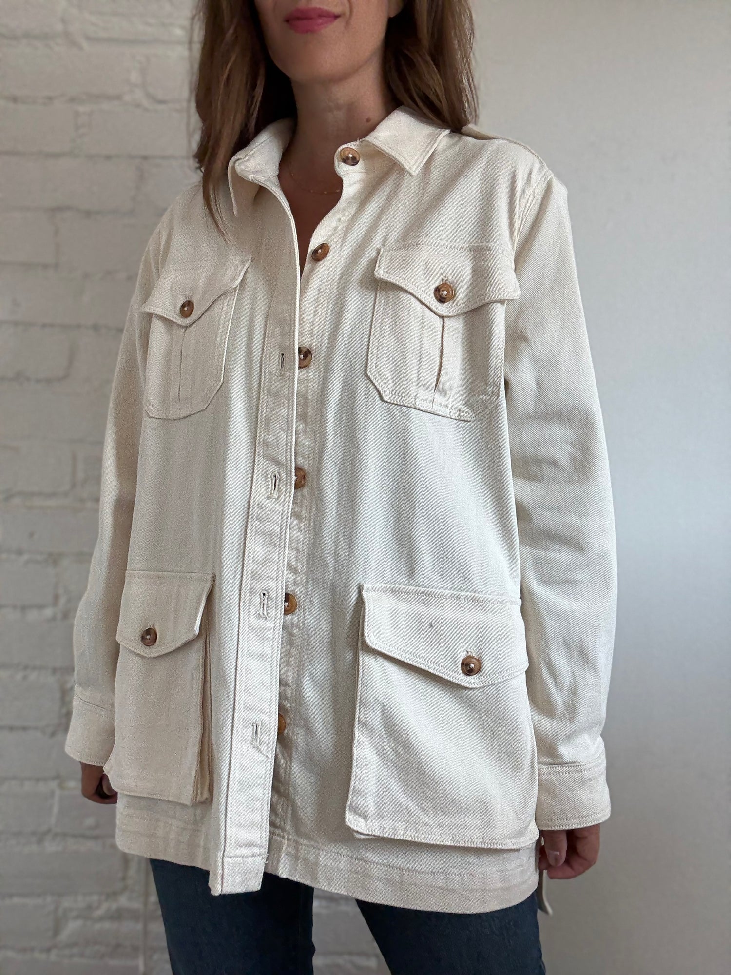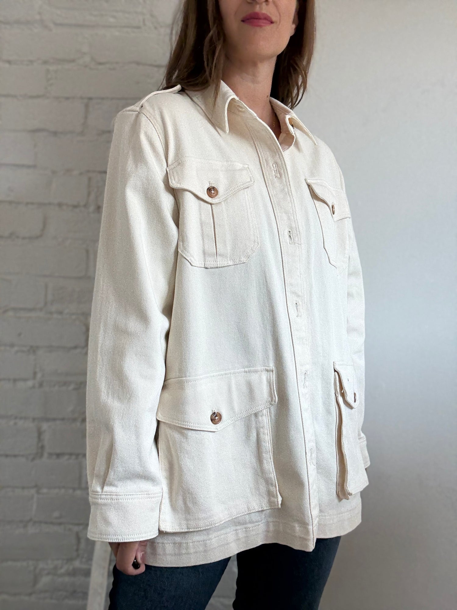 A cargo jacket made from a soft denim cotton, that is oh so comfy. Multiple functional pockets, accented with brown marble buttons. Front button closure, and a waist tie to style loose or tight. Pleat in mid-back area, and shoulder straps. Mint condition, like brand new.