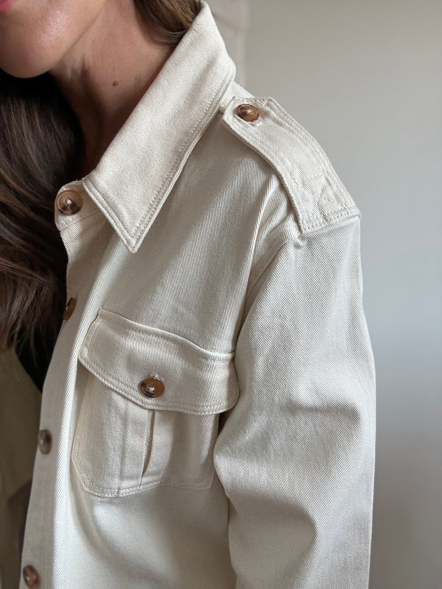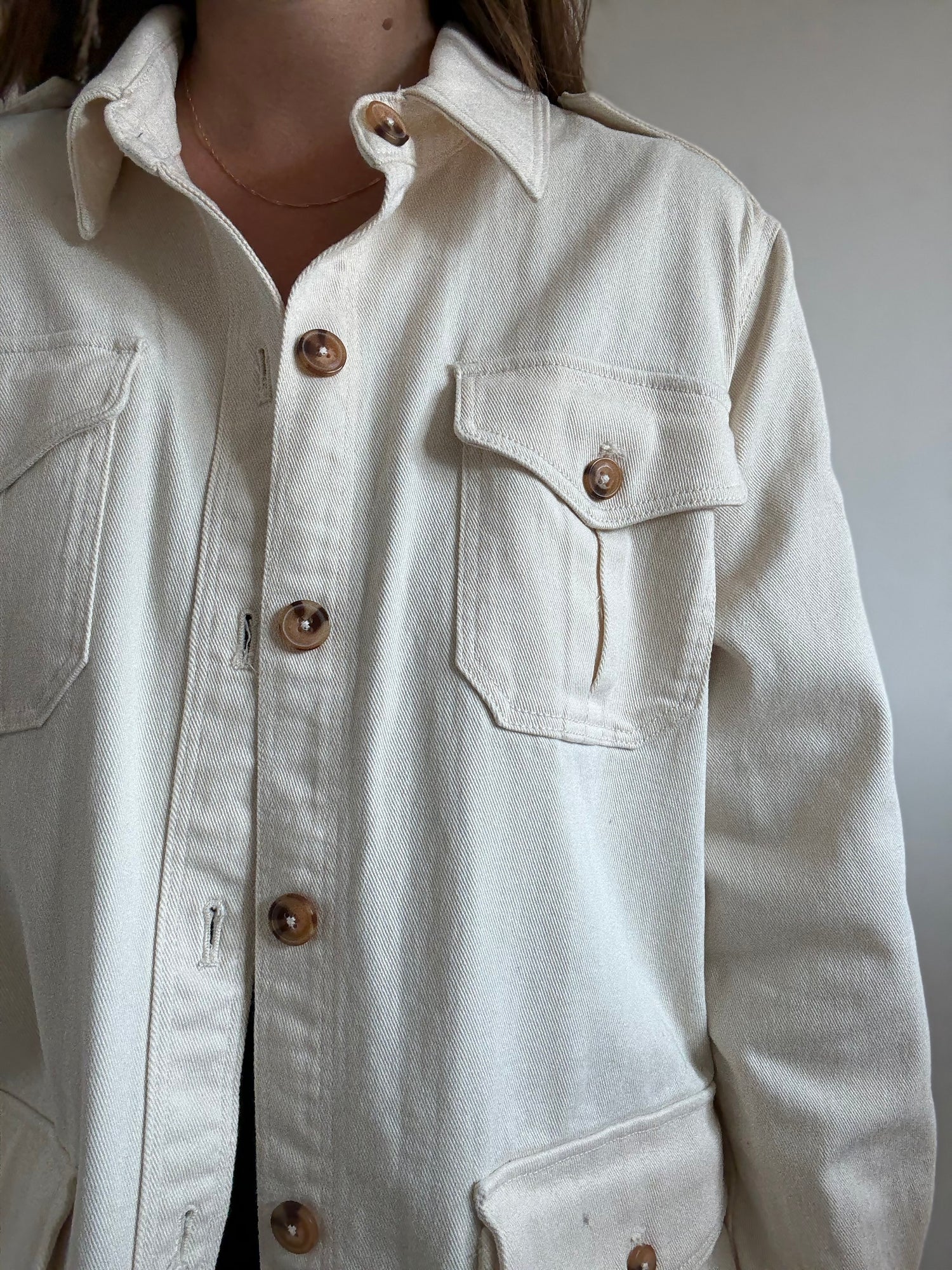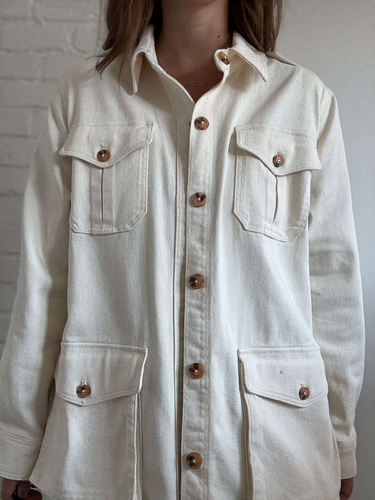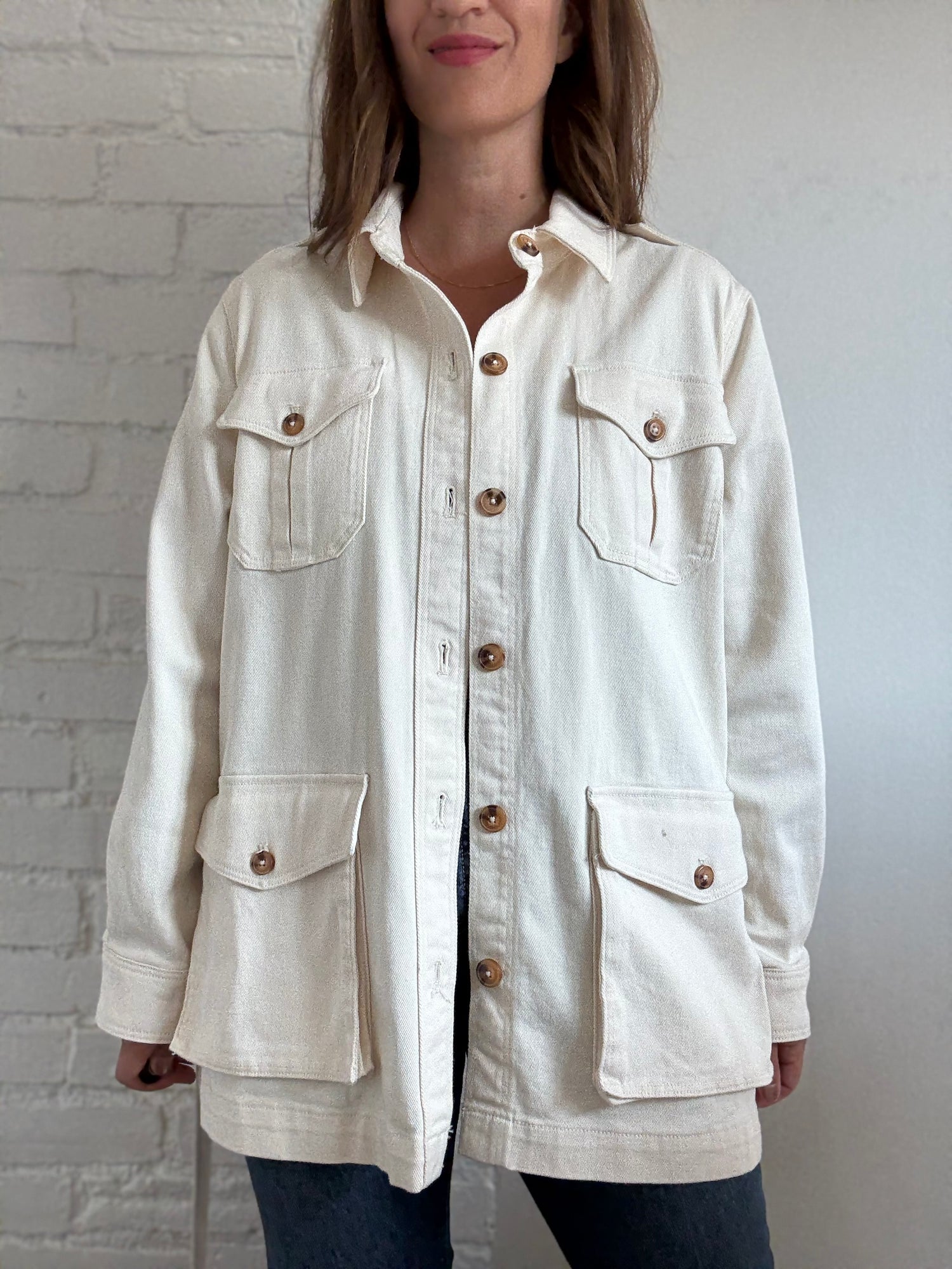 A cargo jacket made from a soft denim cotton, that is oh so comfy. Multiple functional pockets, accented with brown marble buttons. Front button closure, and a waist tie to style loose or tight. Pleat in mid-back area, and shoulder straps. Mint condition, like brand new.