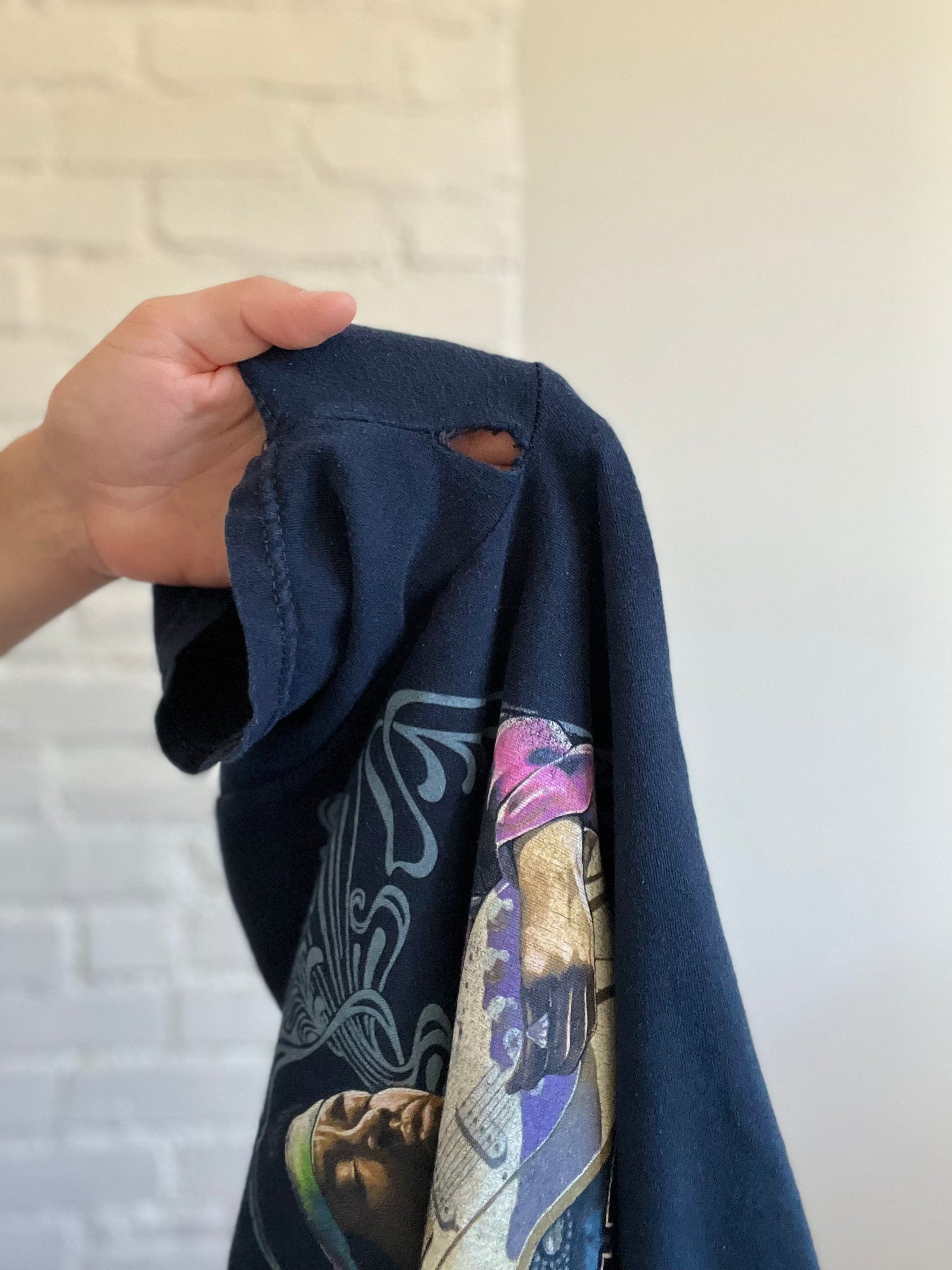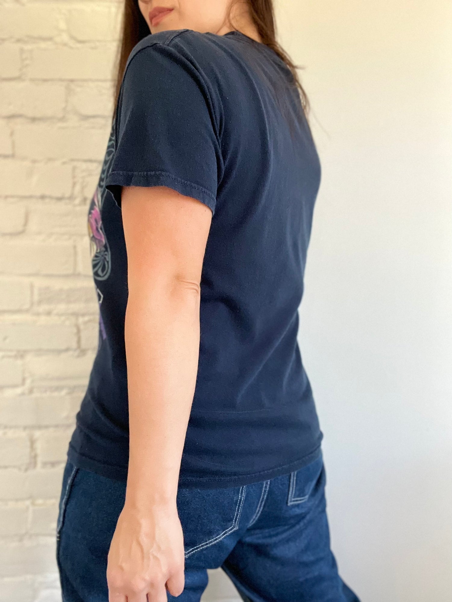 A beautifully rare vintage, Jimi Hendrix t-shirt labelled from 2006. The bright purple and pink on this navy blue background is rare. The graphic is slightly uncentered, likely to accommodate the large guitar. Also a minor hole in the armpit. Can be stitched, or left alone for its vintage character.