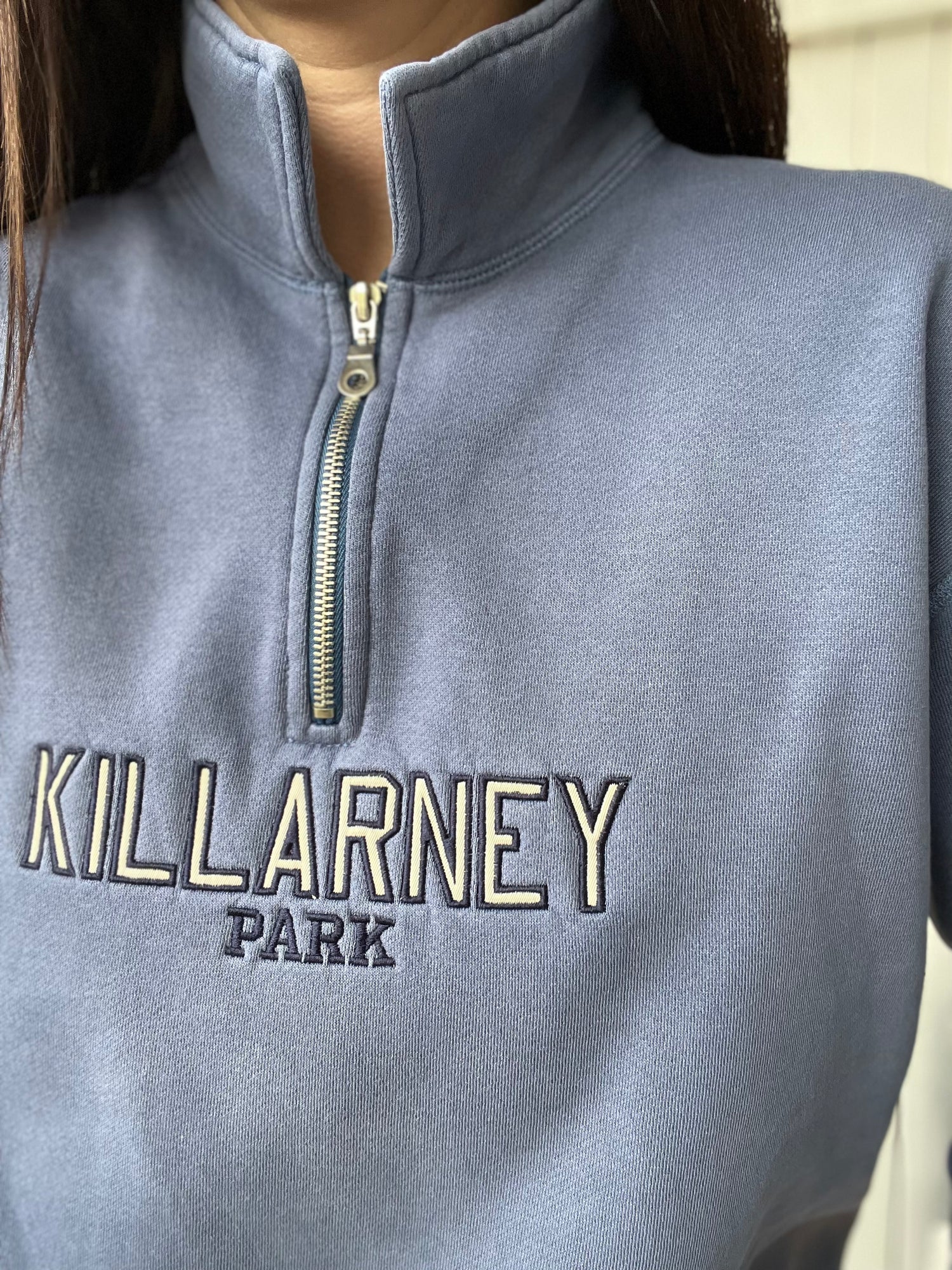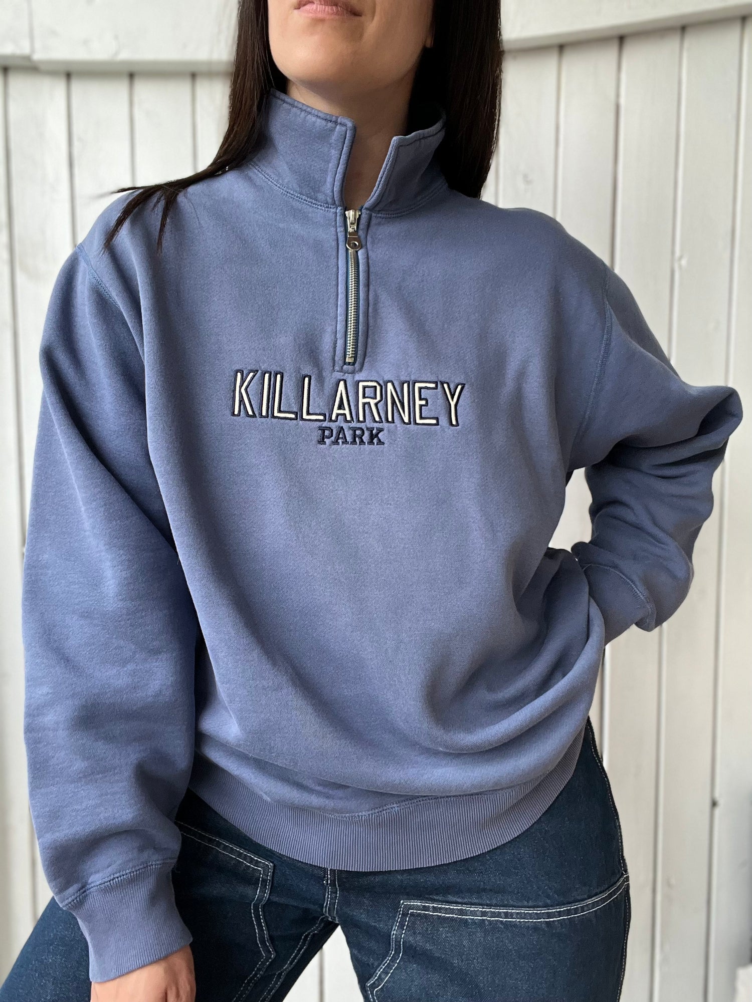 A vintage Killarney Park pullover sweater in excellent condition. Embroidered lettering across the chest and silver quarter zip on chest. The go-to sweater to cozy up with this summer. Slight wear on one cuff that adds to its vintage wear. The iconic Killarney Park is 645 square kilometre wilderness landscape that showcases the wild Georgian Bay Coast of pink granite; the La Cloche Mountains’ white quartzite ridges and over 50 exceptionally clear, sapphire lakes set among Jack Pine hills.