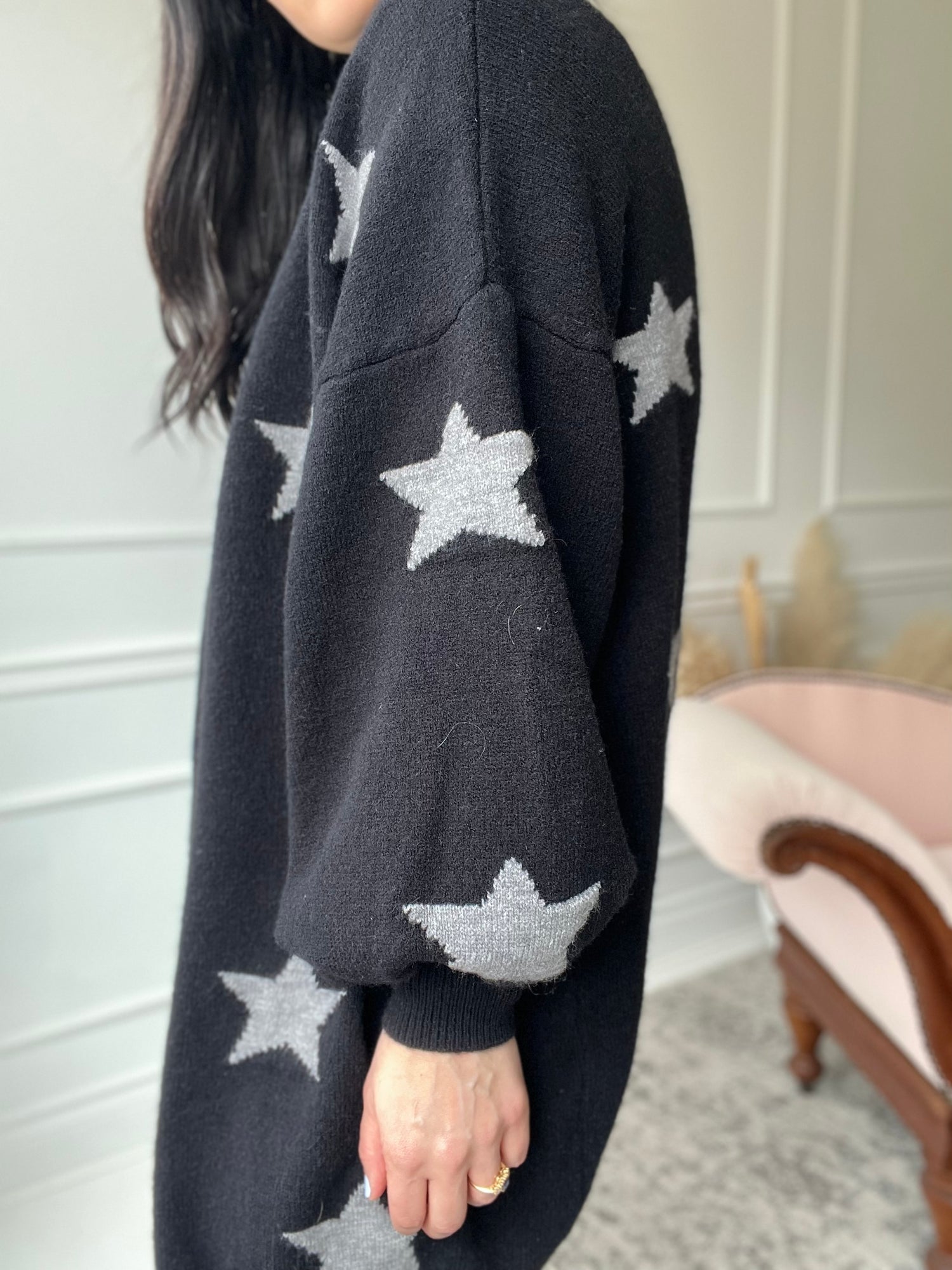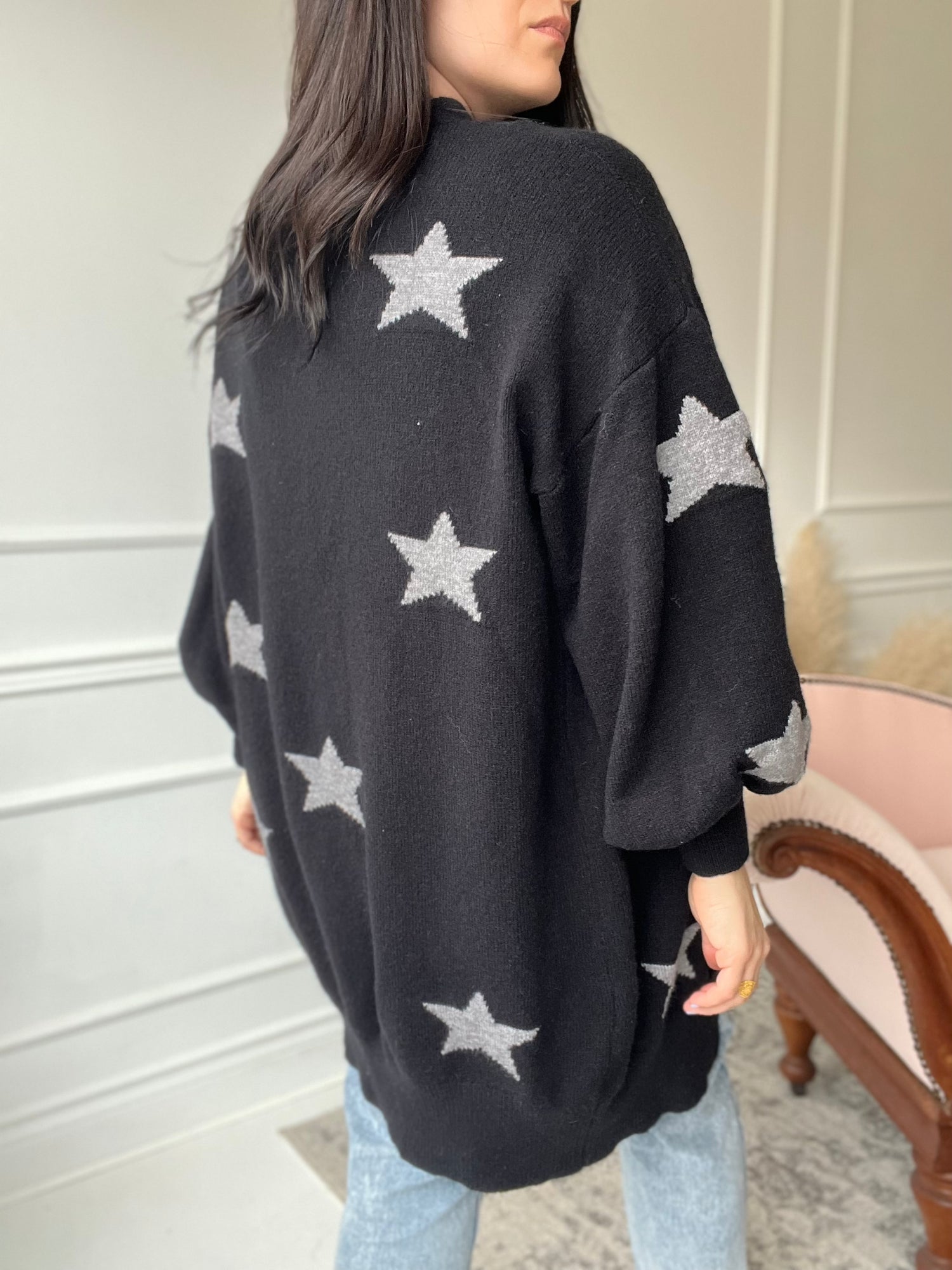 An extra long, chunky soft knit cardigan with grey stars throughout. The sleeves are slightly oversized that are tapered around the wrist. Can be buttoned up, or worn open. It feels and looks brand new, and is SUPER cozy. Would look excellent with a plain tee, or a tank top.