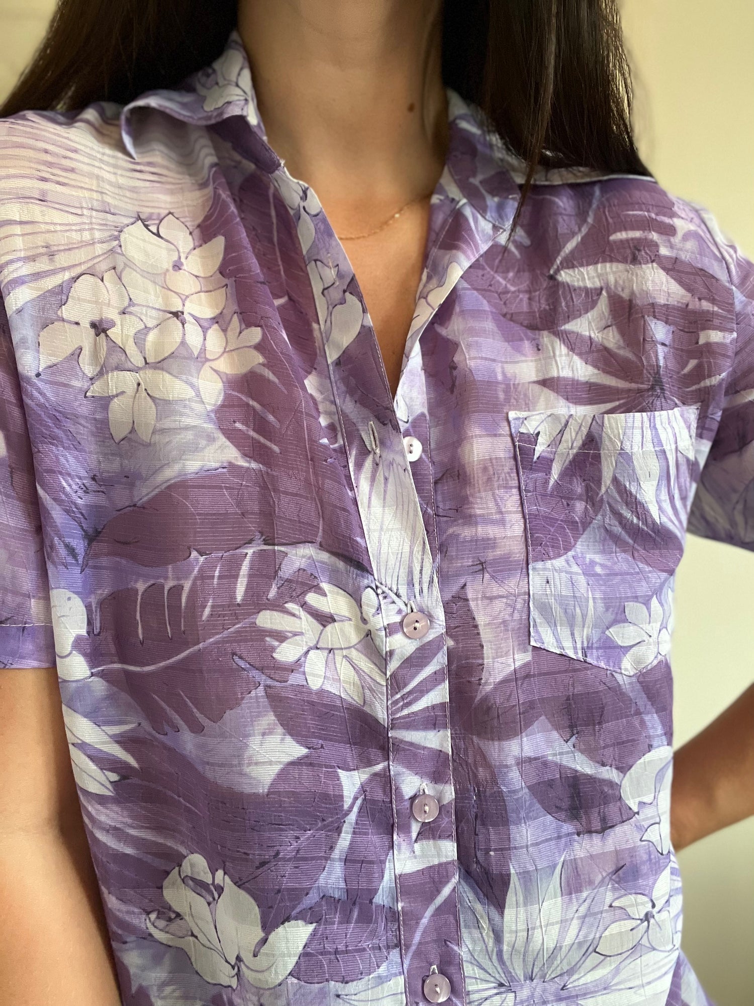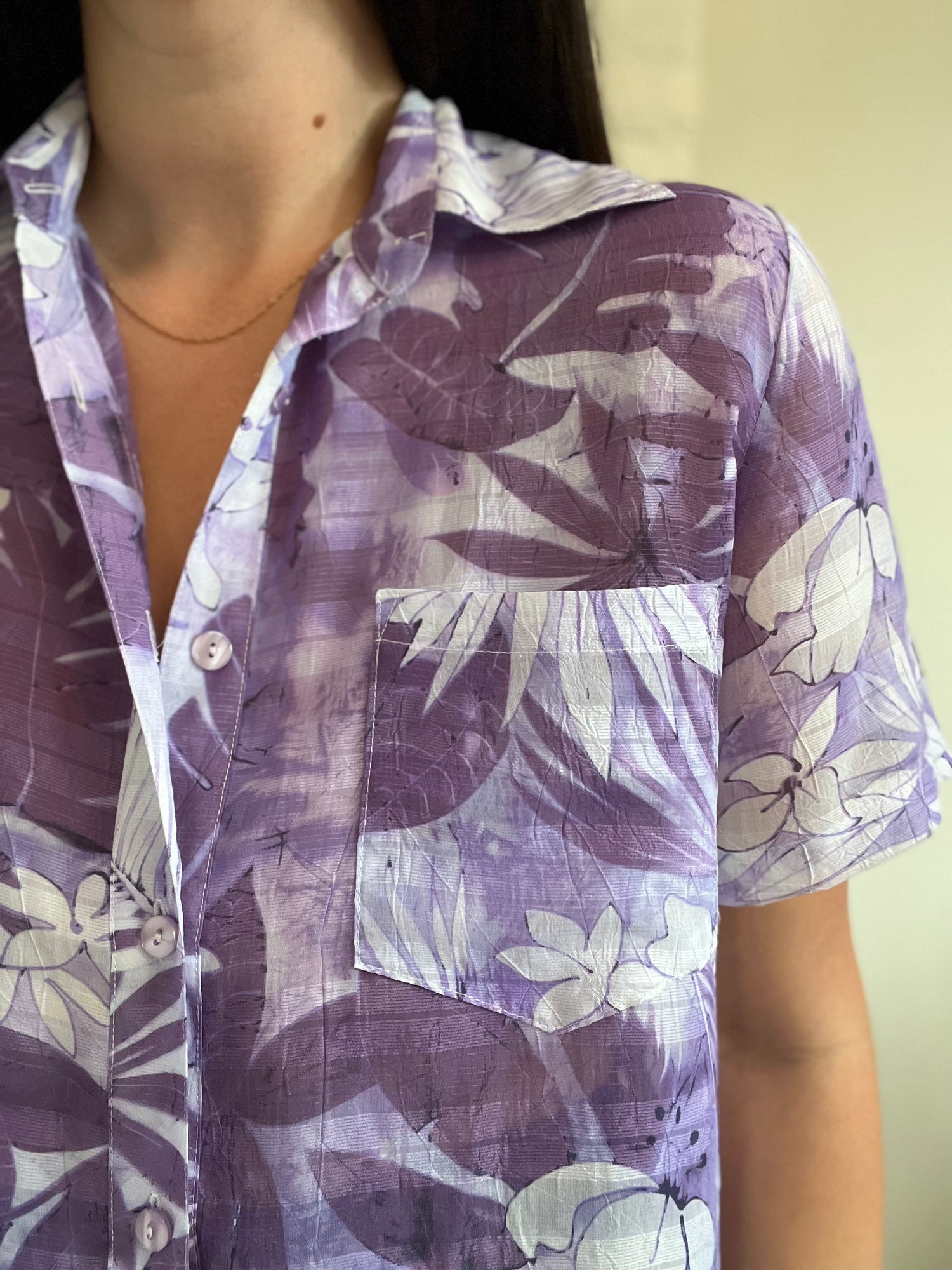 A flowy, see-through lavender and white floral button up top. Front pocket detail, slit along sides. The perfect, island summer vibes.