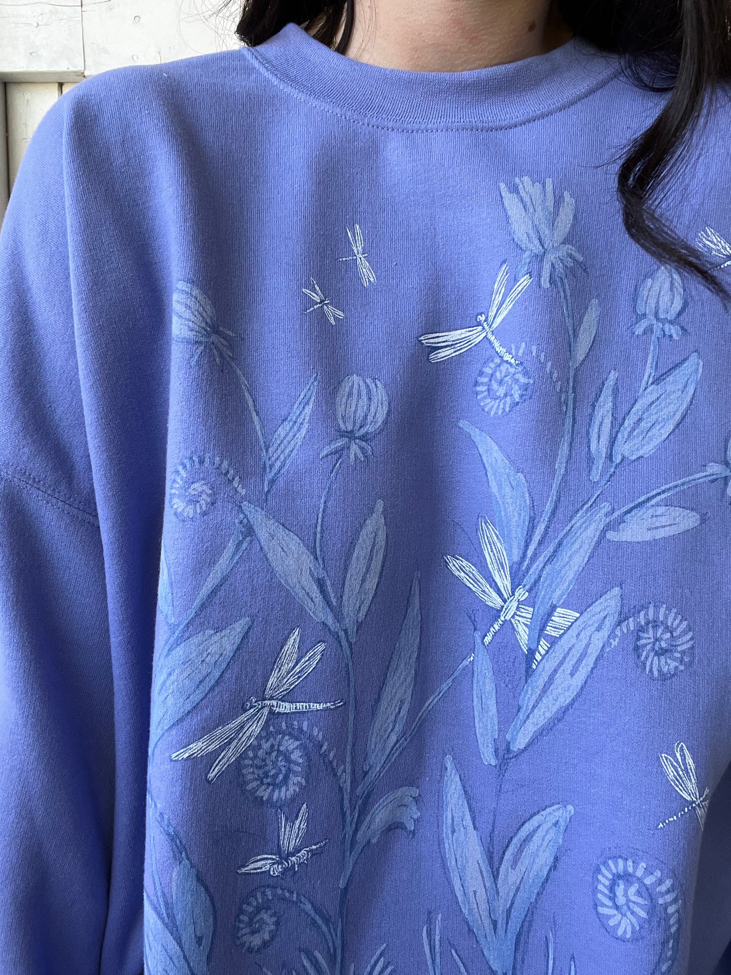 A gorgeous, oversized and extra plushy sweater featuring dragonflies, flower and grass. Artist name in bottom corner. Extra large sleeves that contrast the unfinished hem. Relaxed fit, and gorgeous pop of colour.