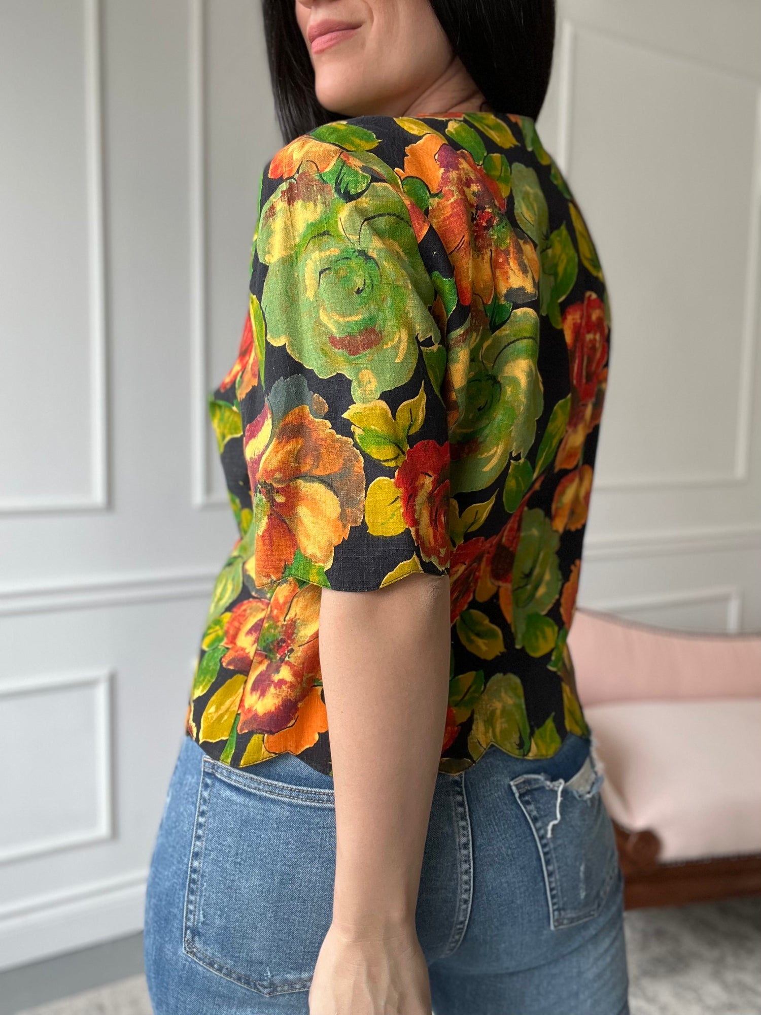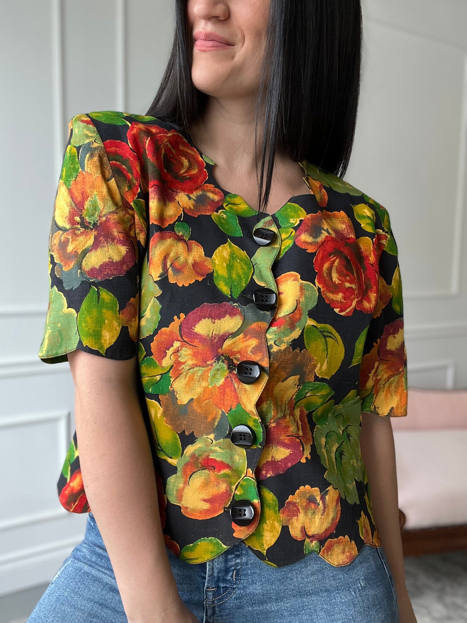 A 100% linen floral top with a scalloped neckline and hem, and oversized black buttons in front. The oversized florals add such a pop, and striking feature. The tag reads size 18, but the top fits like an XL.