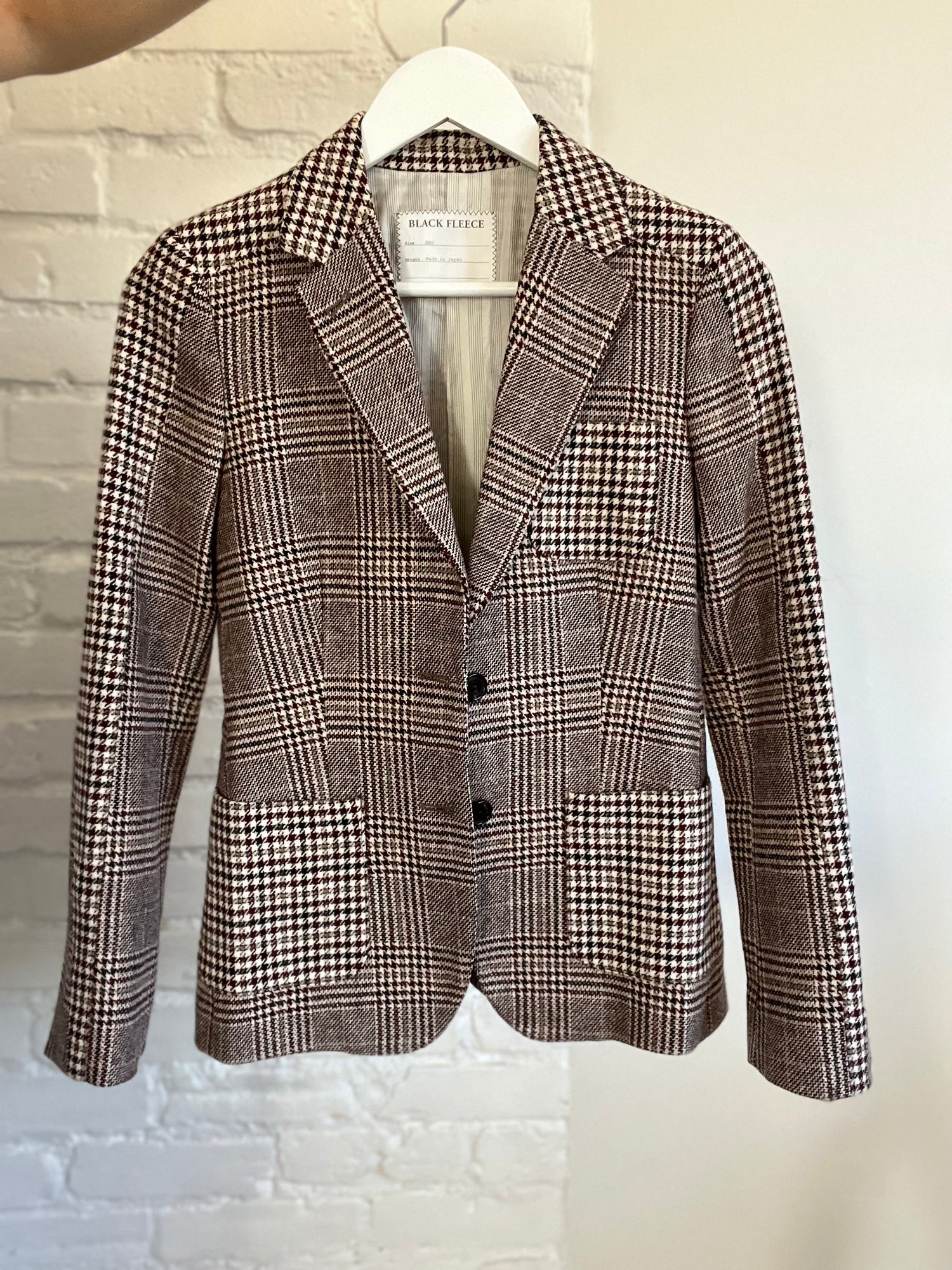 A beautifully, medium weighted mini-plaid blazer. Two front pockets and a 2-button closure in front. The plaid differences against one another pull together the sophistication of this blazer, and high quality design. Lined, and medium weighted.