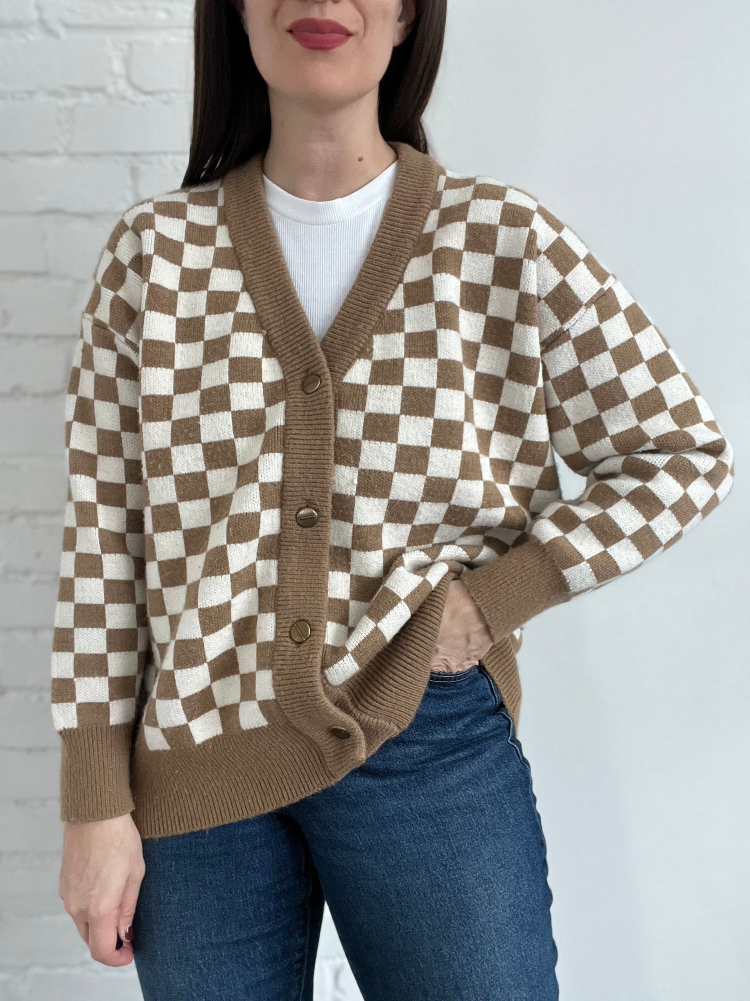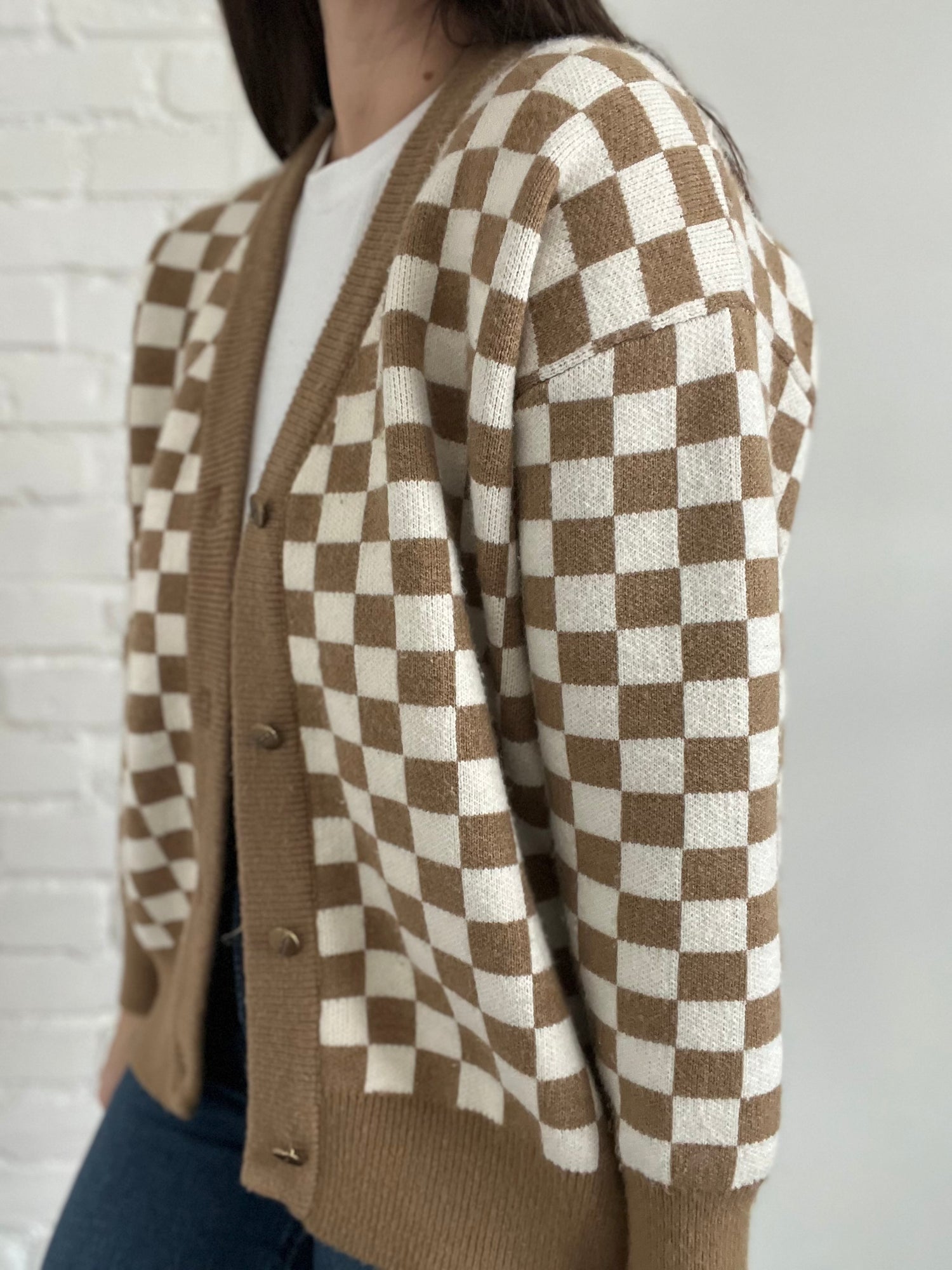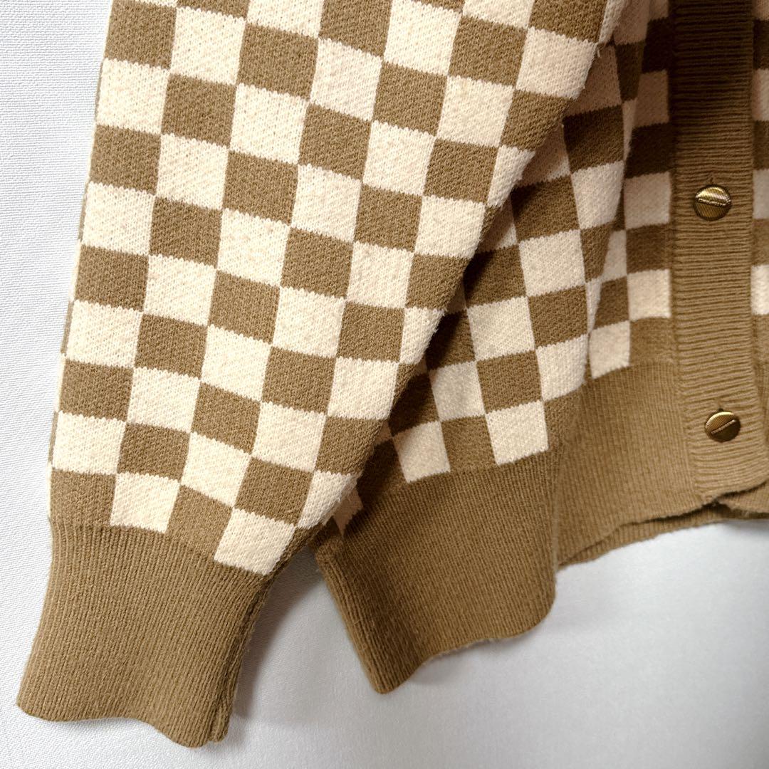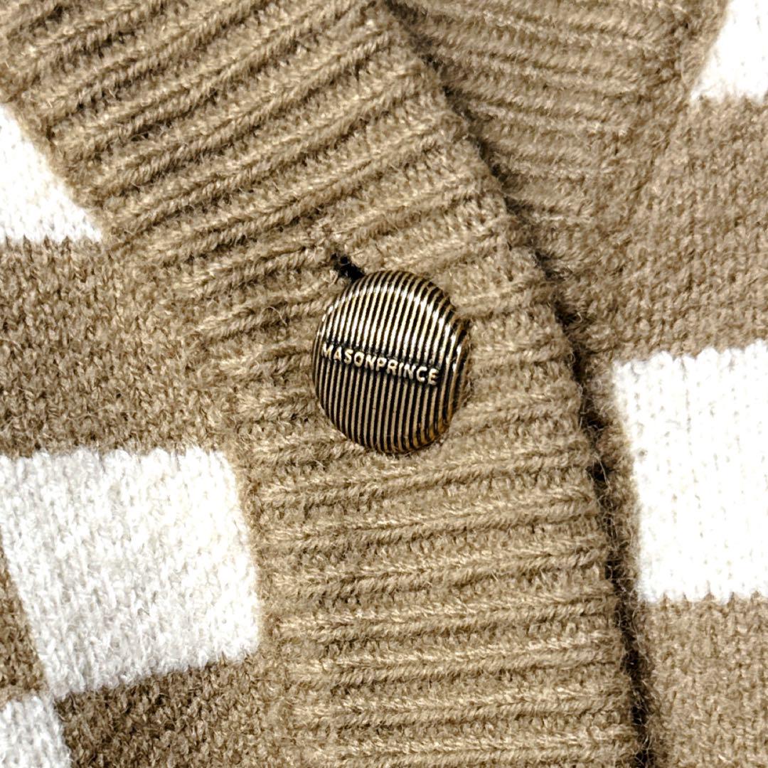 This cardigan is a checkered print in a high quality, plush fabric in alternating neutral hues of tan and ivory. Front button closure, with "MASONPRINCE" on each button. V-neck style, with an oversized fit. Tagged as a "size 1" or small - but extremely oversized and fits like a regular large.