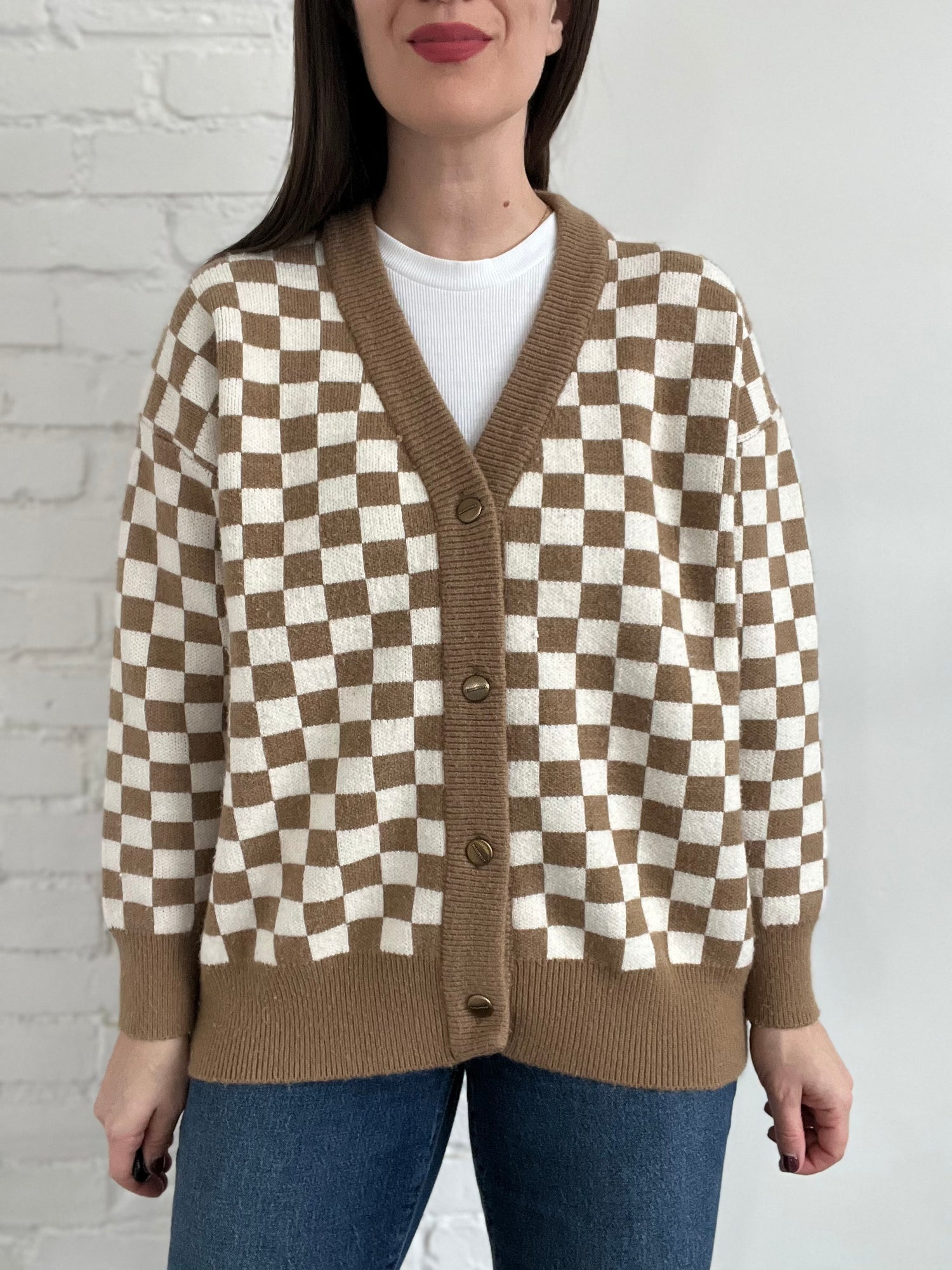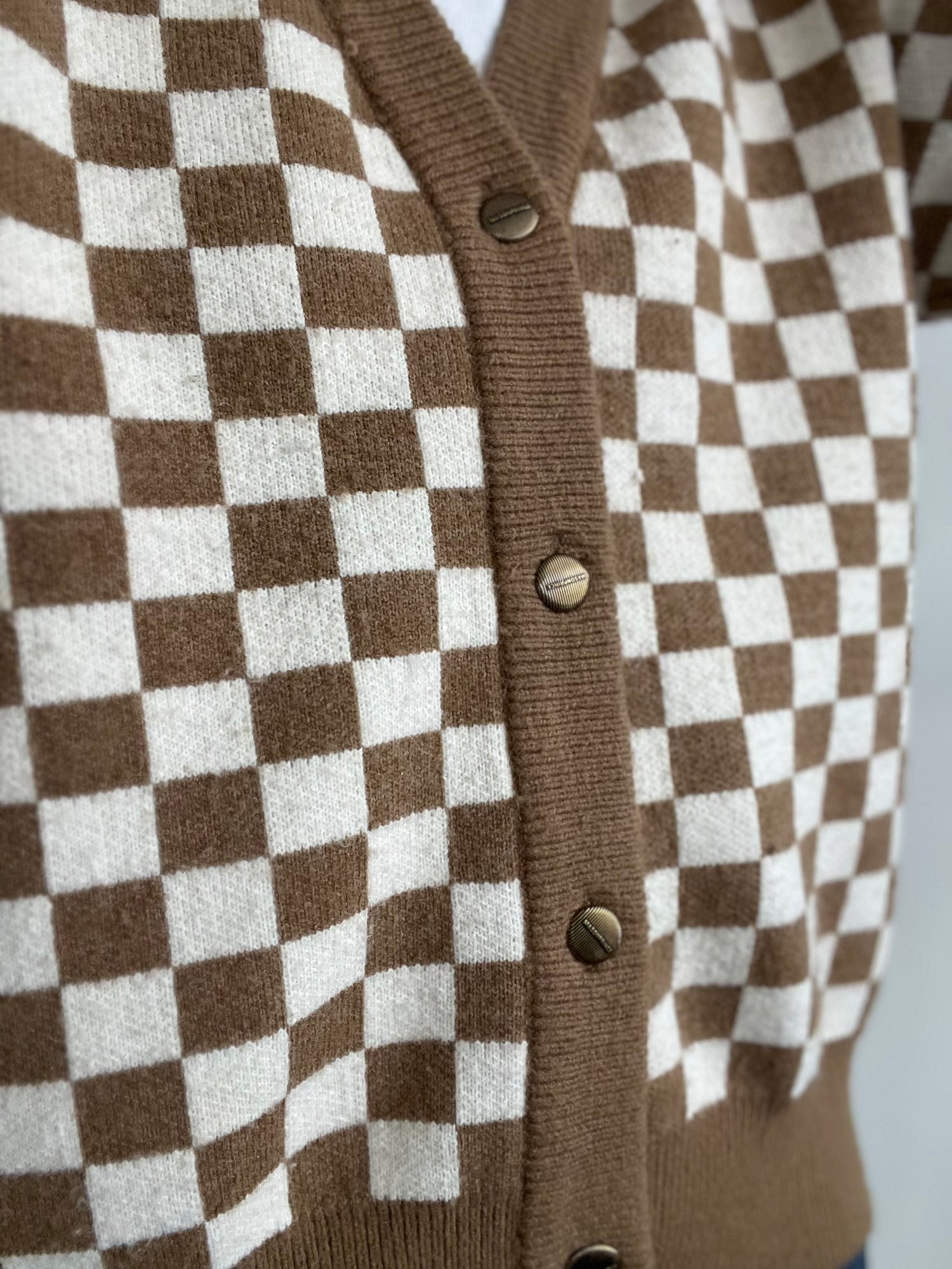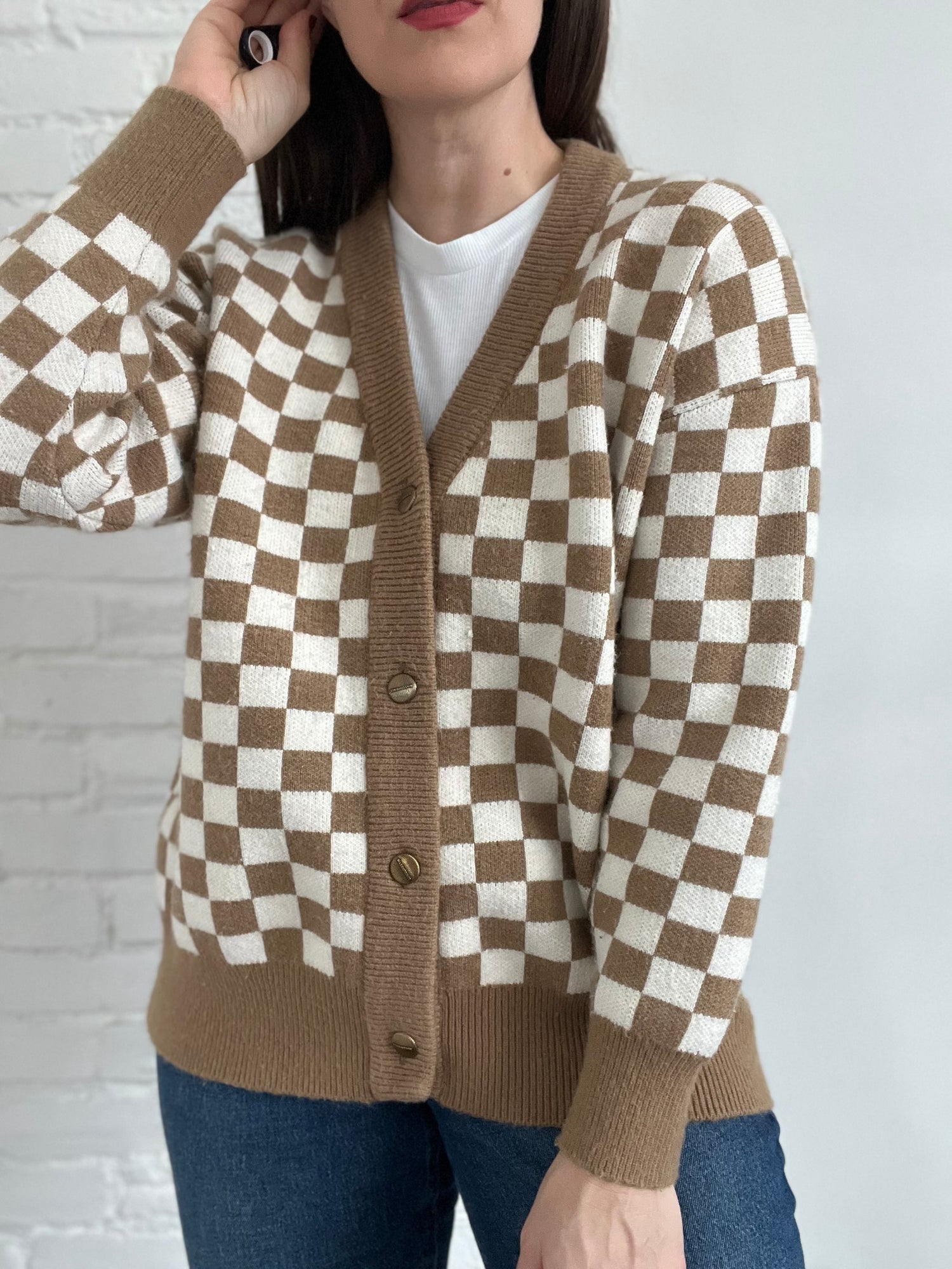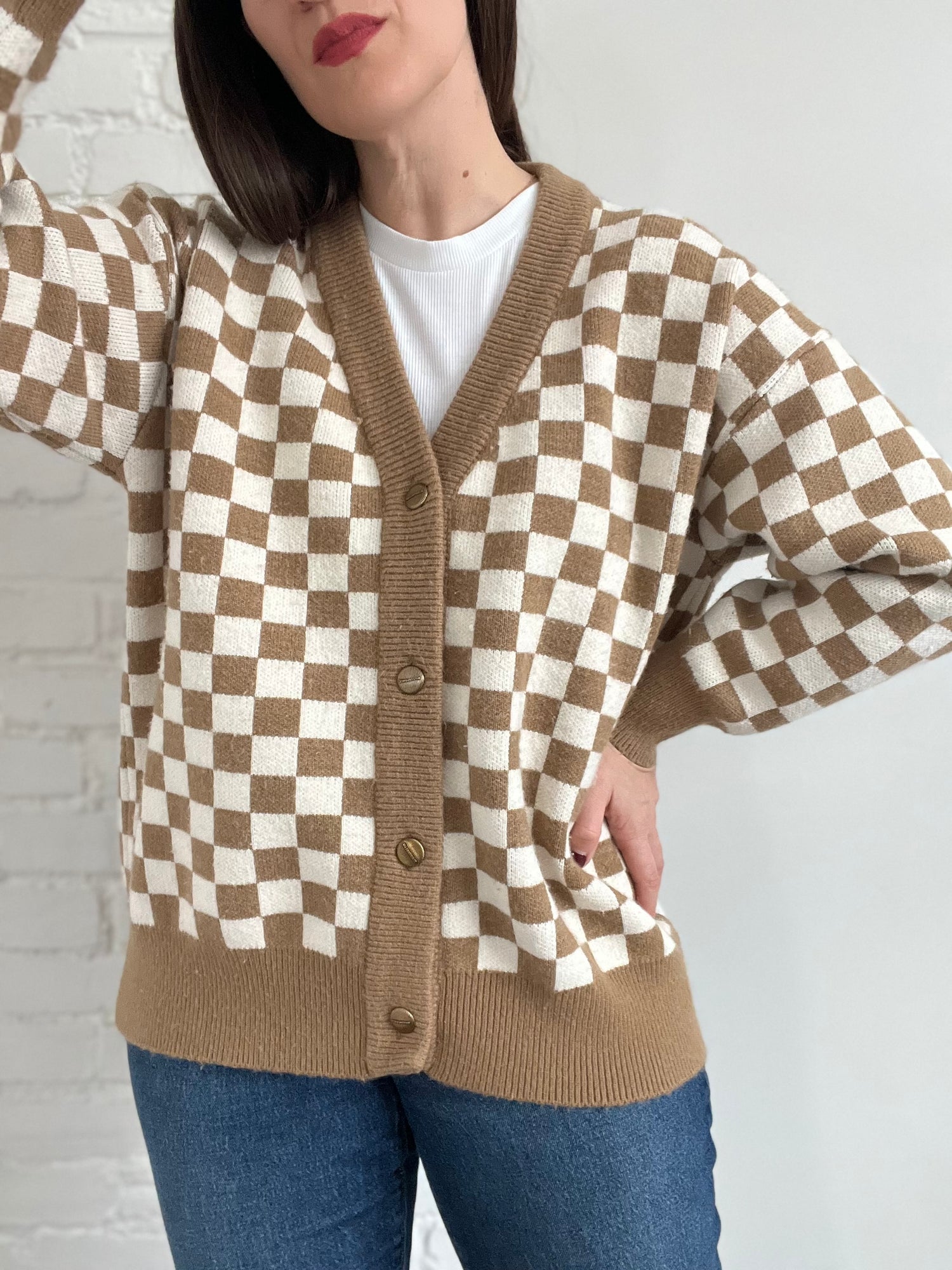 This cardigan is a checkered print in a high quality, plush fabric in alternating neutral hues of tan and ivory. Front button closure, with "MASONPRINCE" on each button. V-neck style, with an oversized fit. Tagged as a "size 1" or small - but extremely oversized and fits like a regular large.