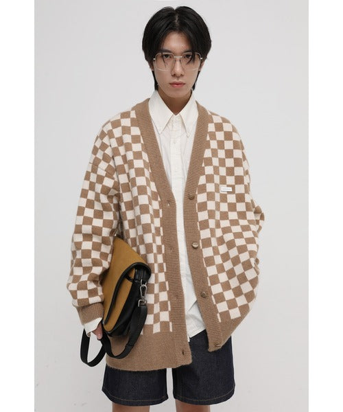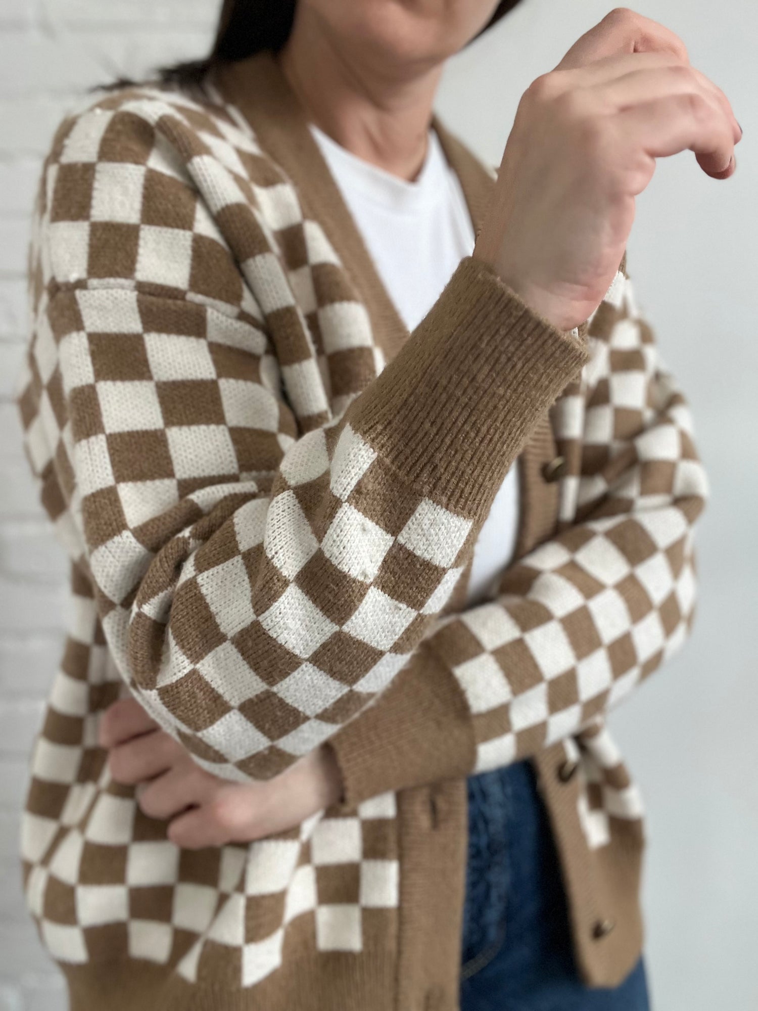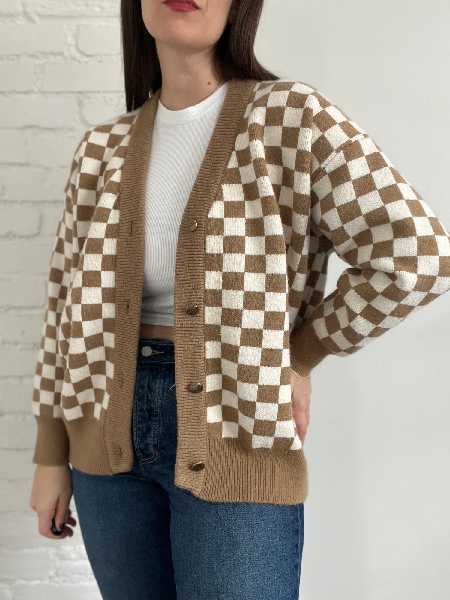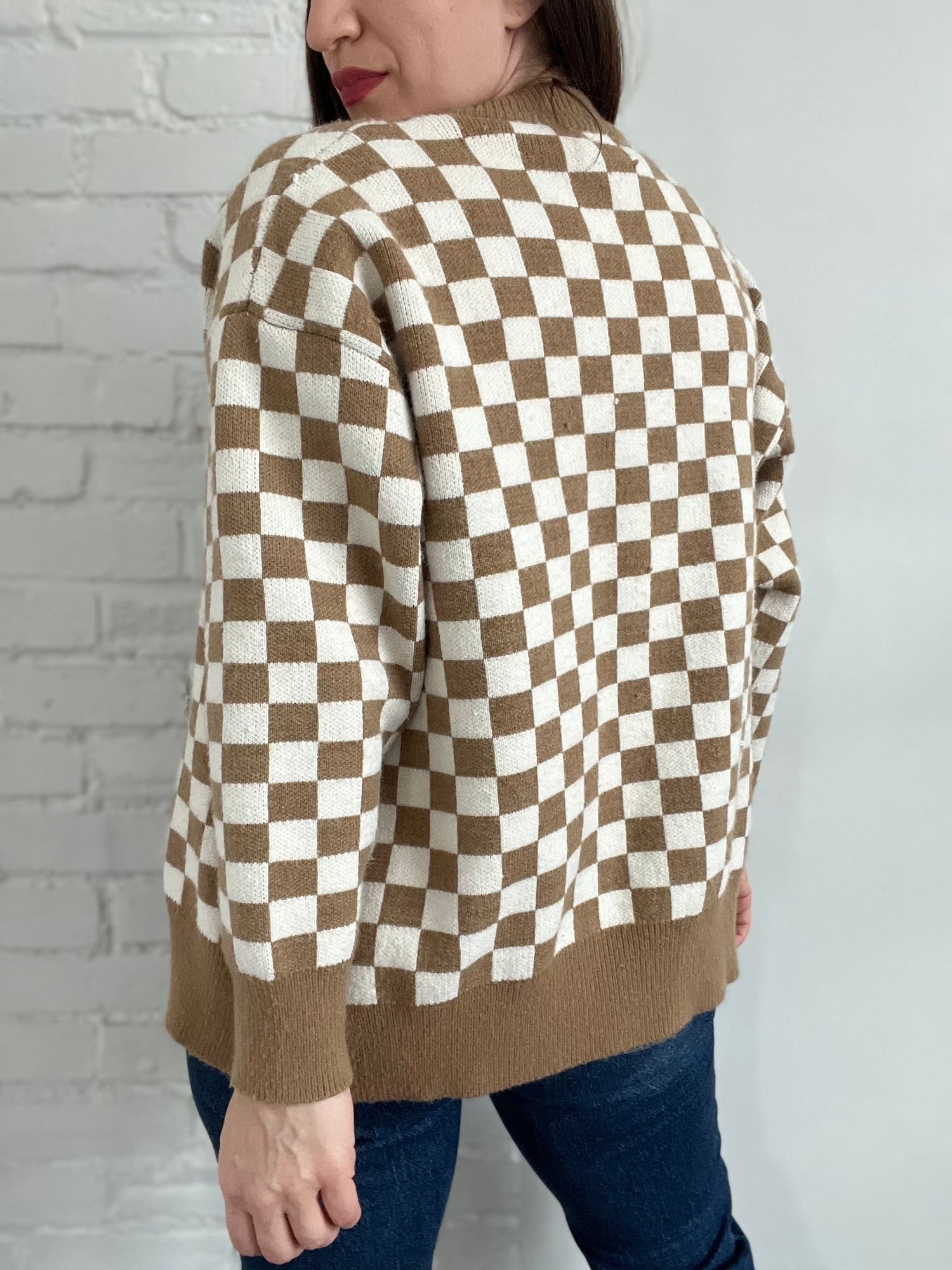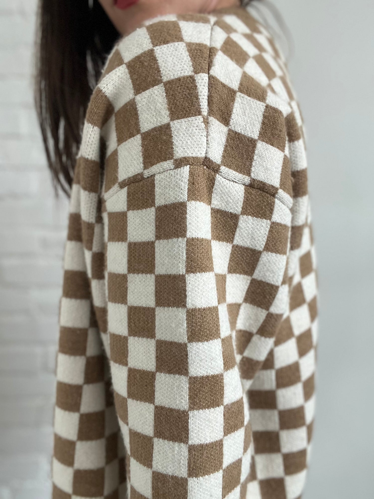 This cardigan is a checkered print in a high quality, plush fabric in alternating neutral hues of tan and ivory. Front button closure, with "MASONPRINCE" on each button. V-neck style, with an oversized fit. Tagged as a "size 1" or small - but extremely oversized and fits like a regular large.