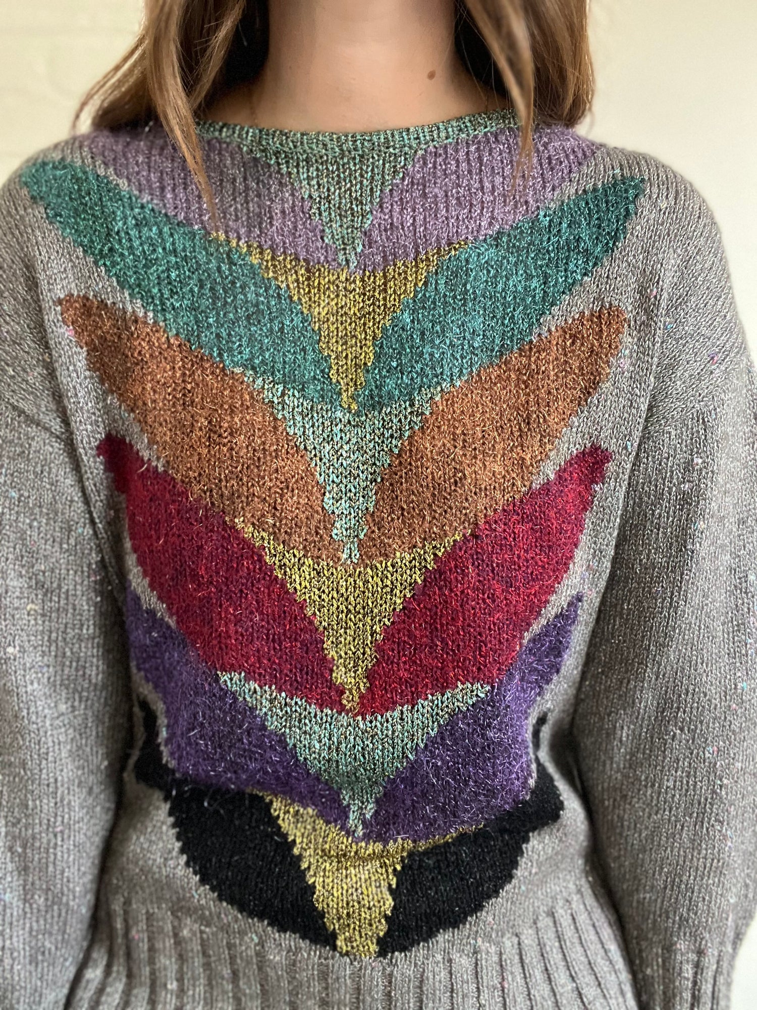 A stunning charcoal grey sweater, with notes of metallic peacocking across the front. Speckles of shine from top to bottom, with striking bold colours forming a vertical design. Teal, purple, copper, red and golds dance all over. Dropped shoulder, relaxed fit, and ribbed at the hem and cuffs with a high neckline. Mint condition.