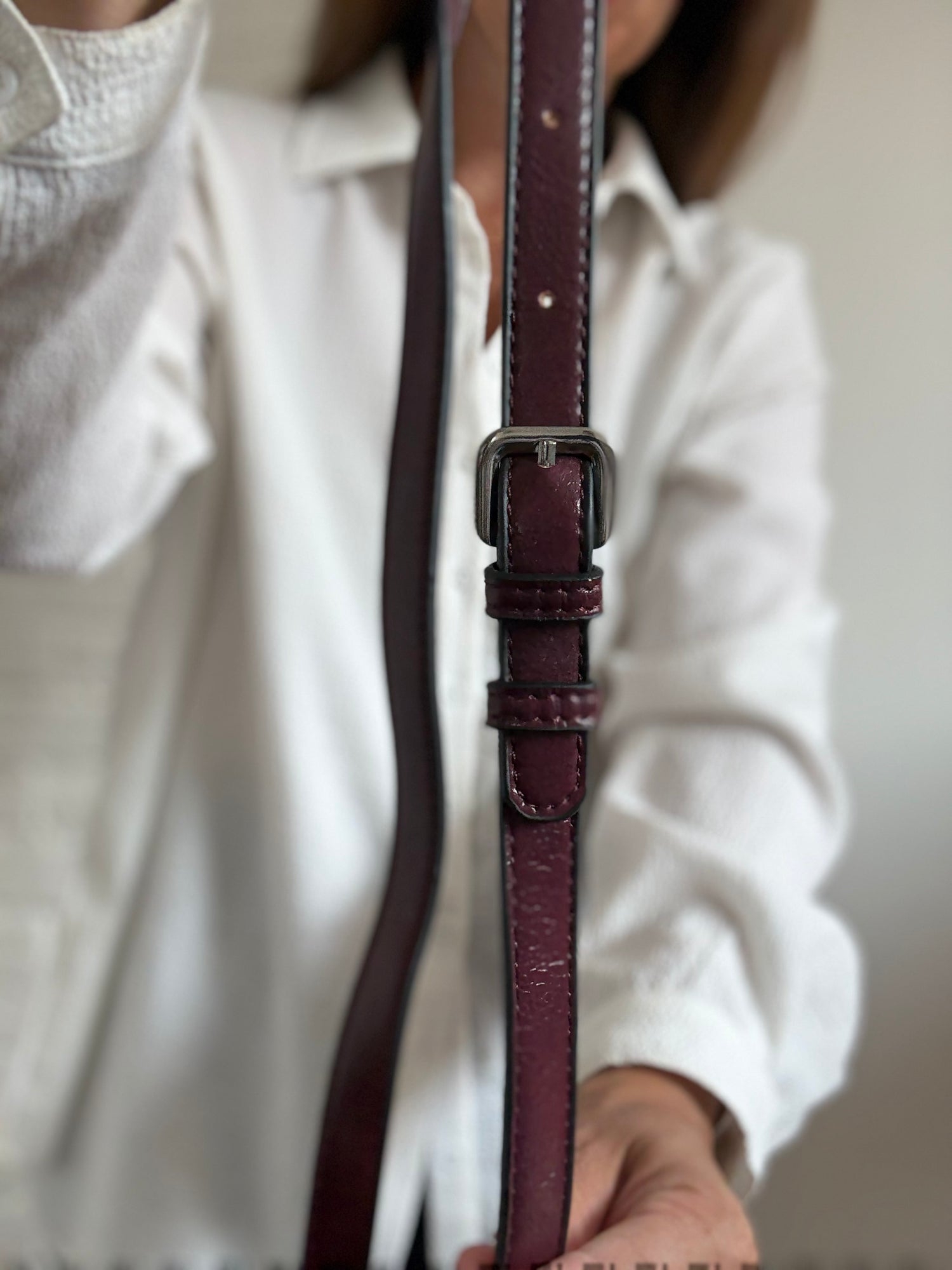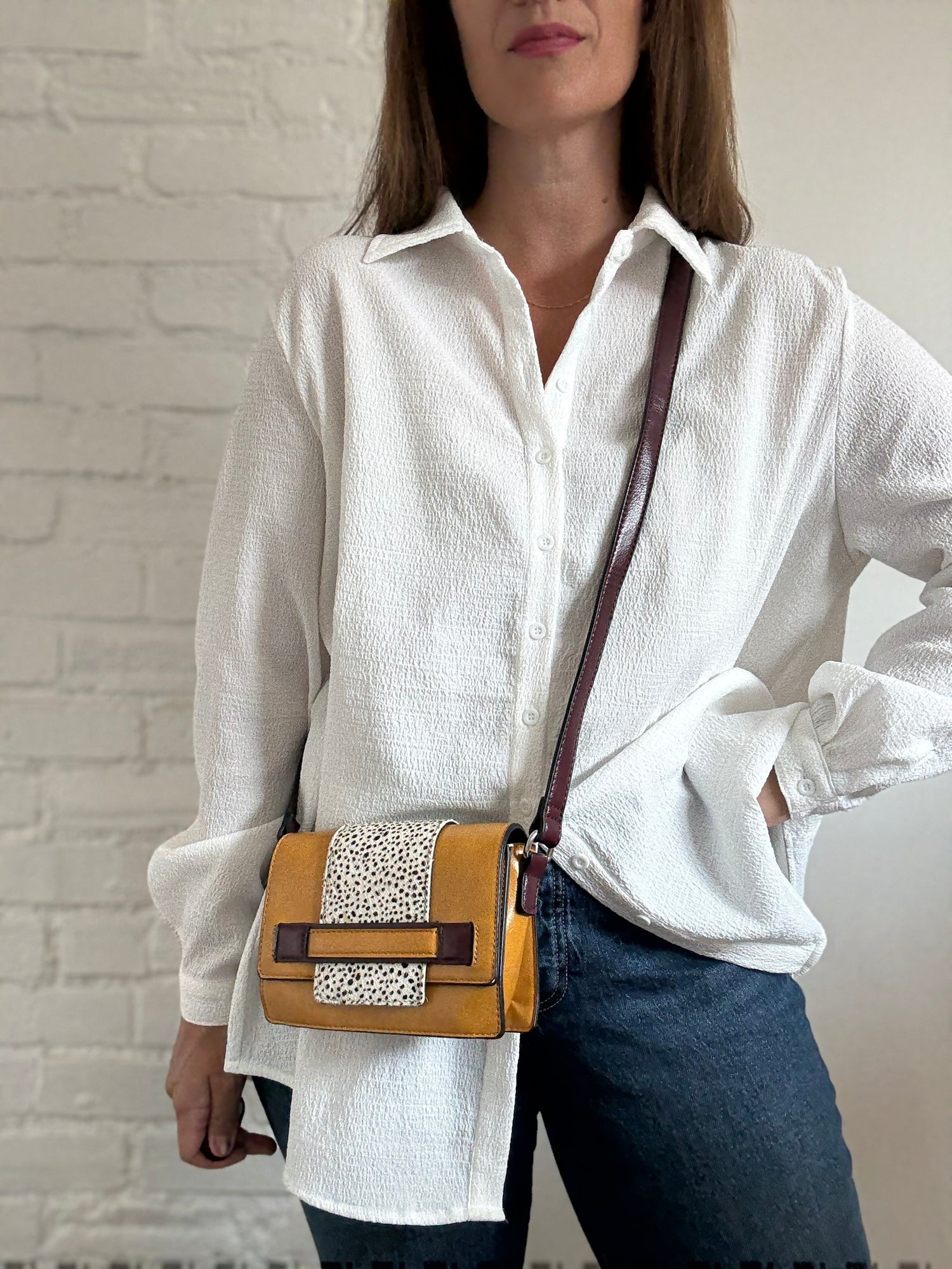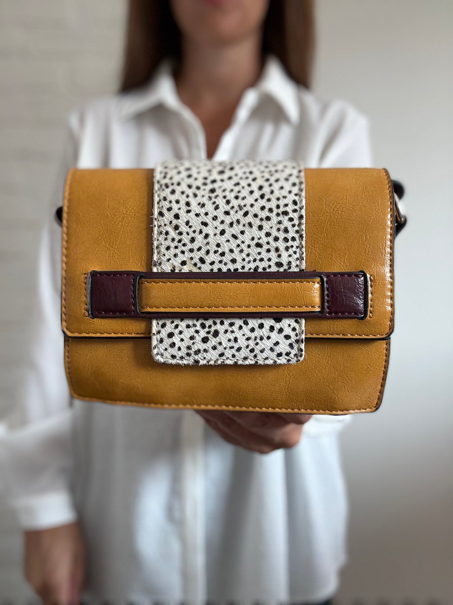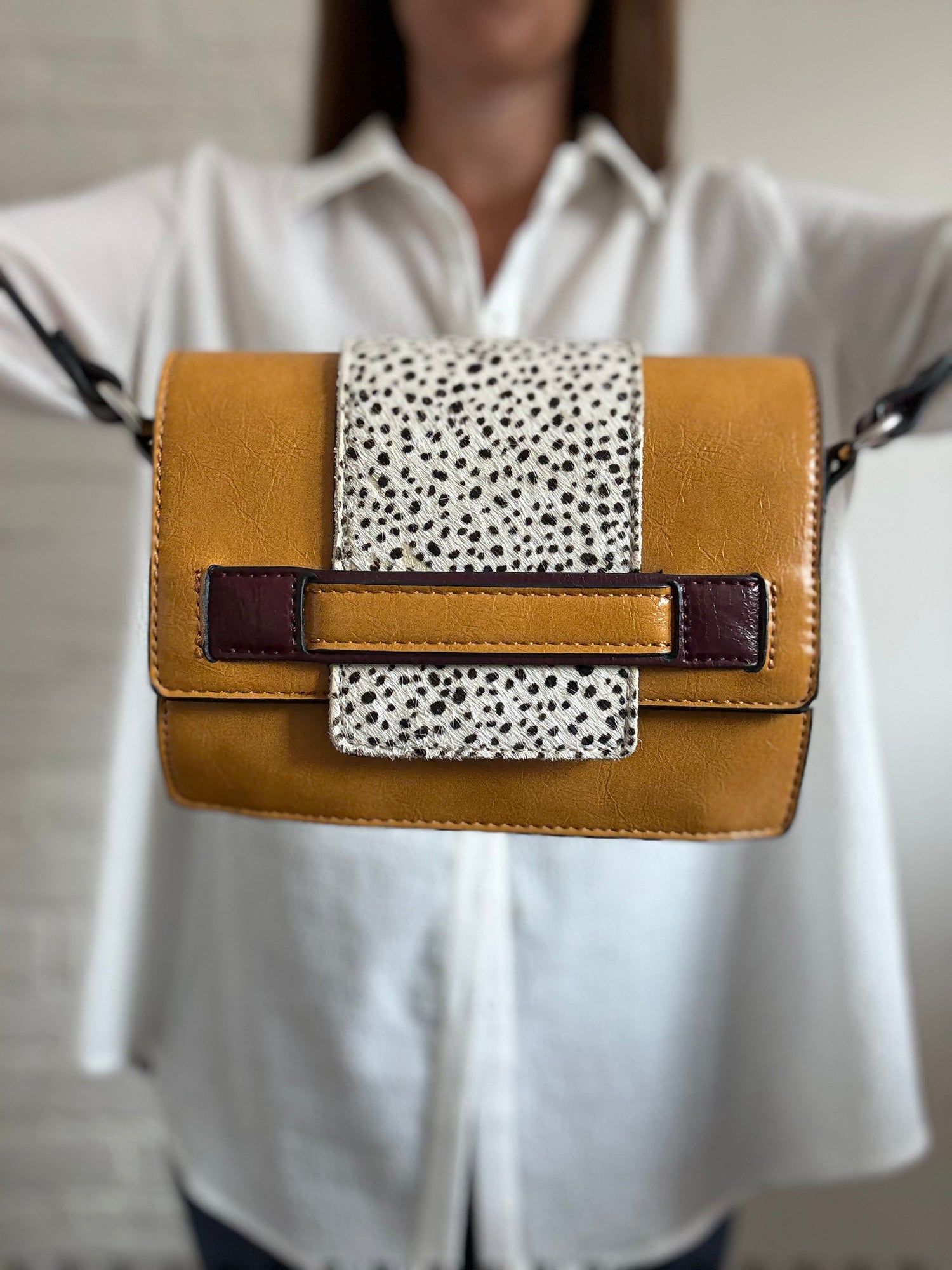 A faux-leather, mini crossbody purse in a mustard yellow, with fine pony hair in a polka-dot Dalmatian texture. Accented with burgundy across the purse, and a flap metal open/closure. Like brand new, never worn.