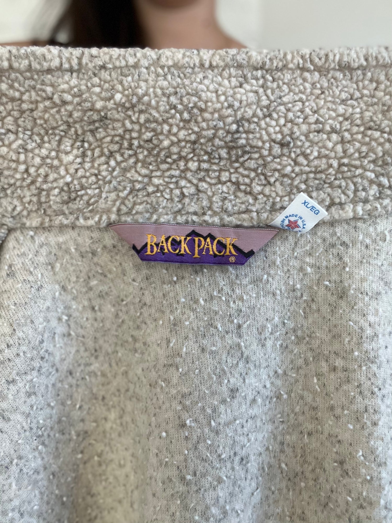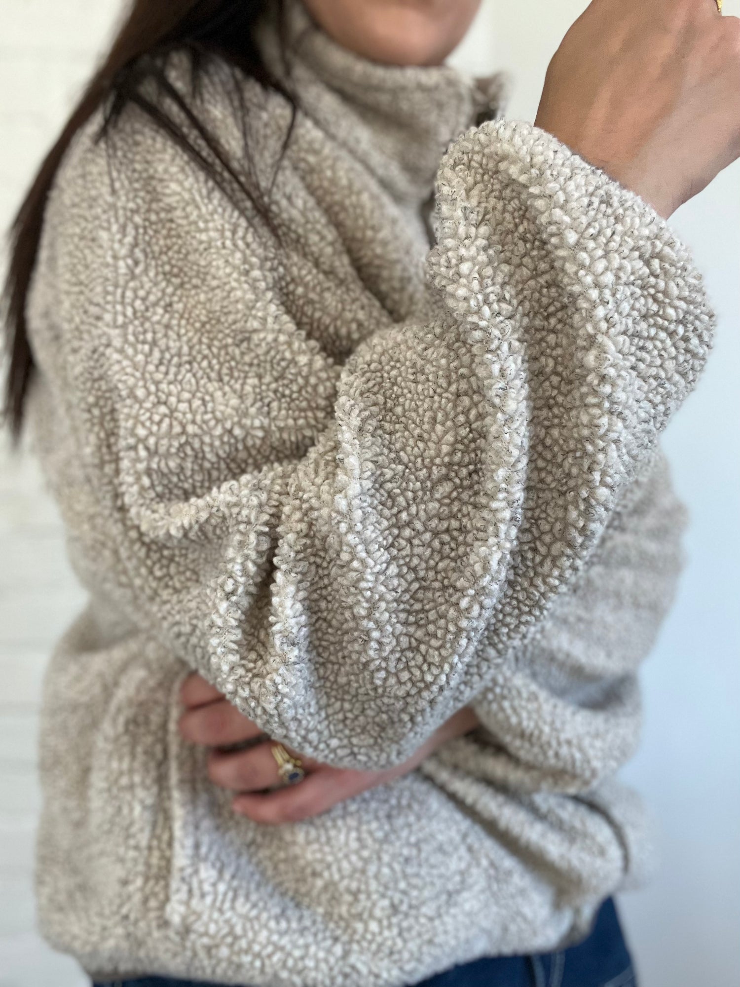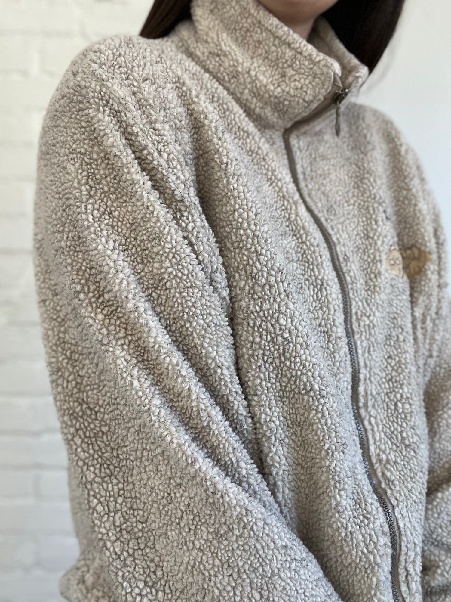 A speckled beige sherpa zip-up sweater, with an embroidered moose across the left chest. A bronze zipper, that pops the collar up the neck for an extra cozy wear. The embroidered moose patch is jumping over a mountain. Playful, warm and medium weighted for a perfect summer night style.