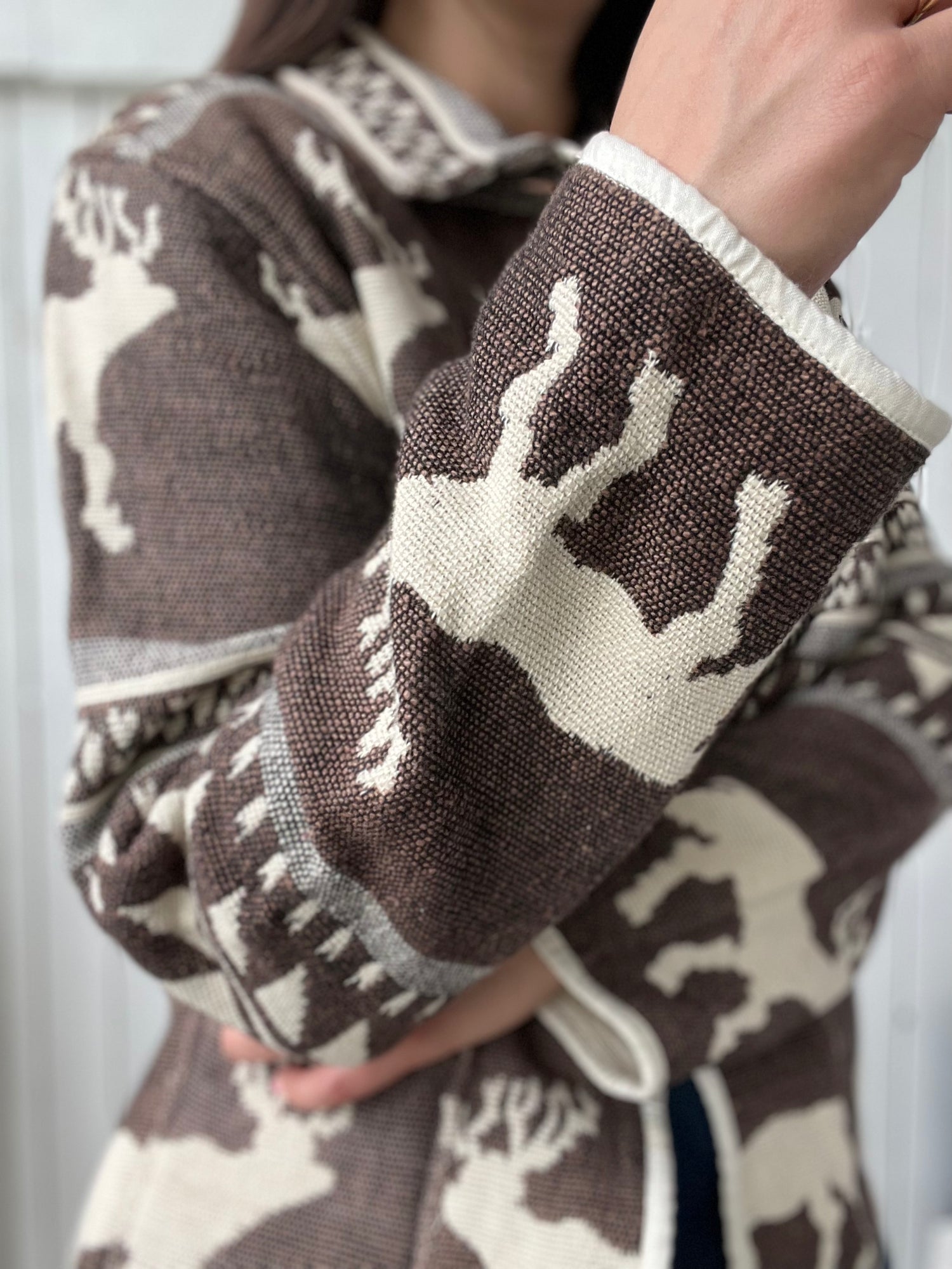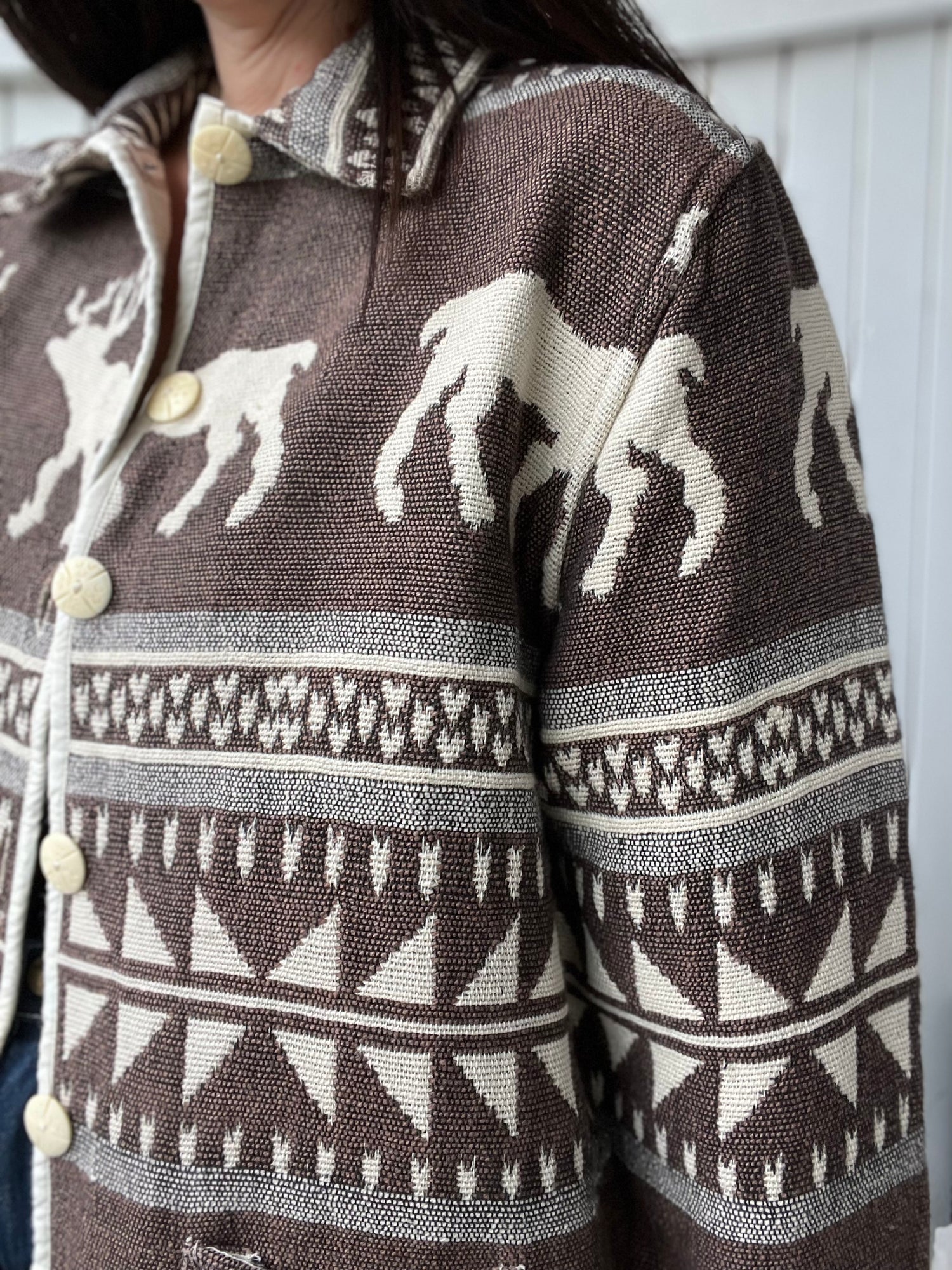 A stunning cotton tapestry jacket with moose crossing from front to back. Light chocolate browns and creams cover the stage, with vintage cream buttons up the front. The inside is the opposite colouring, looking great if worn open. Its a lightweight, comfortable cotton with major cottage vibes.