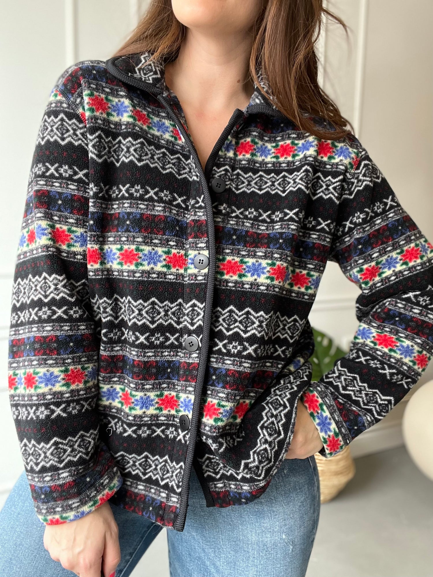 This one has me swooning. A unique button-up fleece jacket with a gorgeous black and white design. The red and blue stars add a splash of colour to piece. Button-up from top to bottom with a ribbed collar.